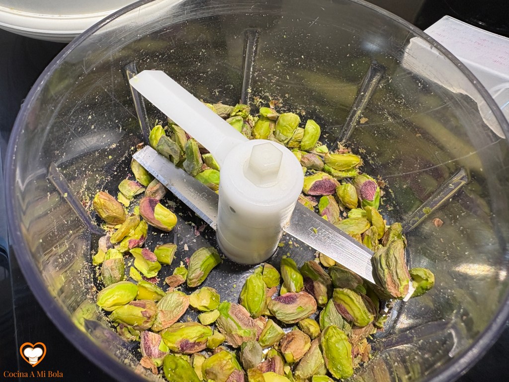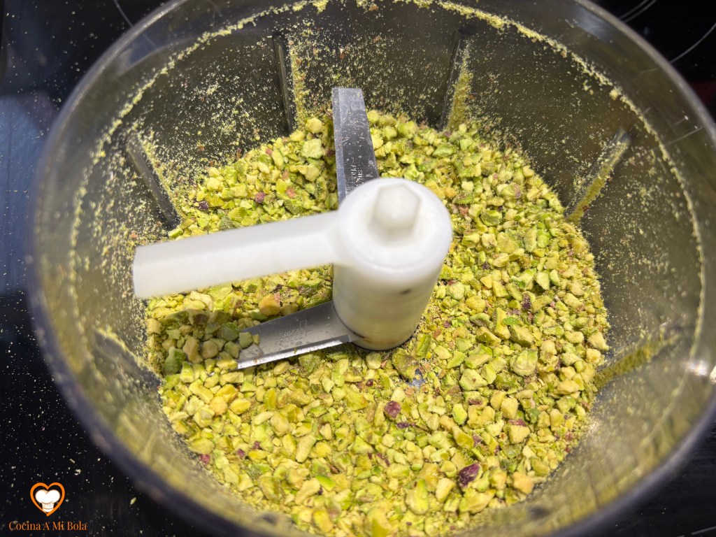 SÉPTIMO.- Quítale la cáscara a los pistachos y presiónalos para que la piel que no esté bien adherida se desprenda y podamos desecharla. Mete los pistachos en una picadora y tritúralos sin dejar que se pulvericen. Tienen que se trocitos pequeños, pero perceptibles. Mira la foto.