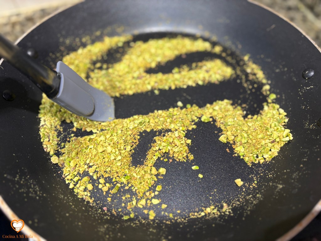 OCTAVO.- Pon una sartén a fuego medio bajo y extiende sobre ella el triturado de pistachos. Remueve constantemente porque sólo pretendemos tostarlos. Enseguida empezarás a percibir cómo sueltan su grasa con el calor. Remueve a menudo para que no se quemen y en cuanto veas que su color verde intenso se va oscureciendo un poco, tendiendo al marrón pero aún verde, sácalos a un plato y deja que se enfríen.