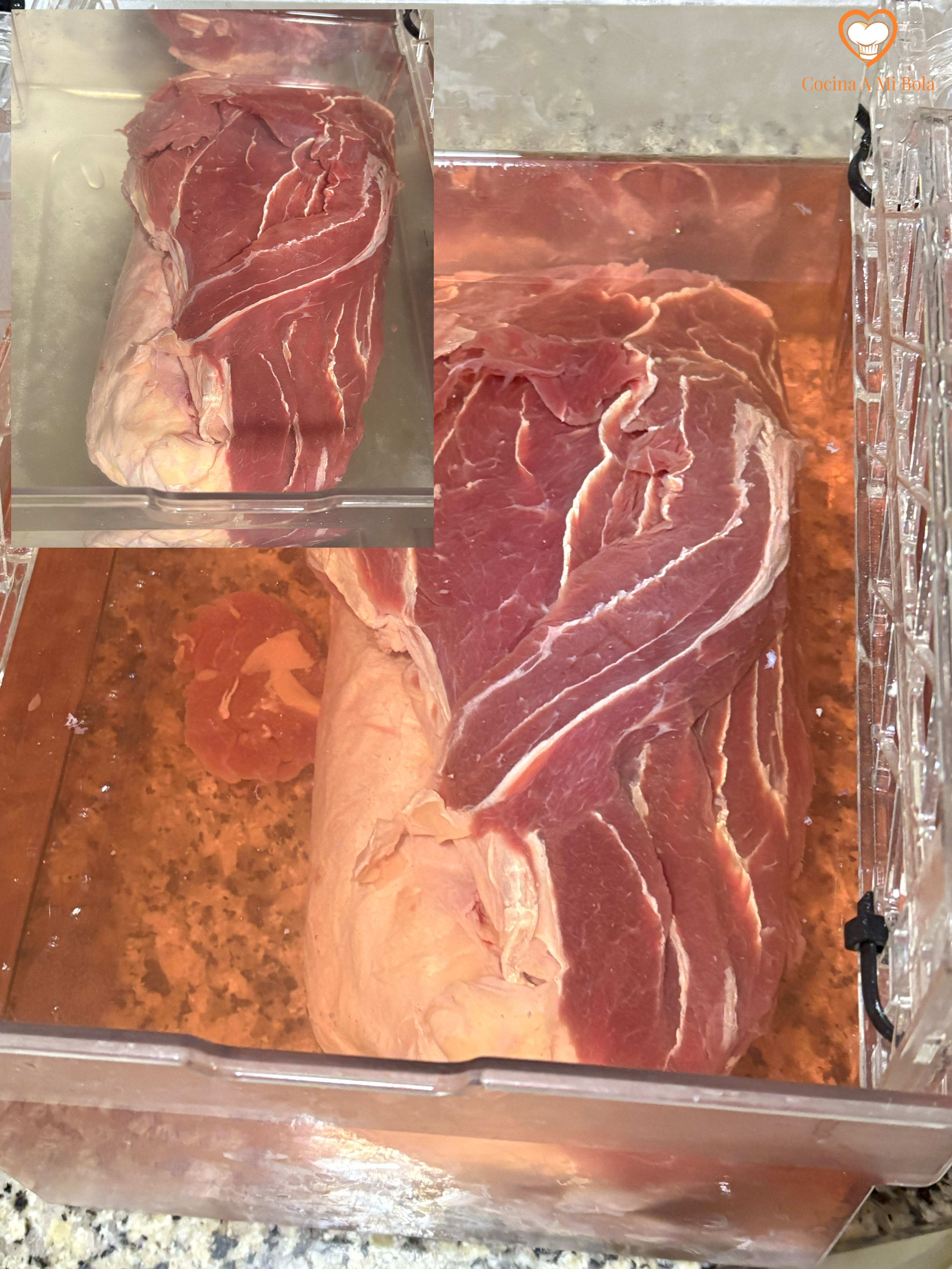 PRIMERO.-Sumergir la carne en una salmuera de proporción 10:1, es decir, una parte de sal por cada diez partes de agua. Y dado su volumen, necesitaremos de unos cinco a siete litros de agua para quedar cubierta, por lo que agregaremos de 500 a 700 grs de sal (según corresponda a su peso real) que removeremos durante un rato para que se disuelva hasta la saturación. Tendremos la carne en esta salmuera durante unos 90 minutos aproximadamente.