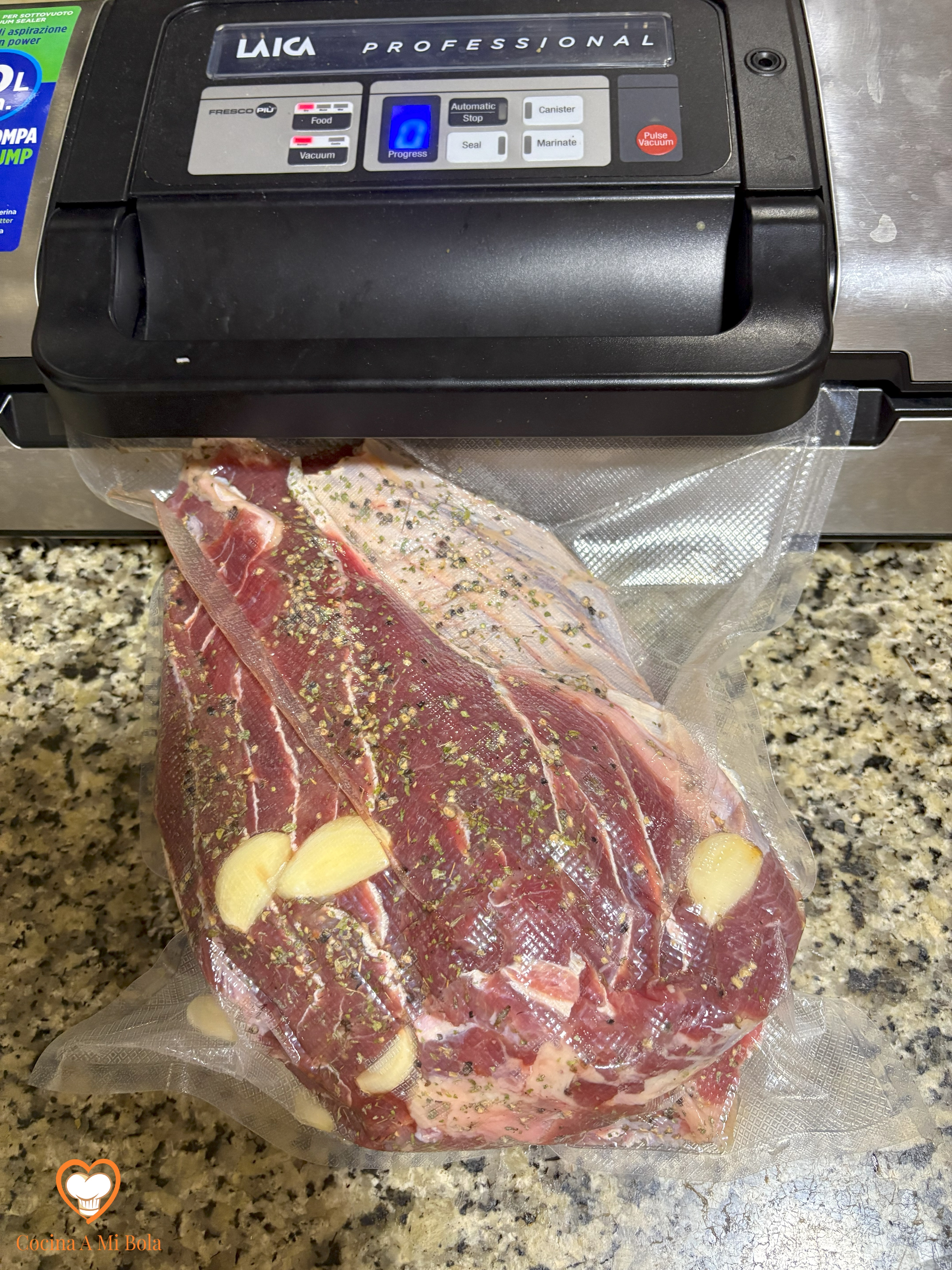 TERCERO.- Mete la pieza en una bolsa de vacío con una hoja de laurel y dos dientes de ajo aplastados usando la parte plana de la hoja del cuchillo. Cerrar al vacío.