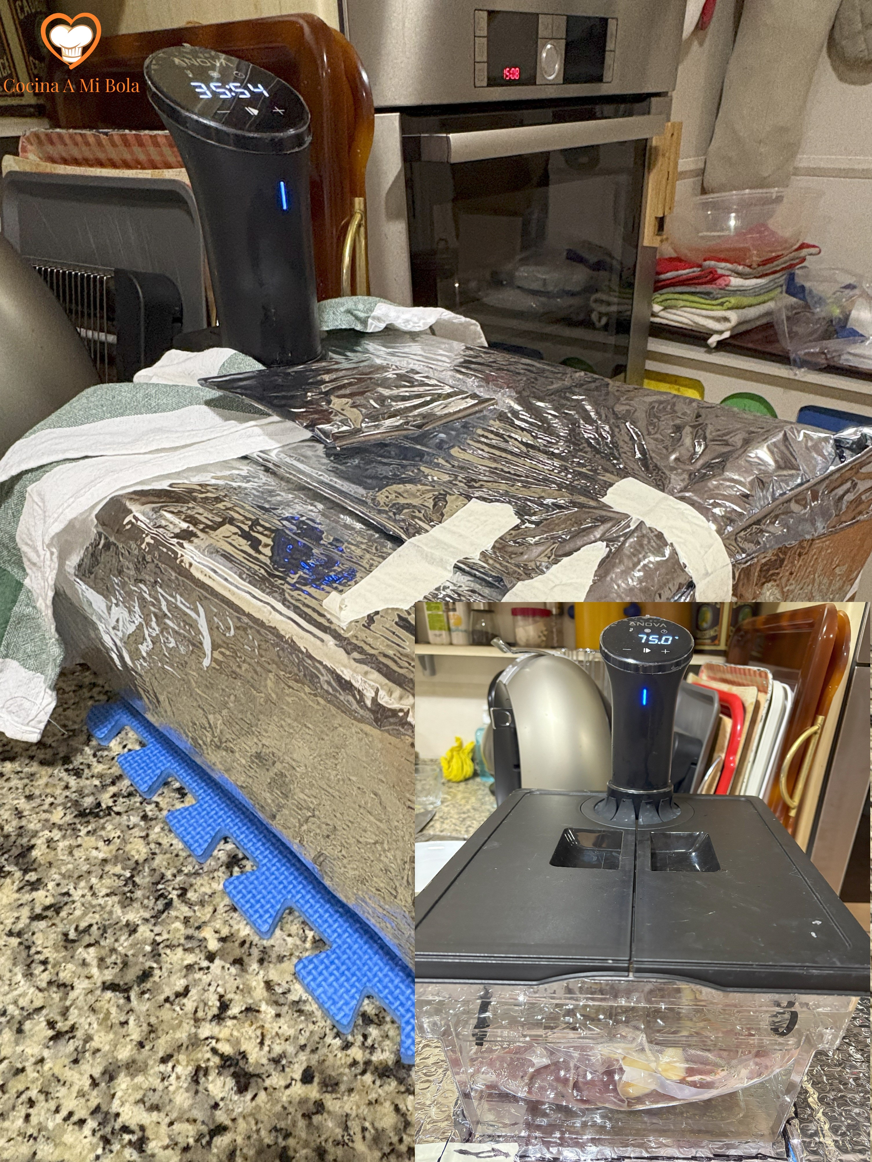 CUARTO.- Colocar el roner (circulador de calor) en el recipiente lleno de agua y conectarlo programado a 75ºC durante 36 horas. Cuando alcance la temperatura señalada, sumergir la bolsa con la carne y tapar. Aunque este aparato no requiere de una gran potencia eléctrica, es importante envolver el recipiente en algún tipo de termoaislante de forma que tengamos la pérdida mínima de calor durante el proceso, lo que repercutirá en un ahorro importante de consumo eléctrico.