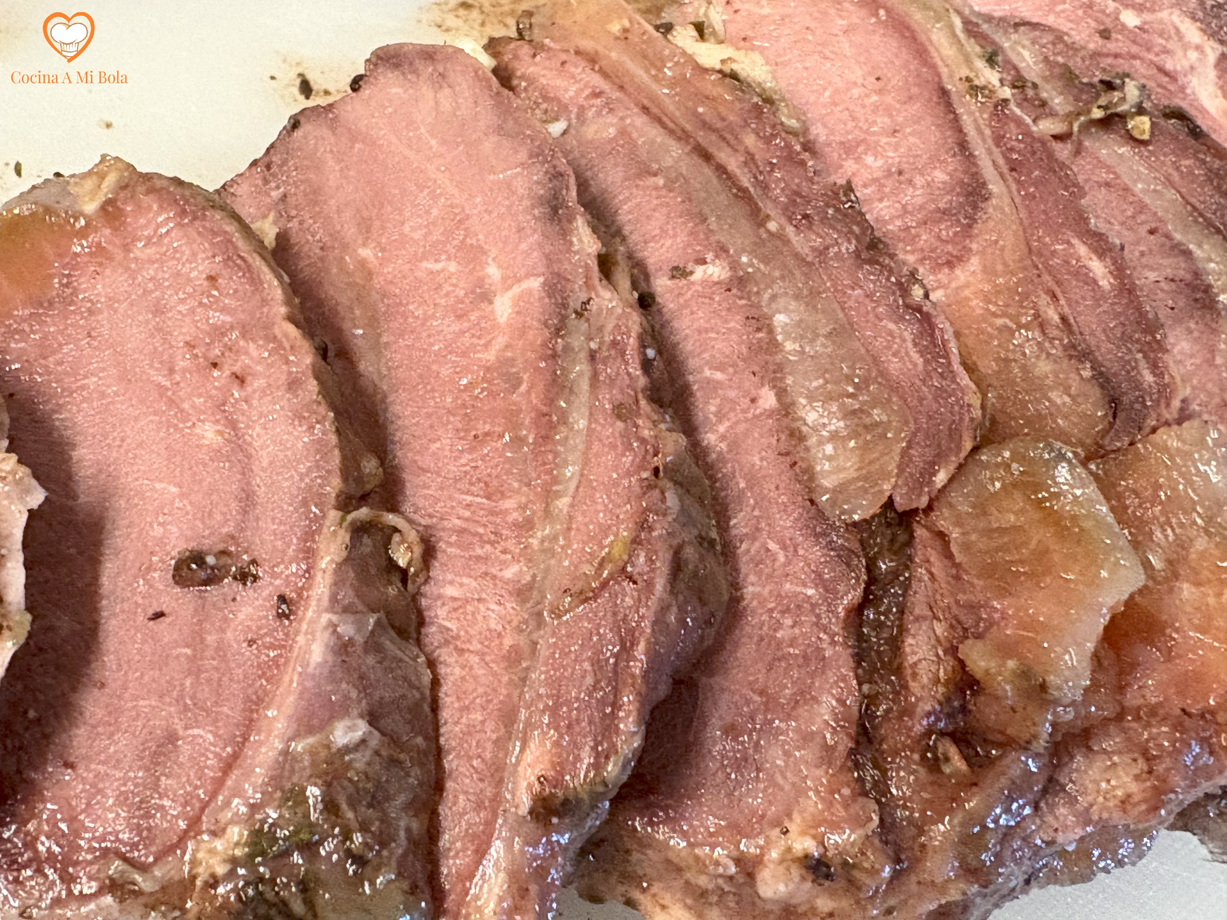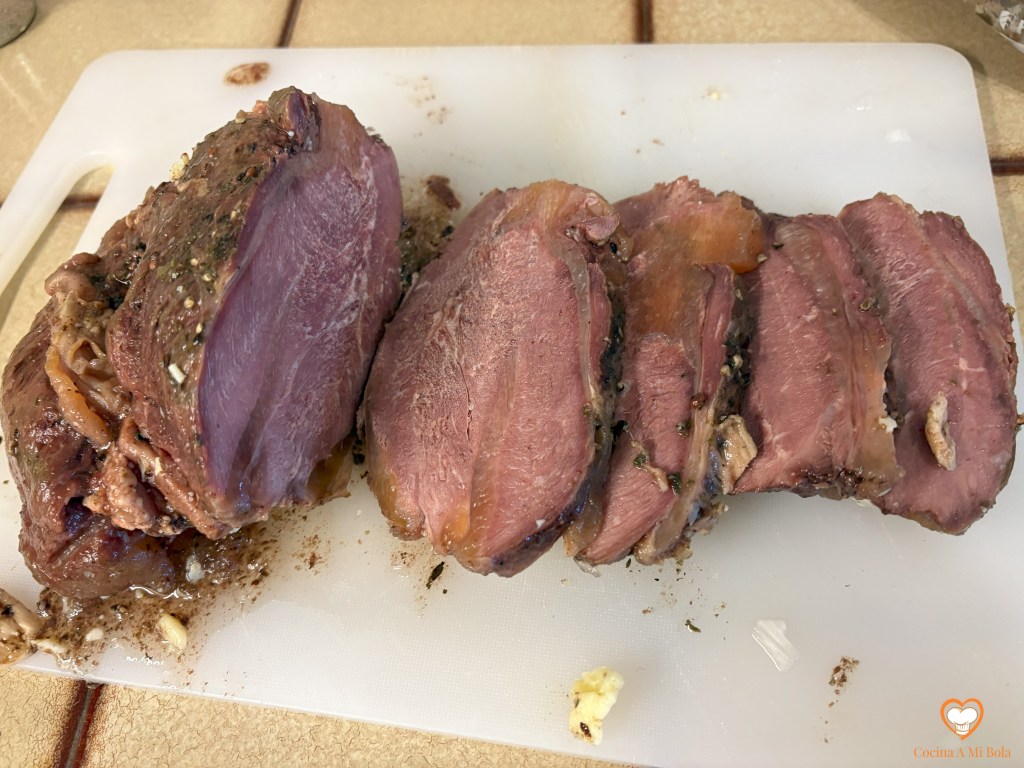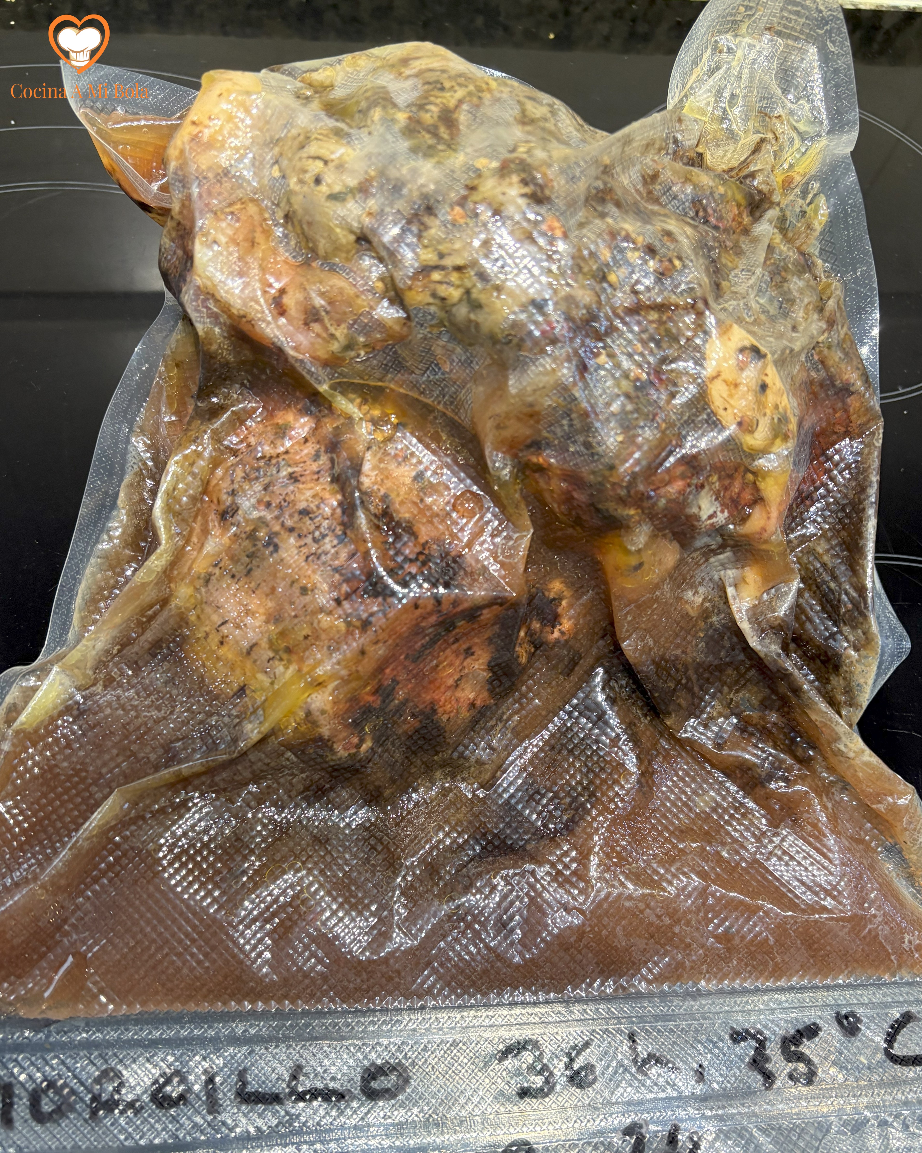 Si, por el contrario, vamos a consumirlo ya, lo sacamos del agua caliente para que vaya templando antes de poder lonchearlo. Y mientras tanto, preparamos la salsa y la guarnición. Bien es cierto que, si ya tenías previsto consumirlo al terminar la cocción, puedes empezar con la salsa una horilla antes de cumplirse las 36 horas.
