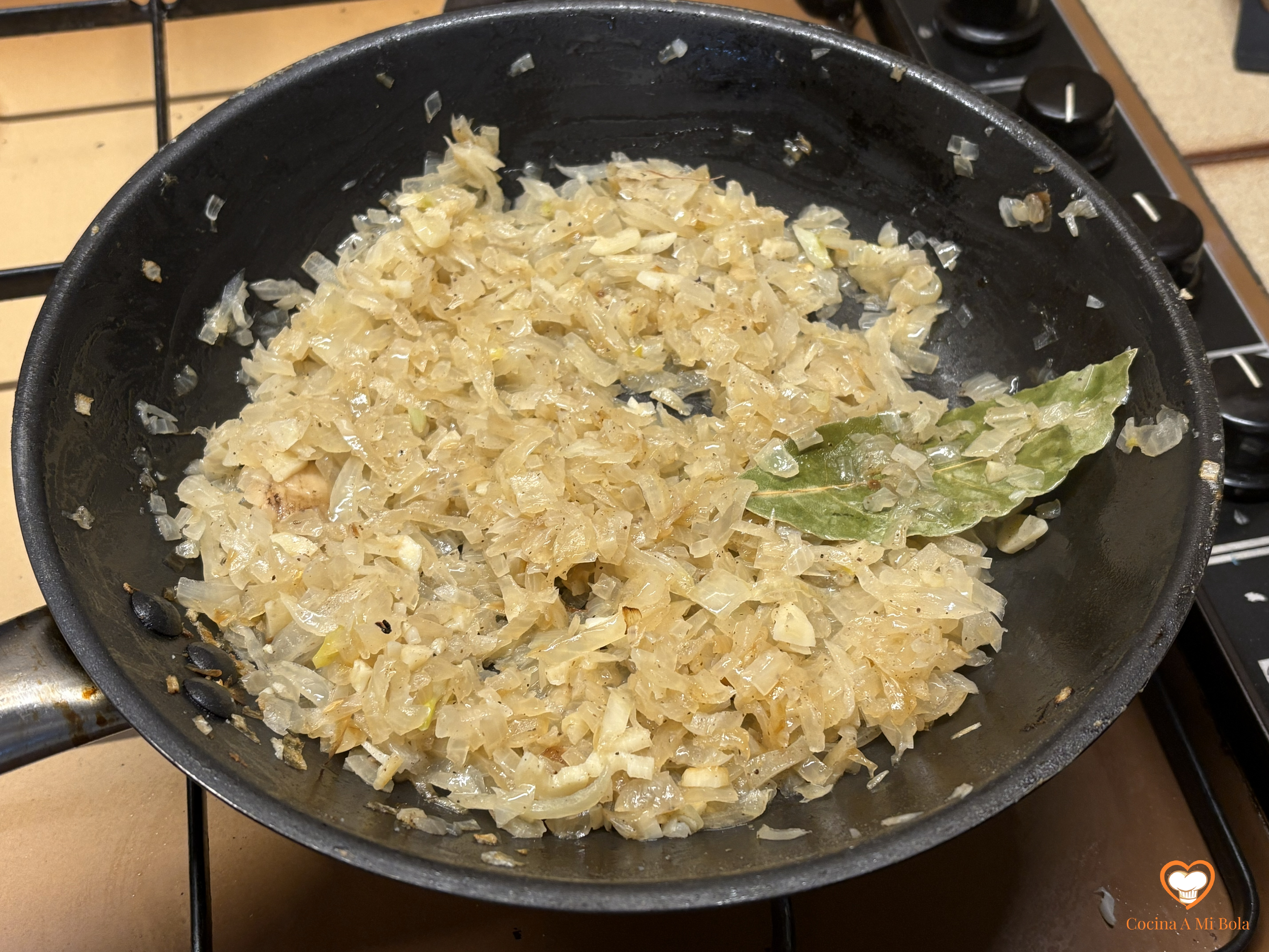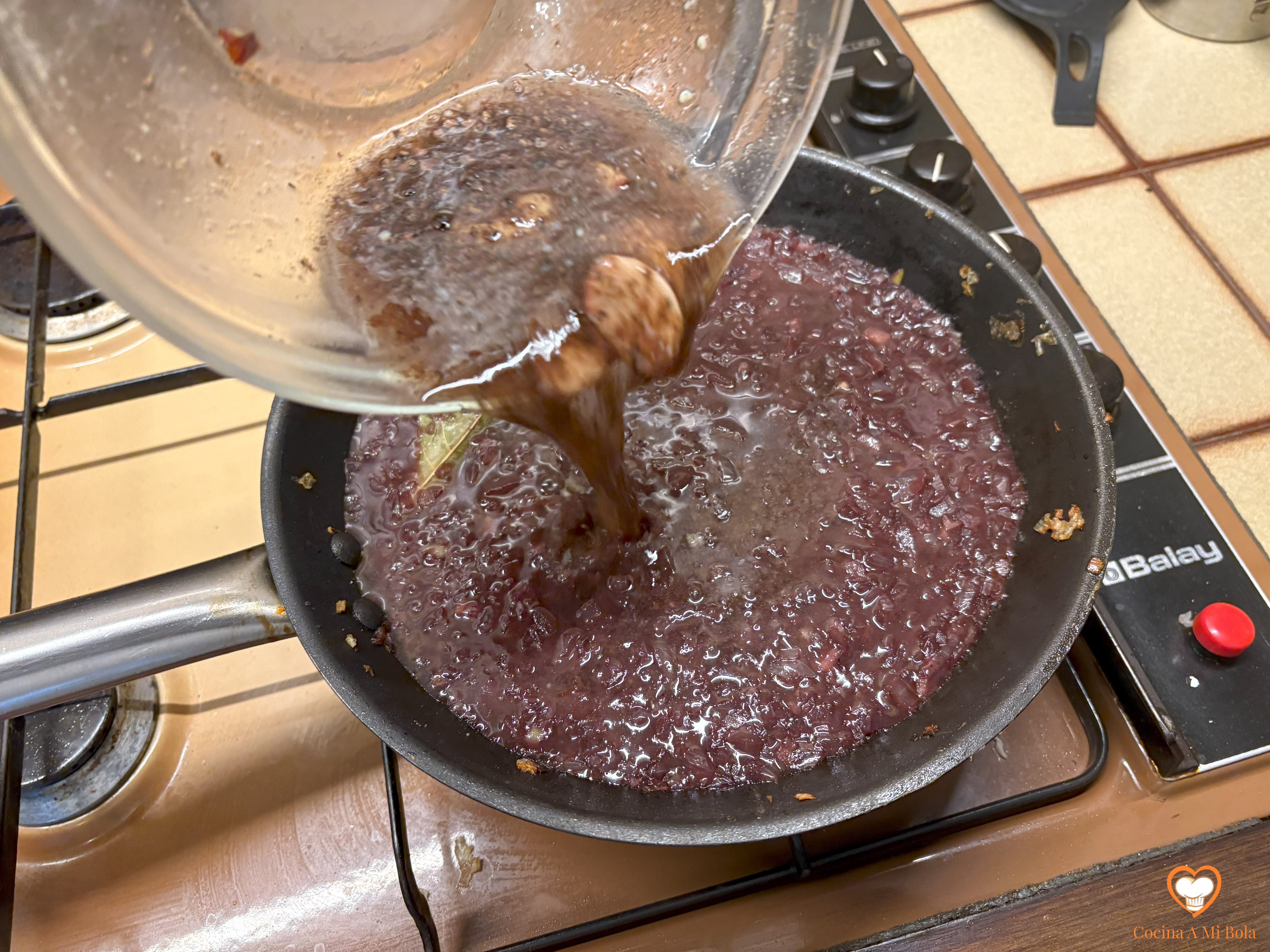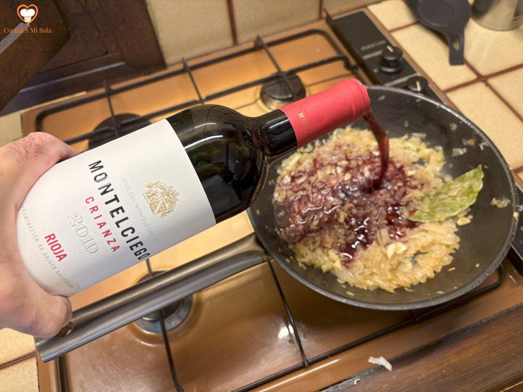 SÉPTIMO.- Cuando la cebolla empiece a estar tierna, sube otra vez el calor, agrega el vino, remueve y deja que evapore el alcohol al tiempo que va reduciendo, por supuesto, sin tapar.