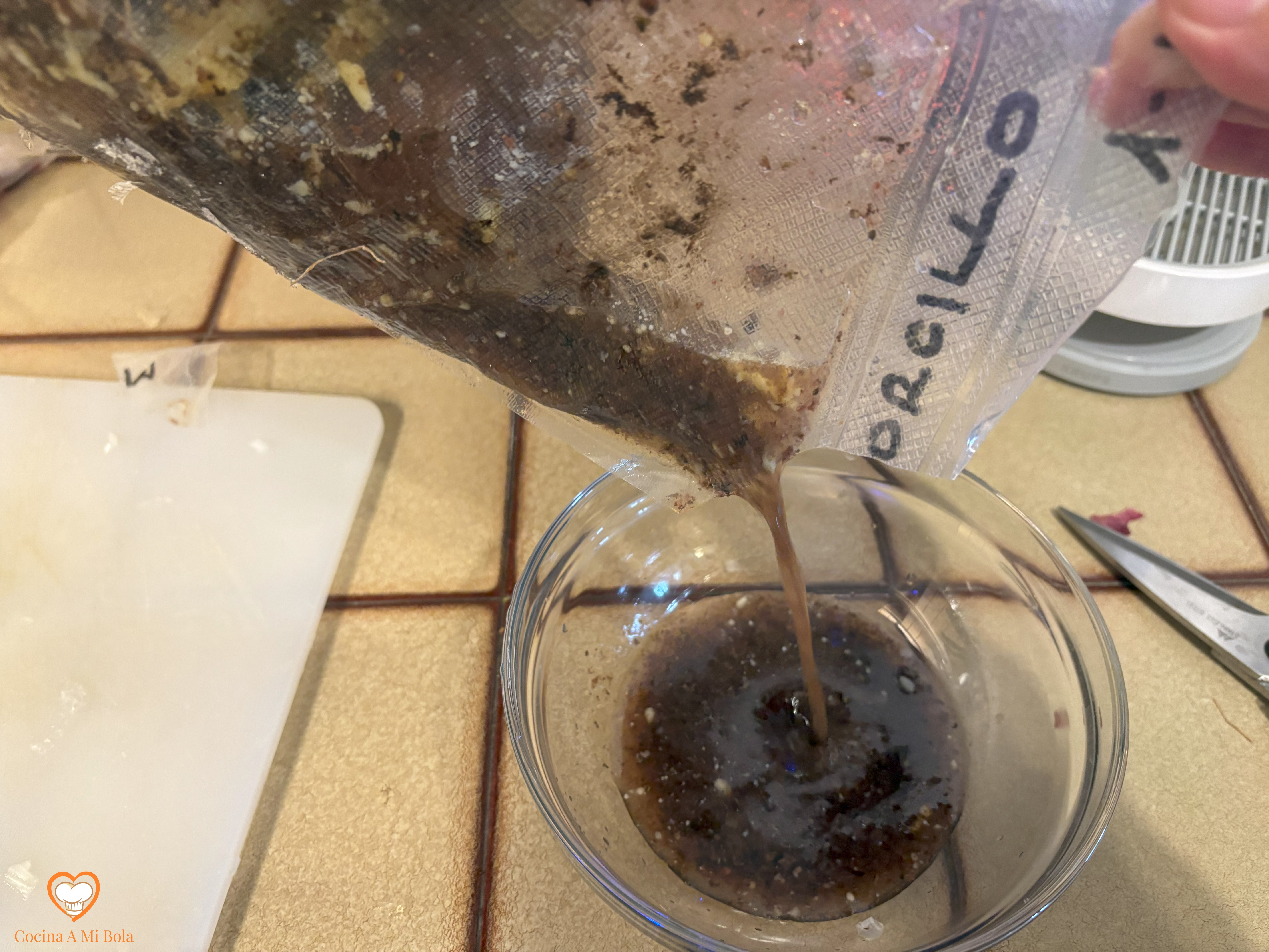 OCTAVO.- Al cabo de unos 5 minutos, toma la bolsa con la carne; córtale las dos esquinas de un extremo y vierte el jugo en la cazuela. Como verás, dado que lo embolsamos en seco, el 100% de ese líquido ha salido del morcillo, así que ahí tenemos puro extracto de ternera. Luego abre del todo la bolsa, saca la carne para que temple mejor y echa a la cazuela el resto de jugo y los ajos que metimos dentro. Mezcla y, cuando recupere el hervor, baja el fuego al mínimo dejando que reduzca. Remueve de vez en cuando.