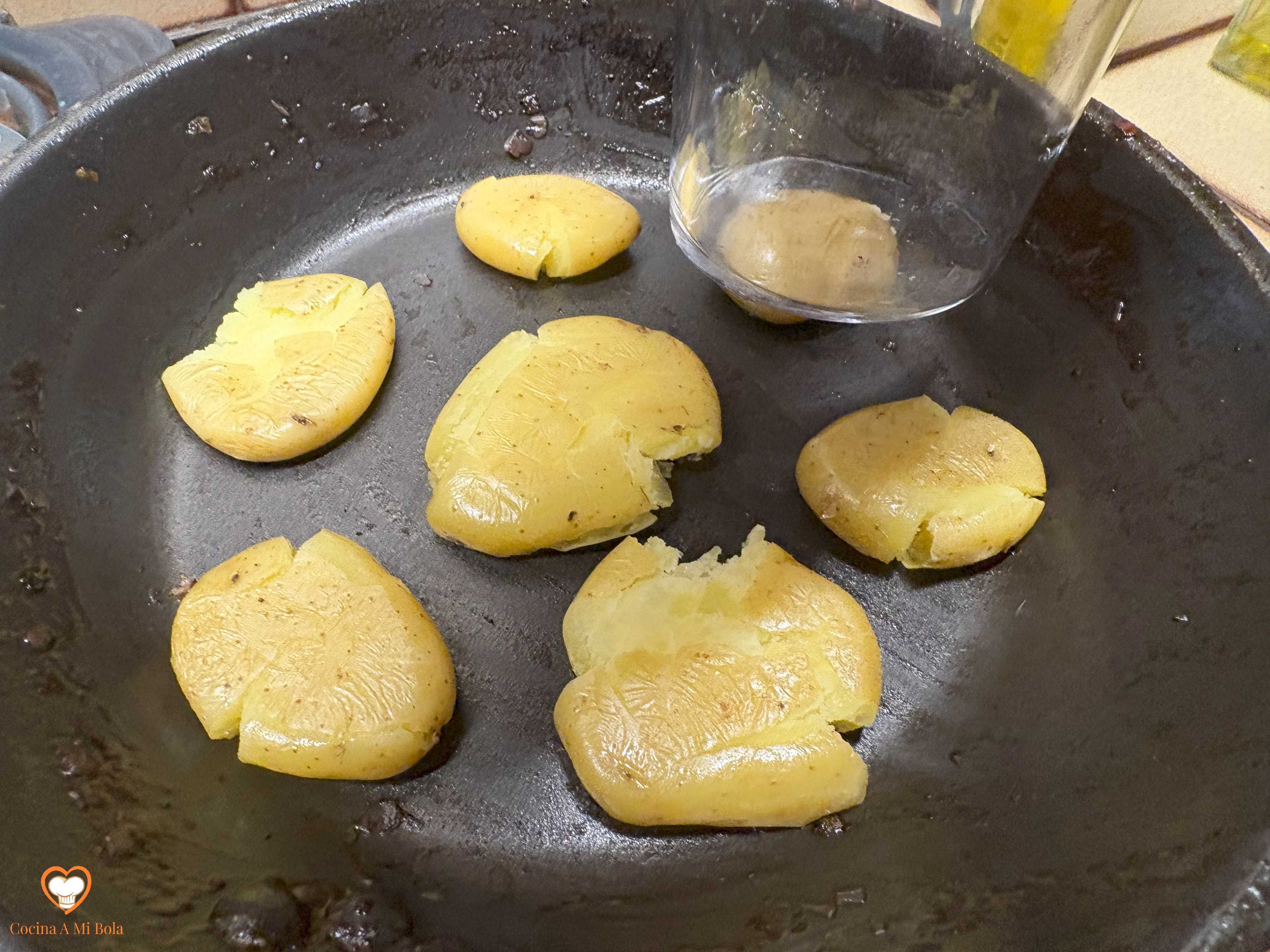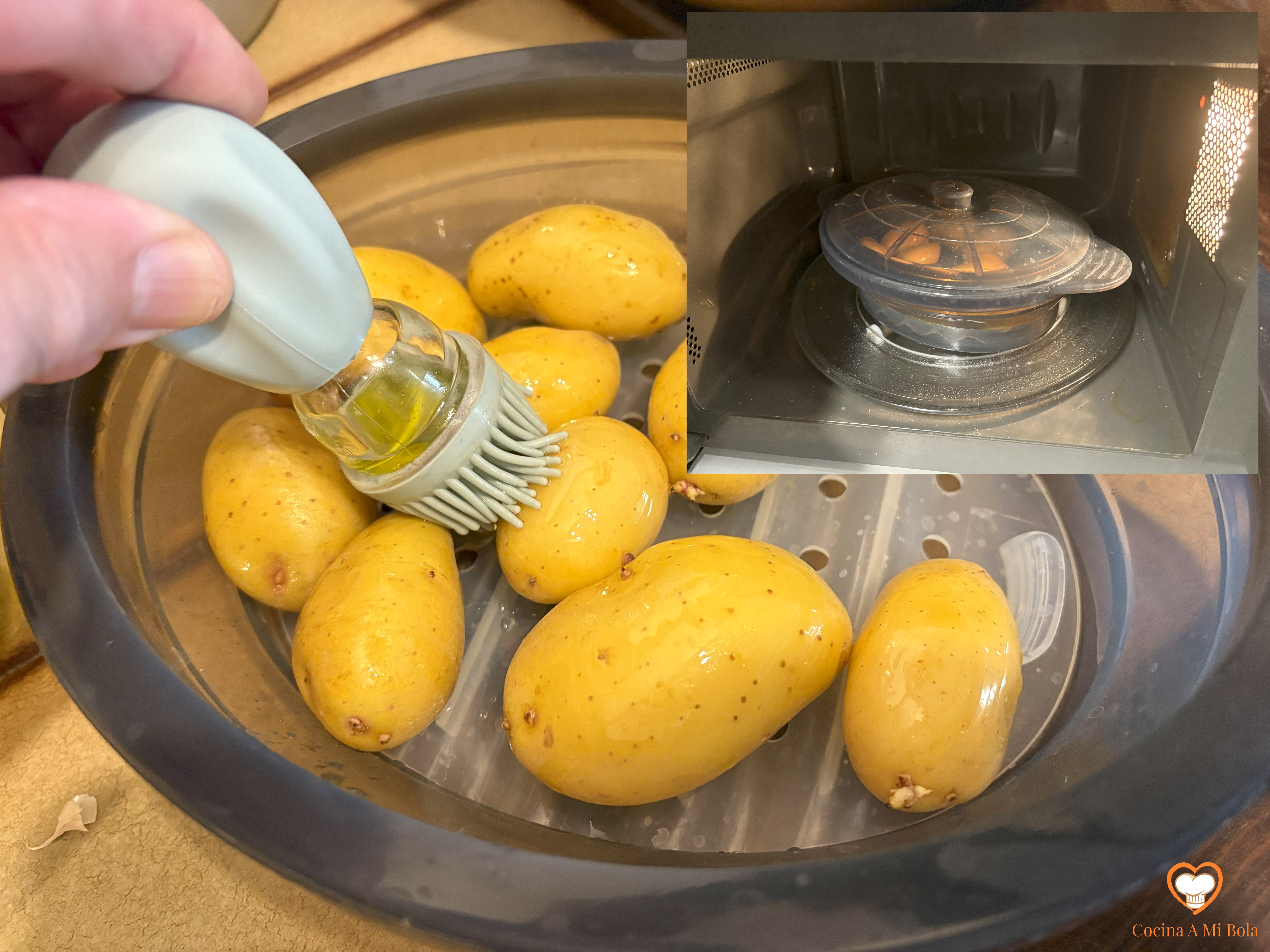 NOVENO.- En tanto que la salsa va reduciendo, lava las patatitas, sécalas y úntalas con muy poquito aceite de oliva. Puedes unas una brocha o simplemente echando un par de gotas de aceite en la mano cada vez que sea necesario, y embadurnándolas para que queden cubiertas por toda su superficie. A continuación, mételas en un recipiente de silicona o vidrio con un chorrito pequeño de agua en el fondo, tápalo y al microondas unos 8-10 minutos a plena potencia. Ten mucho cuidado con el vapor al abrirlo y pínchalas con una aguja de brocheta y si atraviesa con total facilidad, están en su punto. Una pizca de sal y reservar.