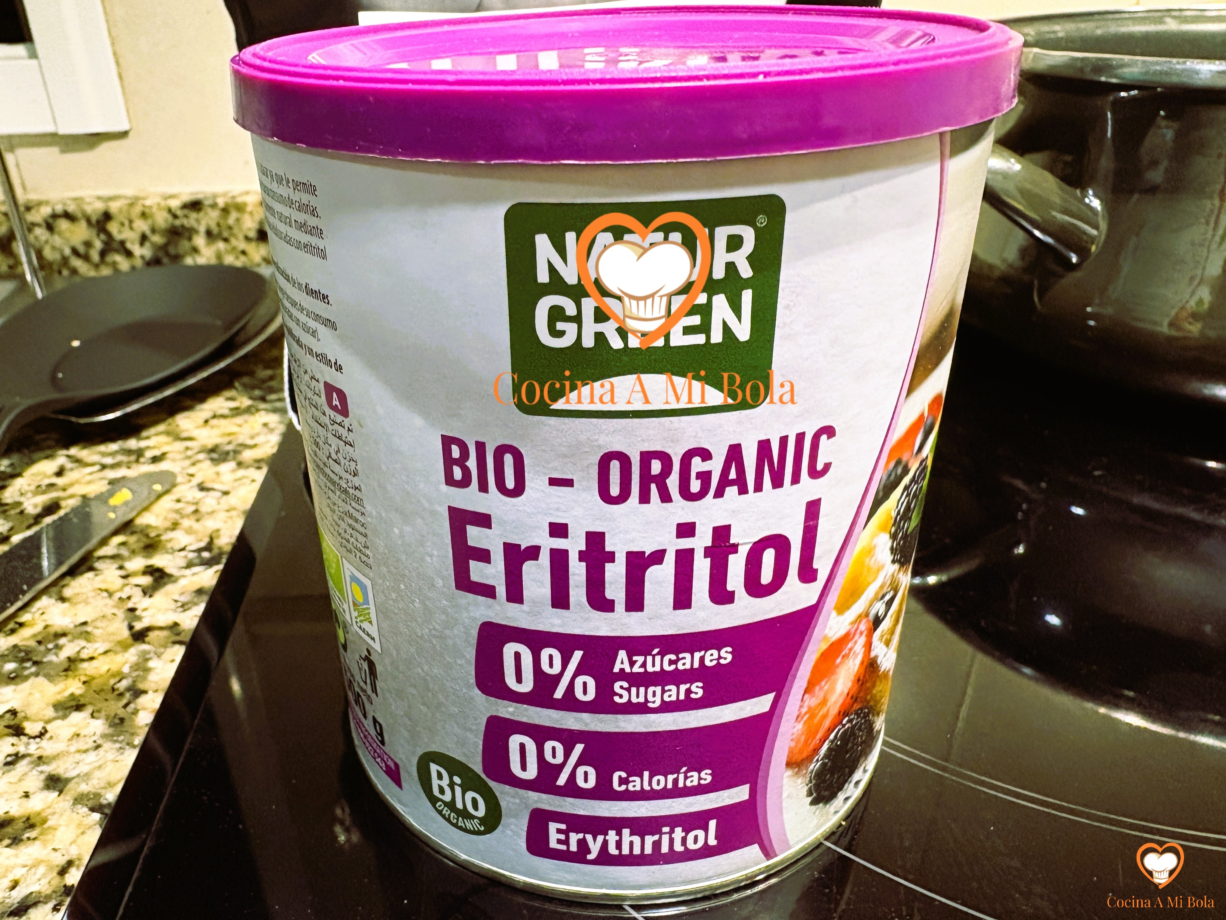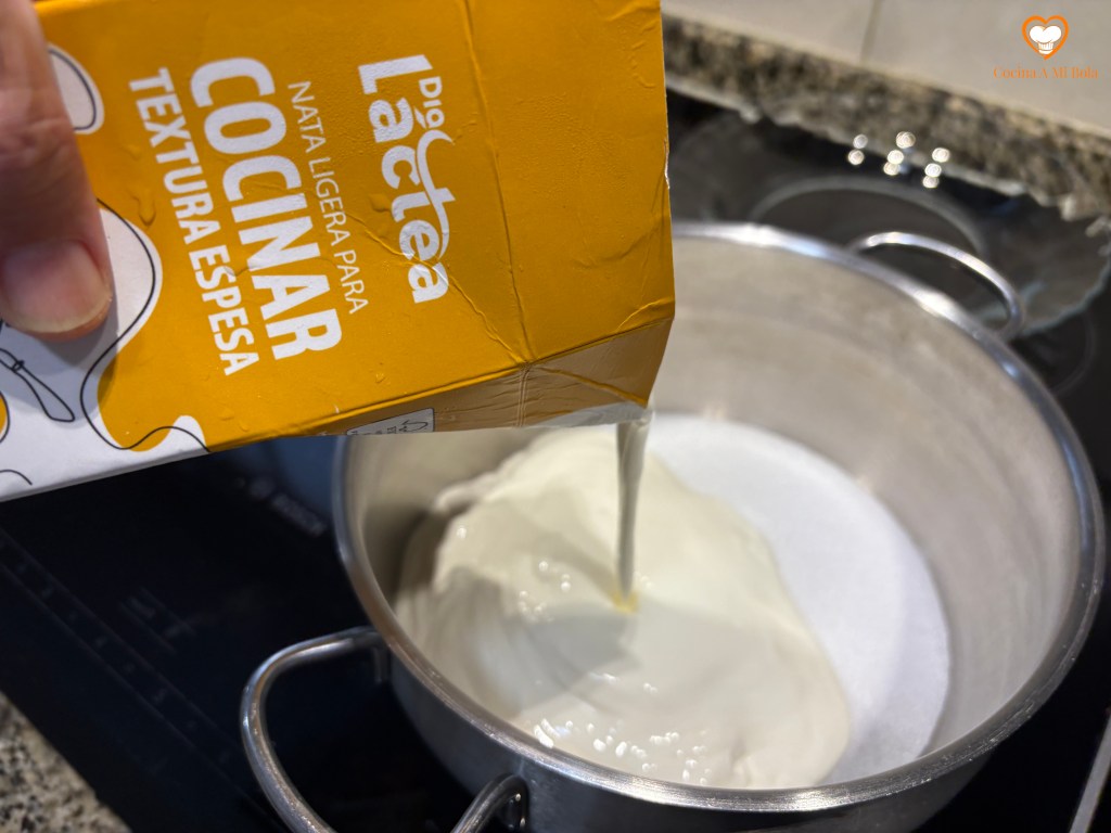 TERCERO.- Ponemos un cazo al fuego donde echamos el Eritritol granulado. Verás que su textura es idéntica a la del azúcar blanquilla normal. Es un edulcorante que soporta perfectamente el calor y, por lo tanto, puede ser cocinado. A continuación, echamos la nata.