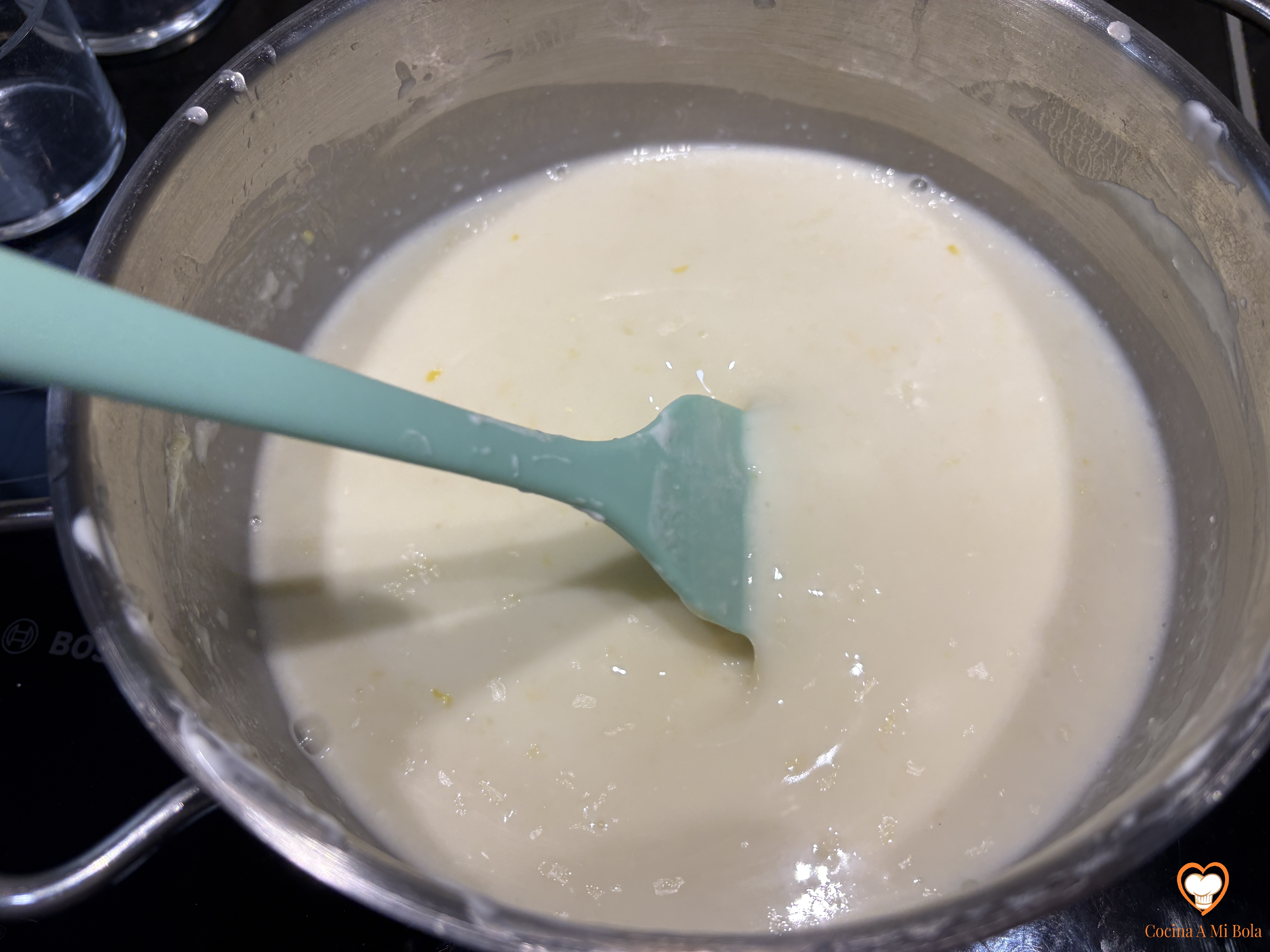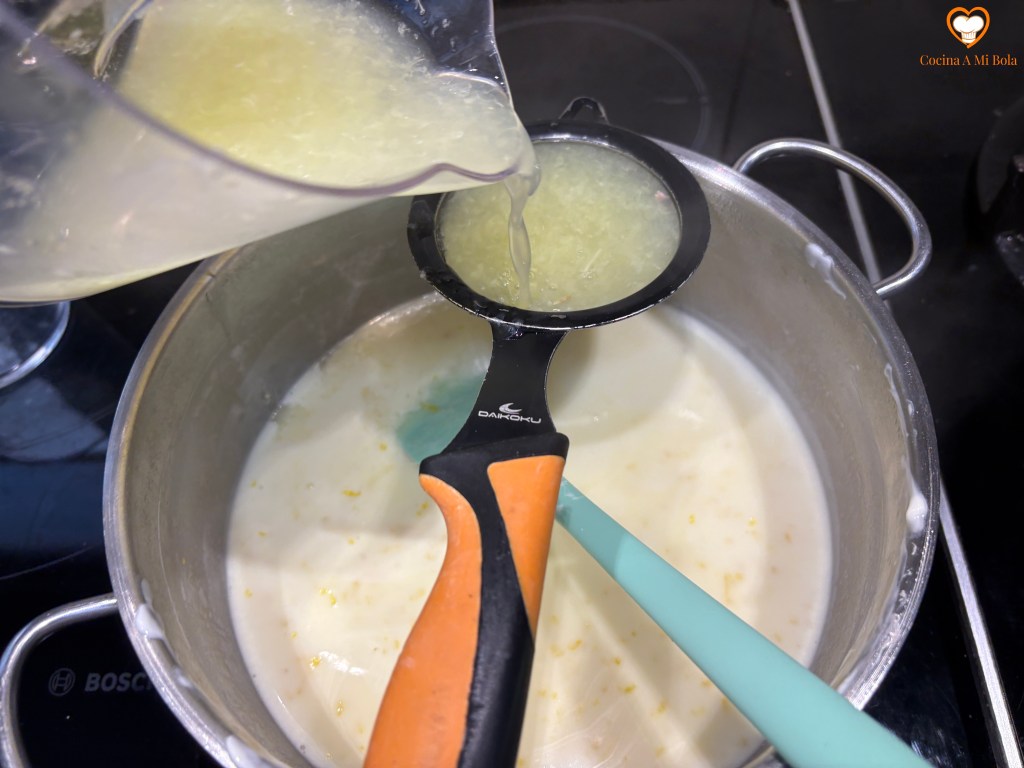 QUINTO.- Cuando alcance el hervor, siempre sin dejar de remover, lo mantendremos durante un minuto más. Apagamos el fuego y añadimos el zumo de limón con la ralladura ya batida, o no, según hayas elegido. Continuamos removiendo durante otro minuto hasta que se haga un poco más cremoso a medida que va perdiendo temperatura.