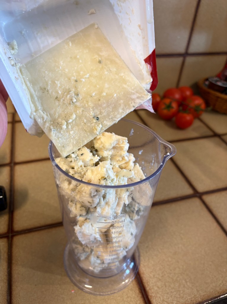 PRIMERO.- Receta rapidísima. Saca el queso de la nevera unas horas antes para que se ablande, pero si no lo has hecho, mételo 30 segundos en el microondas y estará preparado. Tan sólo se trata de que la grasa fluidifique lo suficiente como para que no atasque la batidora.