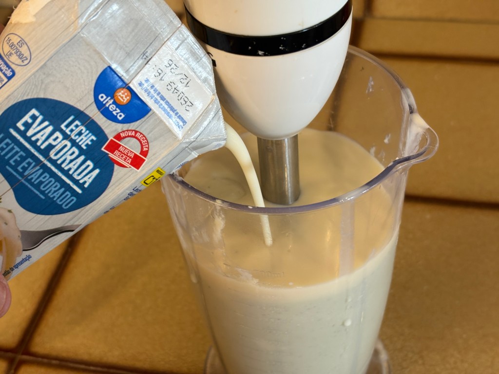 TERCERO.- Echa la mitad de la leche evaporada y bate bien hasta que no queden grumos.