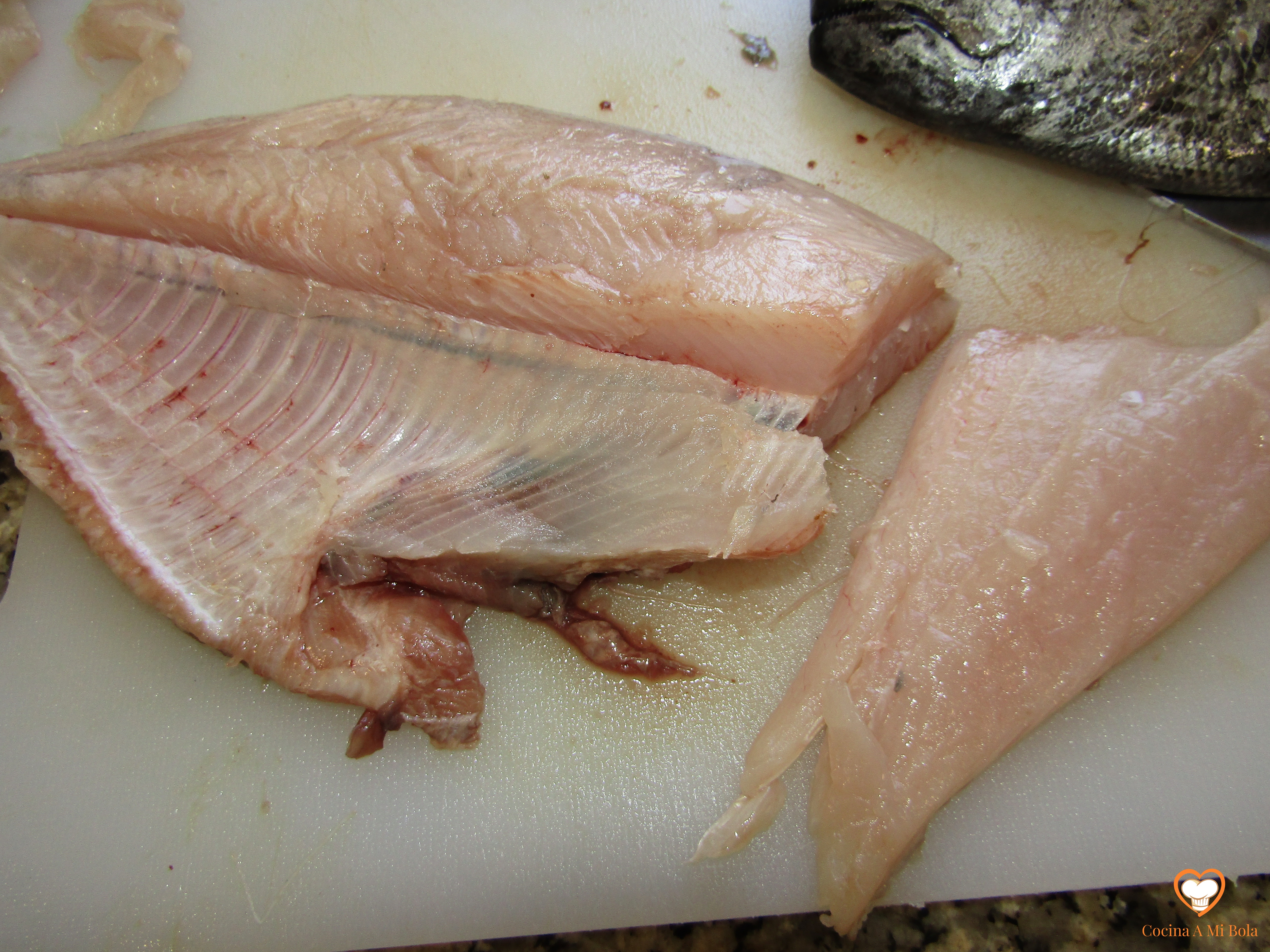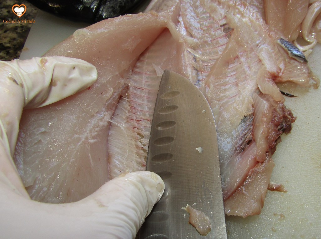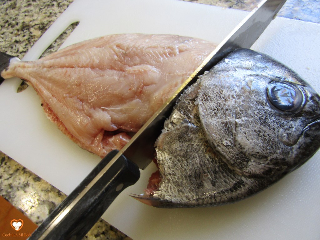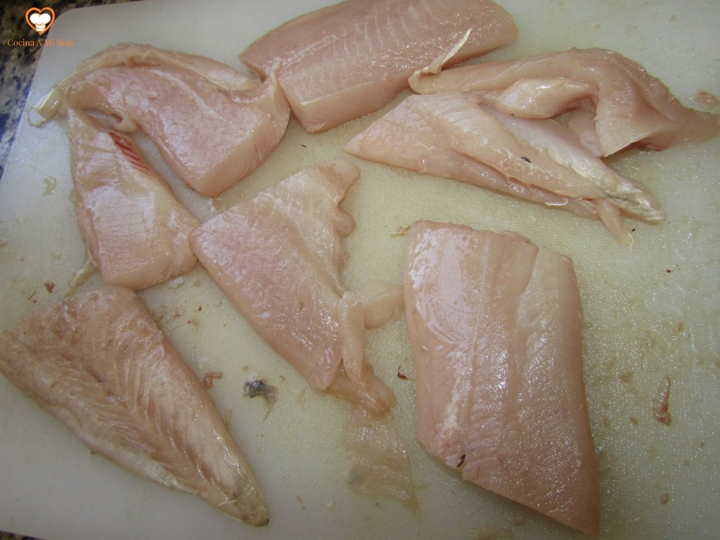 CUARTO.- Cuando tengas el lomo, córtalo en tajadas de un tamaño razonable para ser servidas. No las hagas demasiado pequeñas ni demasiado delgadas porque se pueden secar al freírlas.  Si al terminar de quitarlo se hubieran venido con la pieza unas espinas menores que hay en la parte exterior, corta con el cuchillo todo a lo largo para deshacerte de ellas, aunque pierdas un poco de carne en ello. Te quedará una tajada sin espinas y espectacular.