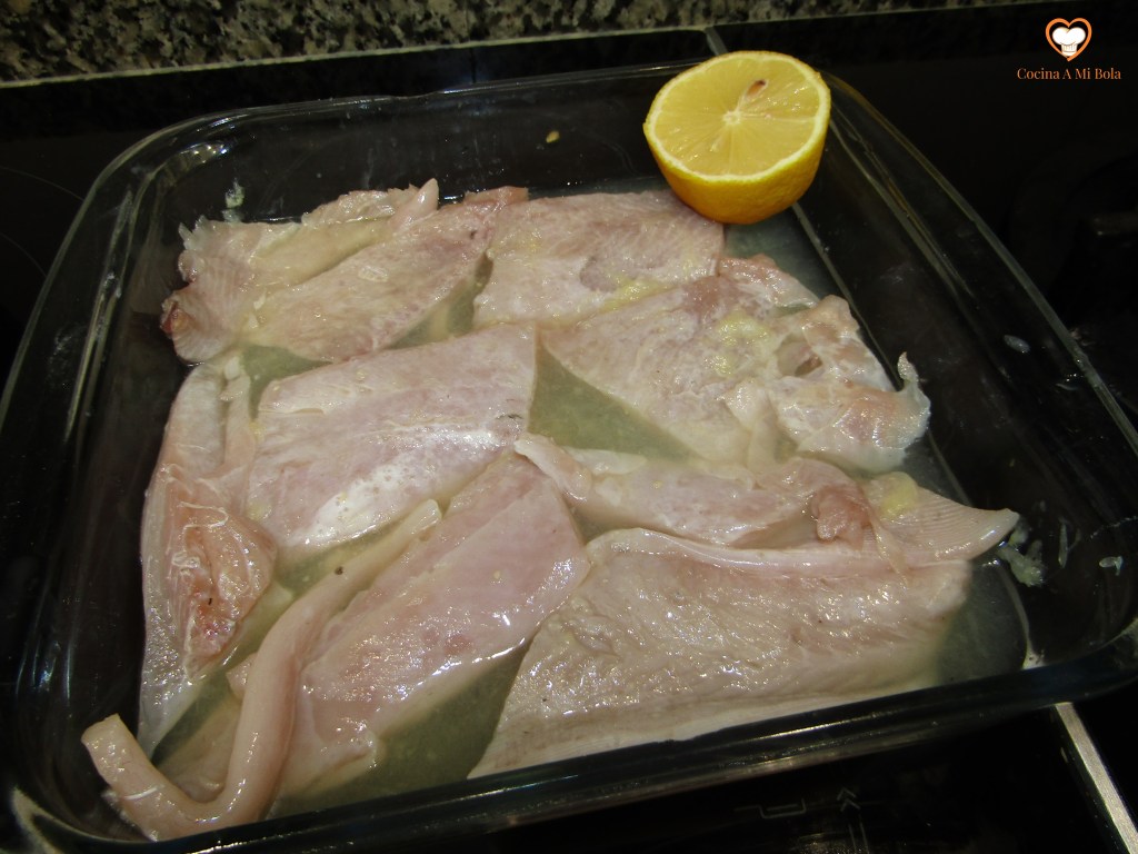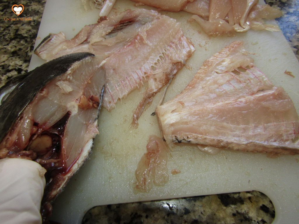 PRIMERO.-  Es importante que la limpien en la pescadería porque es muy sangrante y porque es francamente difícil  quitarle la piel. Se trata de una piel escamosa y dura que resulta muy  engorrosa de arrancar. Y si ya te la hacen tajadas, pues mejor que mejor, pero un detalle muy importante: que no se deshagan de la cabeza ni de la espina dorsal. De todos modos, aquí te explico cómo cortarla.