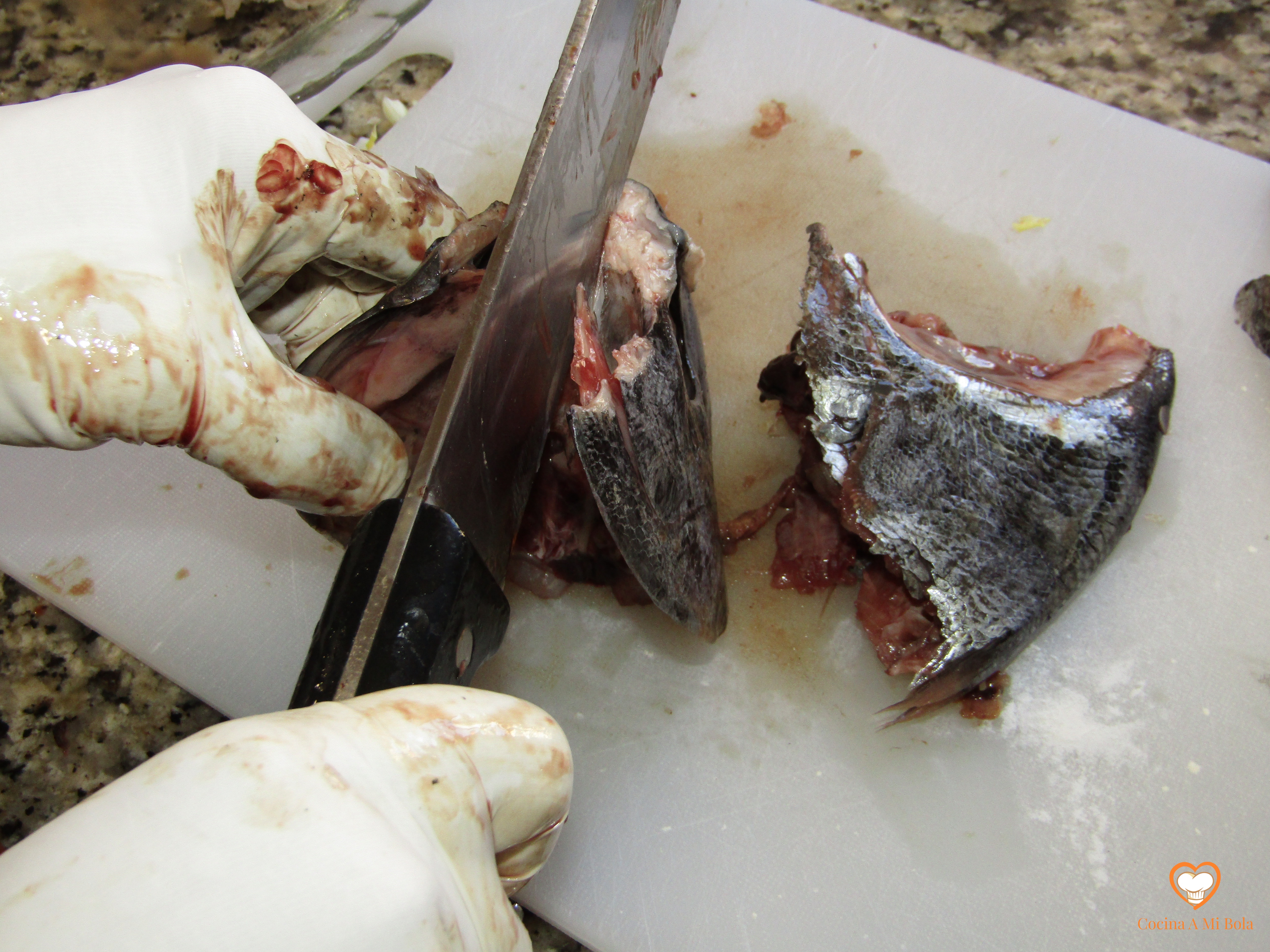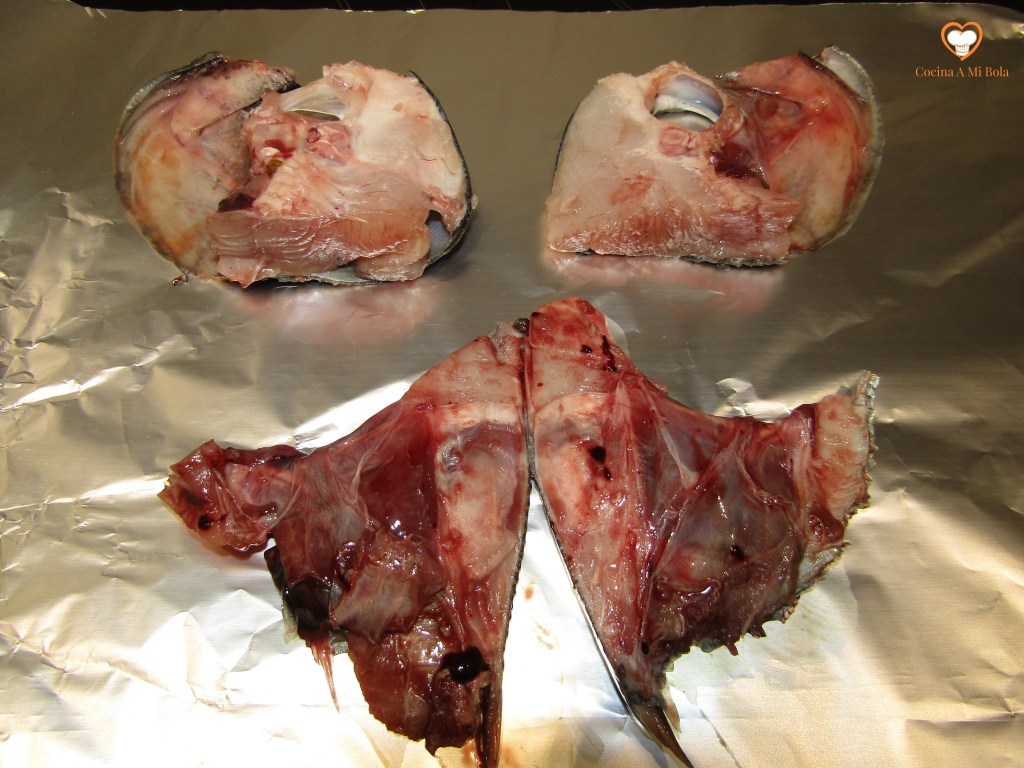 SEGUNDO.- Corta la cabeza por detrás de las agallas y arranca (o corta) esa especie de oreja ósea que las protege.  Deséchalas pero quédate con esas “orejas”. Lávalas y reserva. Verás que en la cabeza hay bastante carne. Es el cogote. Quítale los ojos y corta la cabeza por la mitad longitudinalmente. Lava y reserva  también.