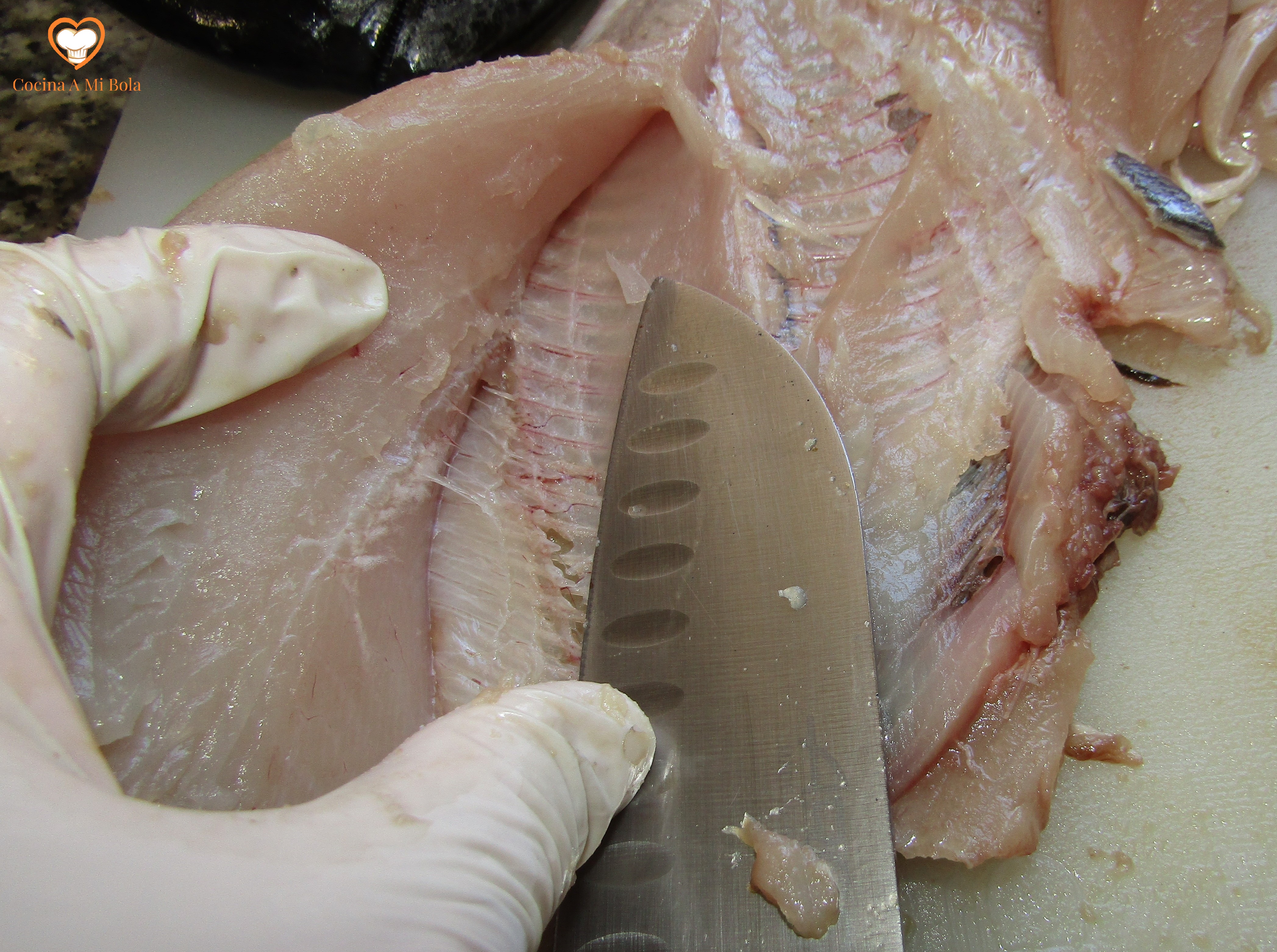 TERCERO.- Ahora ya podemos abordar sus lomos, así que toma un cuchillo bien afilado y busca la parte central de la espina dorsal. Cuando topes con ella, intenta sacar el lomo cortando desde el centro de la espina hacia el exterior pero notando siempre la dureza de las espinas, es decir, sin separar el cuchillo de ellas de forma que no nos dejemos mucha carne pegada a ellas.  Mira la fotografía.