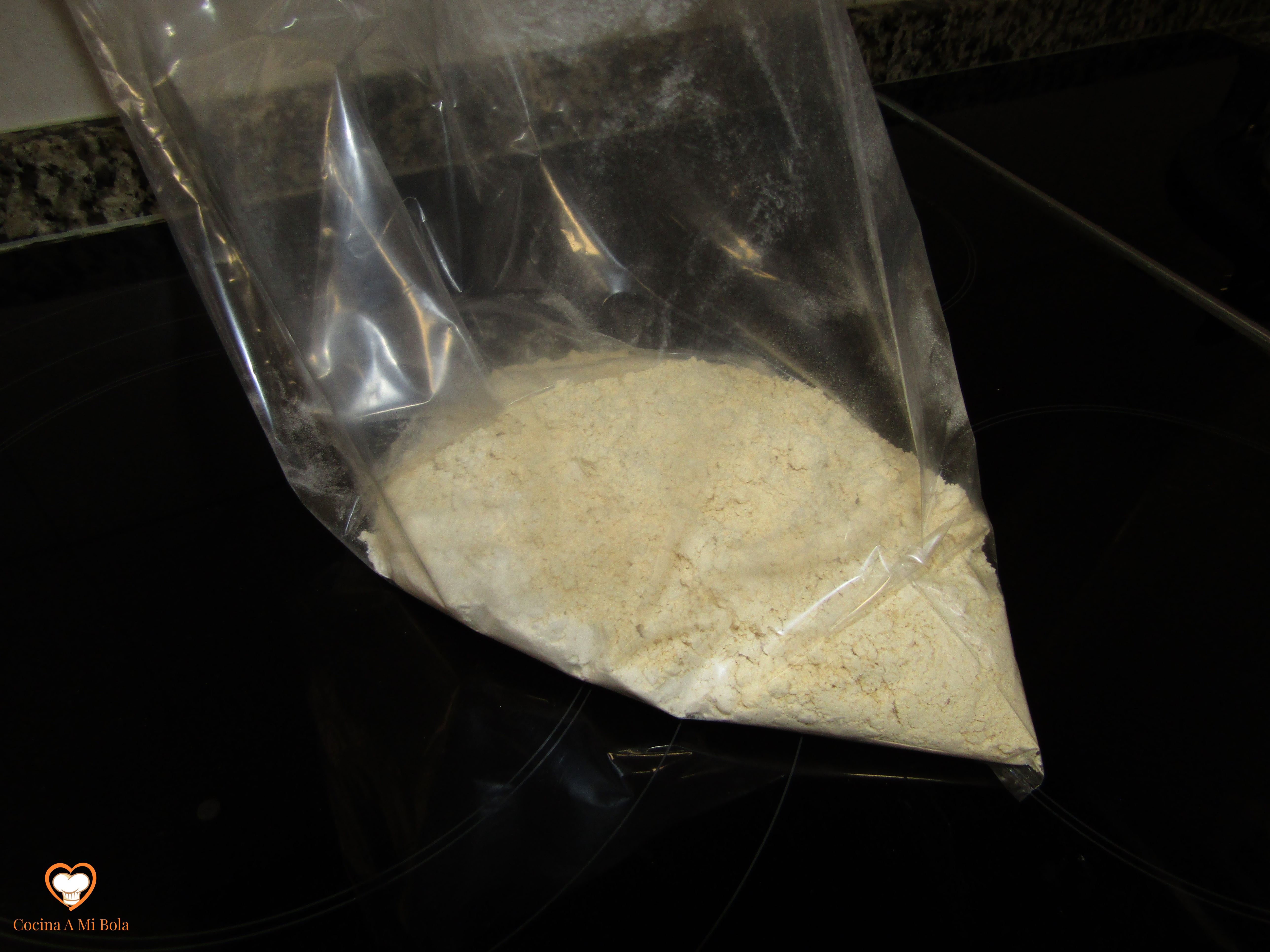SEXTO.- Toma una bolsa de plástico (apta para uso alimentario; del supermercado, por ejemplo) y tras comprobar que no tiene agujeros, echa en ella una mezcla al 50% de harina de trigo y 50% de garbanzo. Enróllala por su boca para cerrarla y agita bien para que se mezclen lo más posible.
