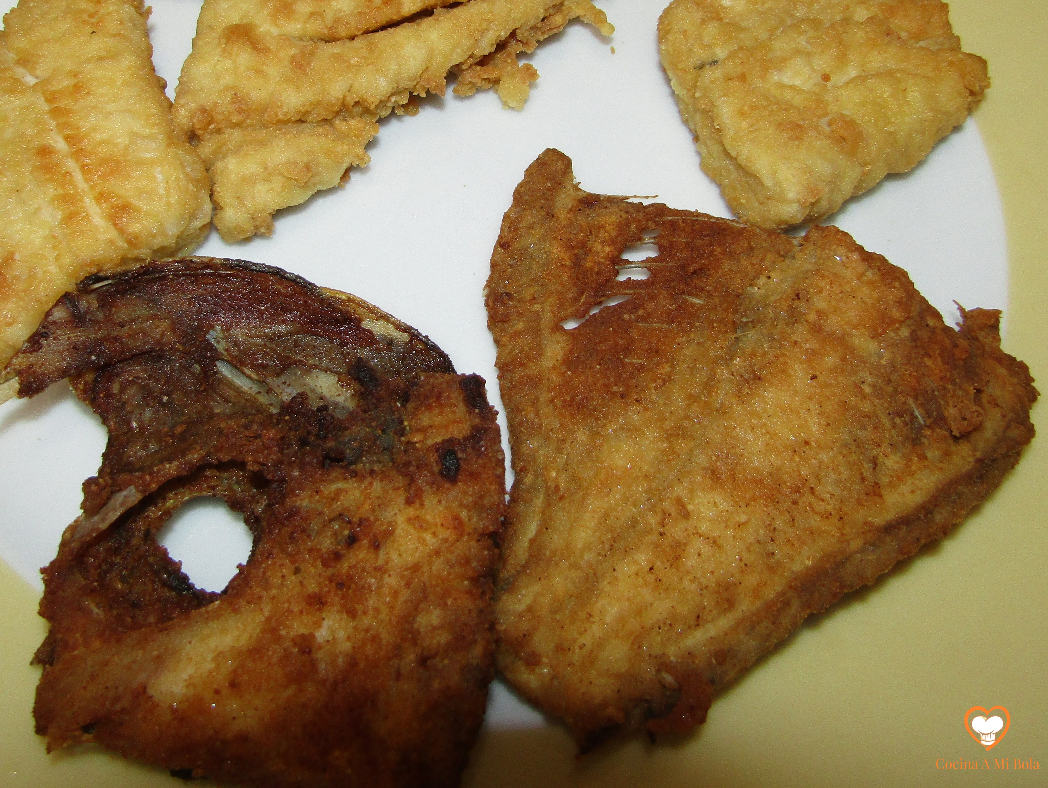 OCTAVO.- Una vez fritas las tajadas, deja calentar el aceite un poco más y vete echando la cabeza, orejas y espina, pero en este caso sí vamos a dejarlo bien frito. Que tome algo más que color; que se tueste y se ponga crujiente. Verás cómo esa carne que se quedó adherida a la espina; esos cogotes o las “orejas” se han convertido ahora en un verdadero  manjar. Hay quien come sólo con eso… alguien que vive conmigo.