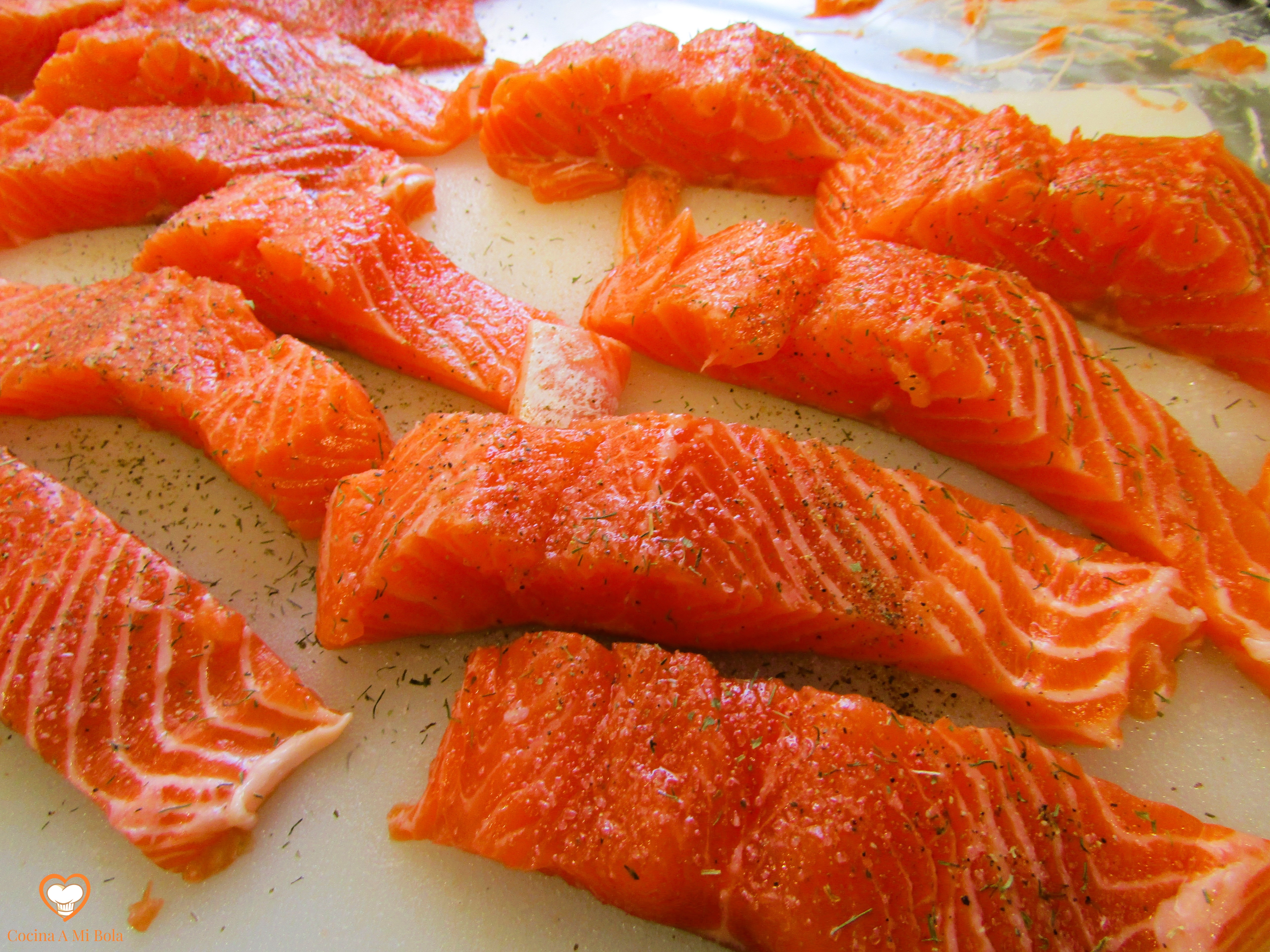 SEGUNDO.- Corta cada uno de los lomos en tajadas estrechas, en sentido transversal. Ponles sal, pimienta negra molida y eneldo, y colócalas en una fuente de cristal. Rocía todo con el zumo de un limón, cúbrelo con film de cocina y mételo en la nevera durante una hora aproximadamente.