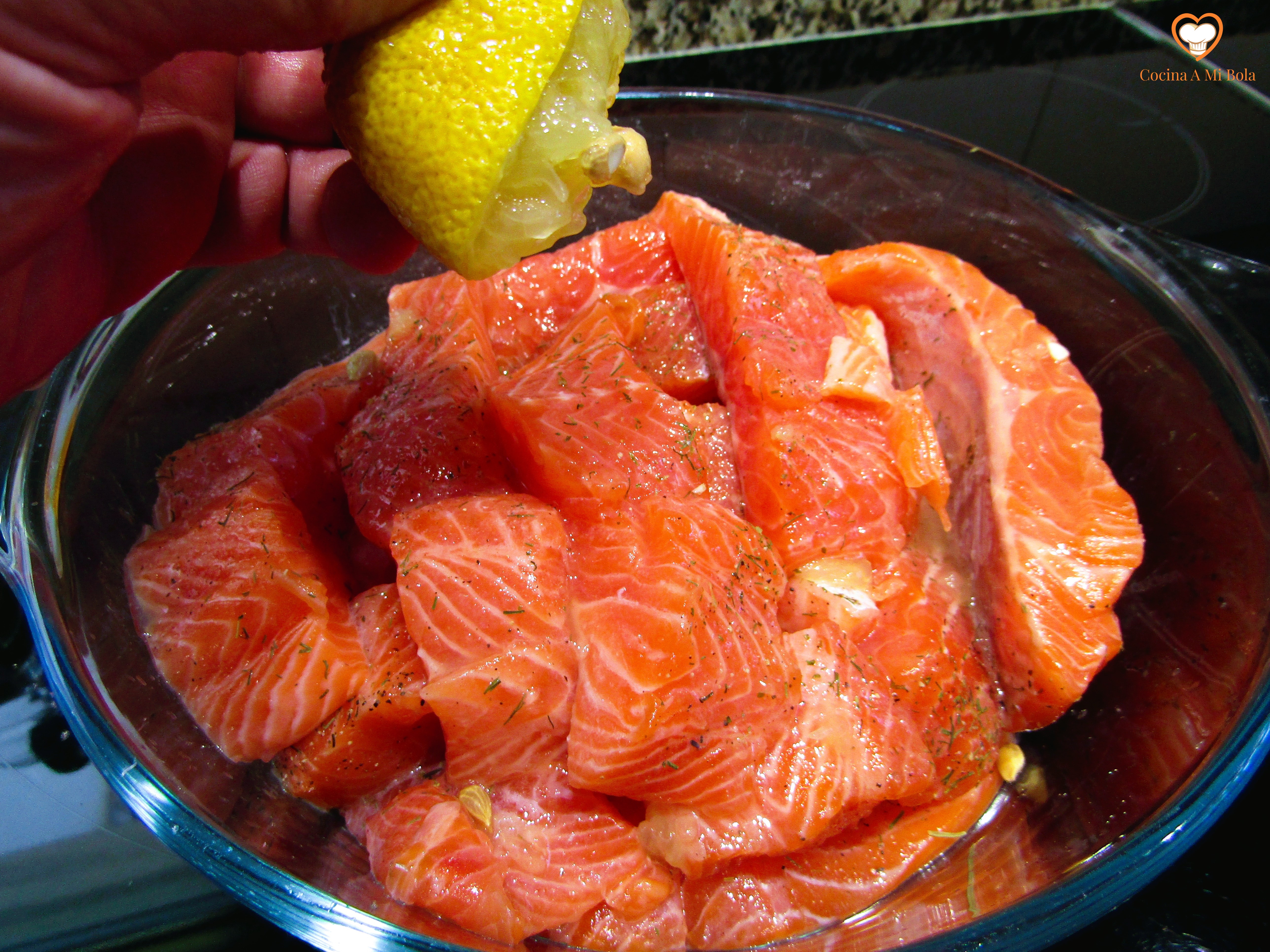 QUINTO.- Saca el pescado ya marinado del frigorífico, pruébalo y añade una pizca de sal si fuera preciso. Vuélcalo en el bol con todo lo demás, incluido el jugo y mezcla todo bien, pero con mimo.