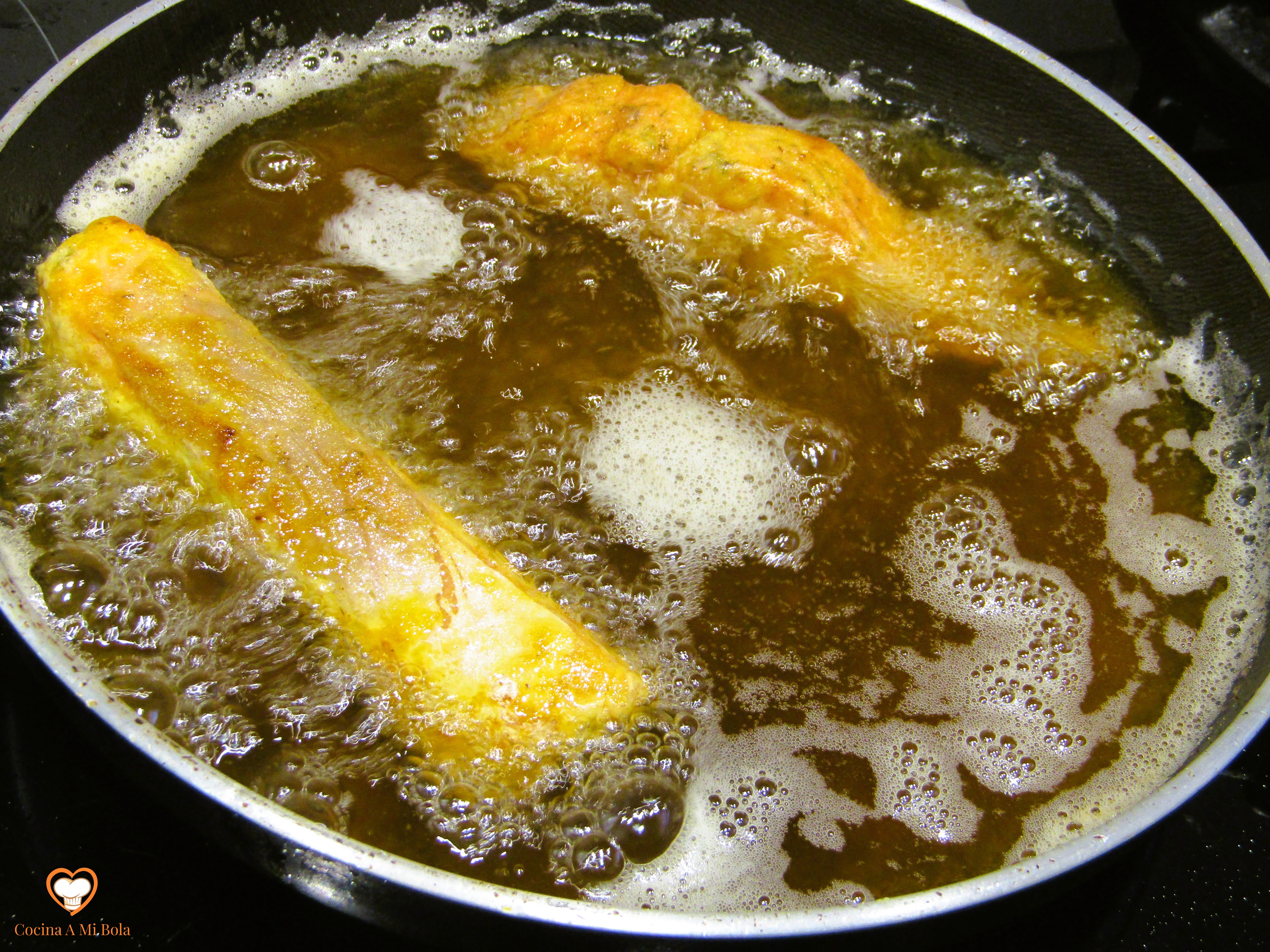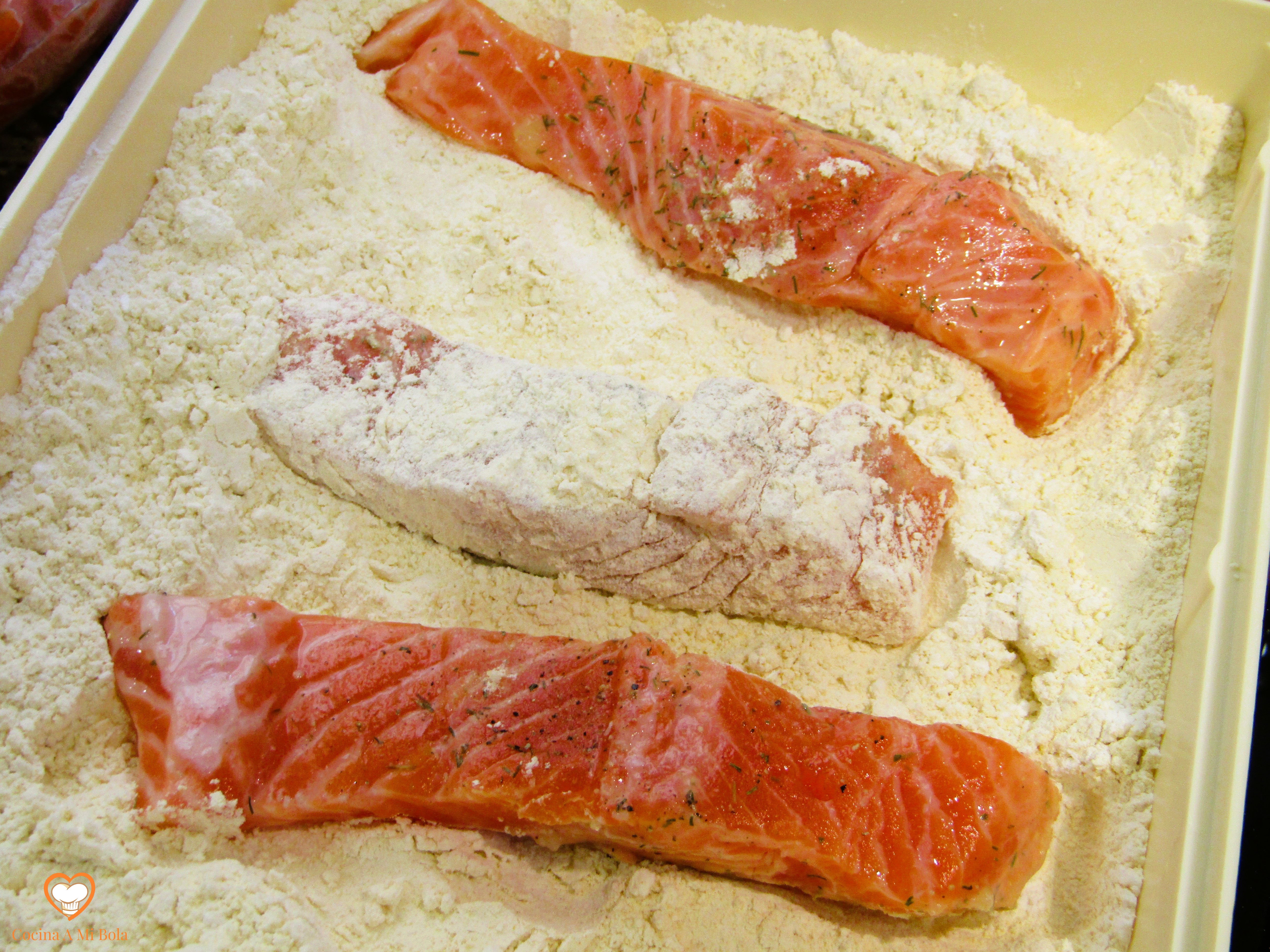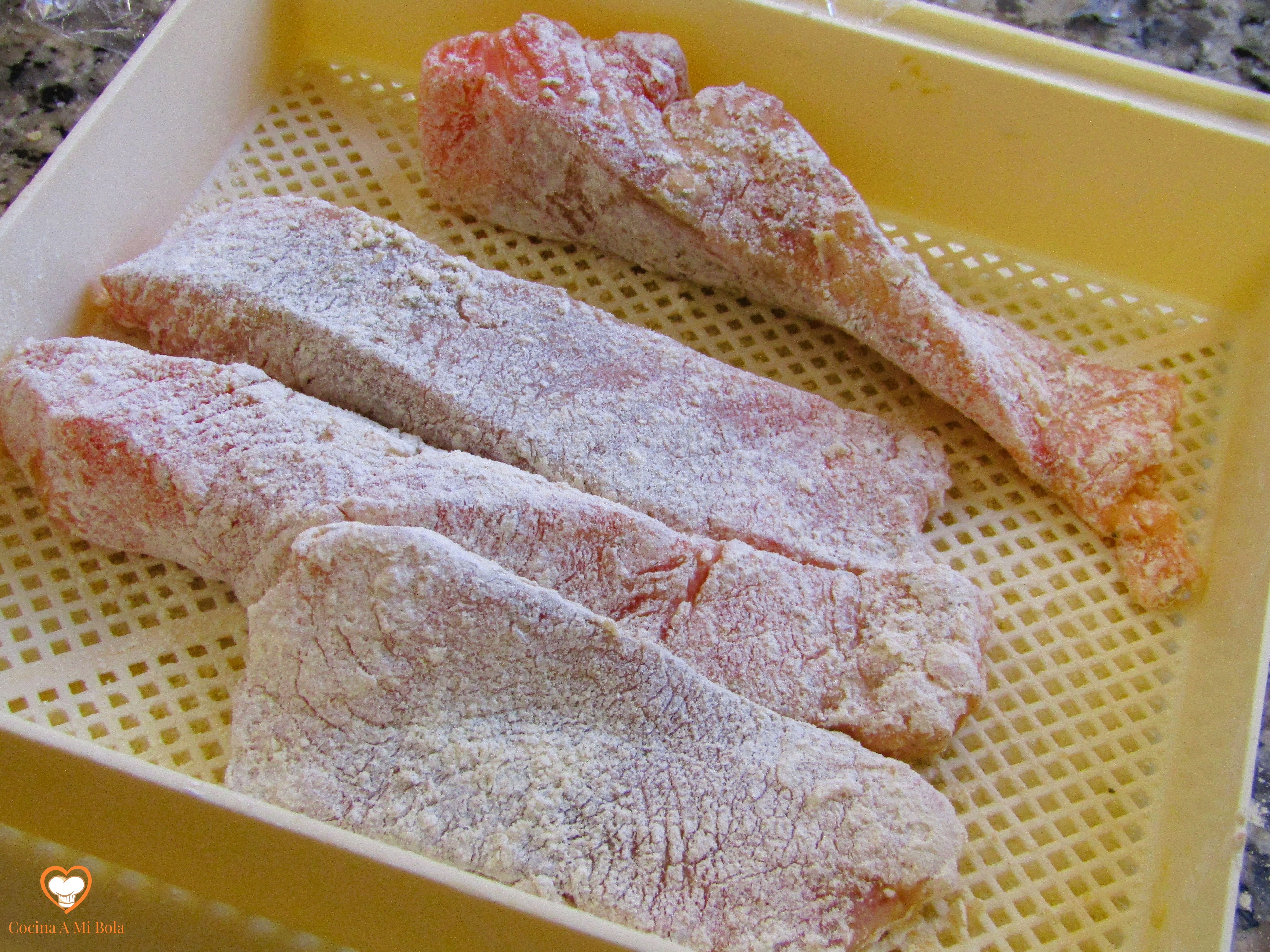 QUINTO.- Reboza las tajadas una a una en la mezcla de harinas, sacude el exceso y échalas a la sartén (de pocas en pocas) cuando el aceite esté muy caliente. Queremos una fritura urgente para que no se haga mucho el pescado en su interior. Yo no lo tendría más de treinta segundos.