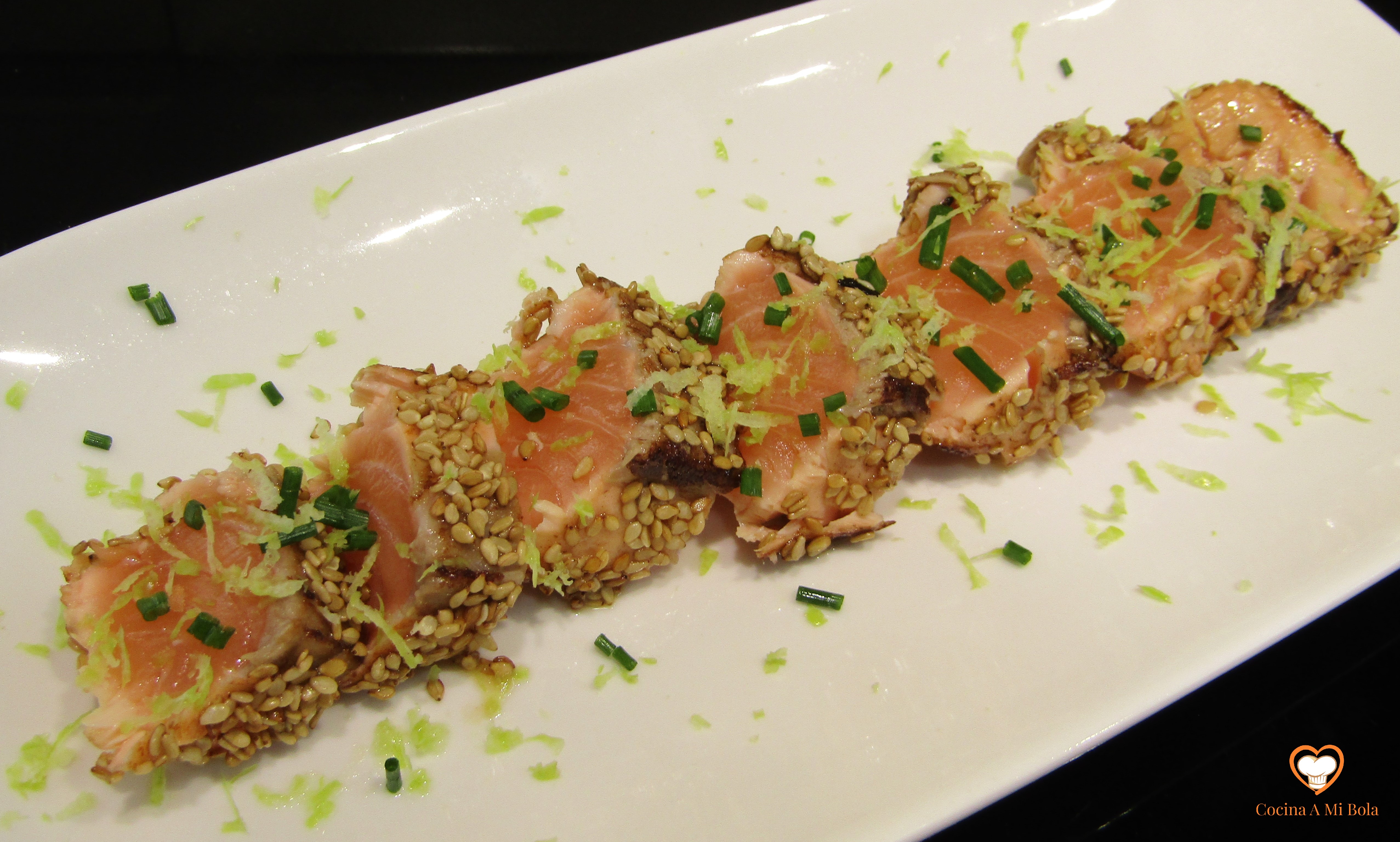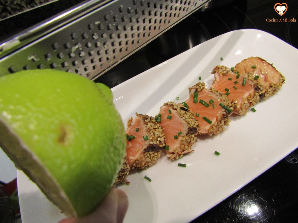 INGREDIENTES: Para 2 personas; 2 tacos de lomo de salmón fresco, aceite de sésamo, salsa de soja, vinagre de arroz, vinagre añejo de Jerez, 1 lima, salsa Wasabi (sustituible por Tabasco), semillas de sésamo, 2 ramitas de cebollino.