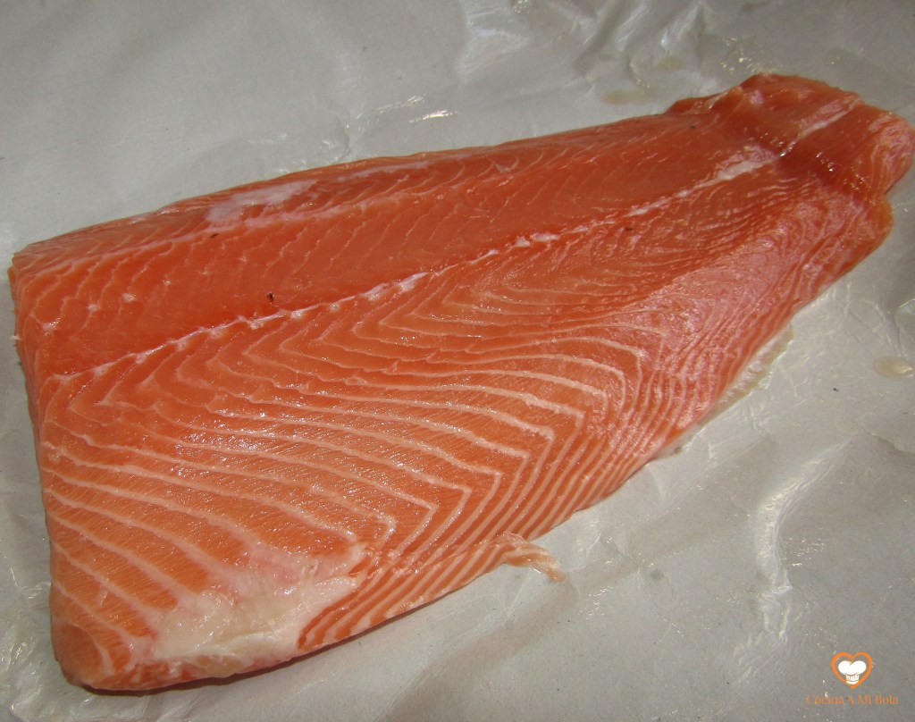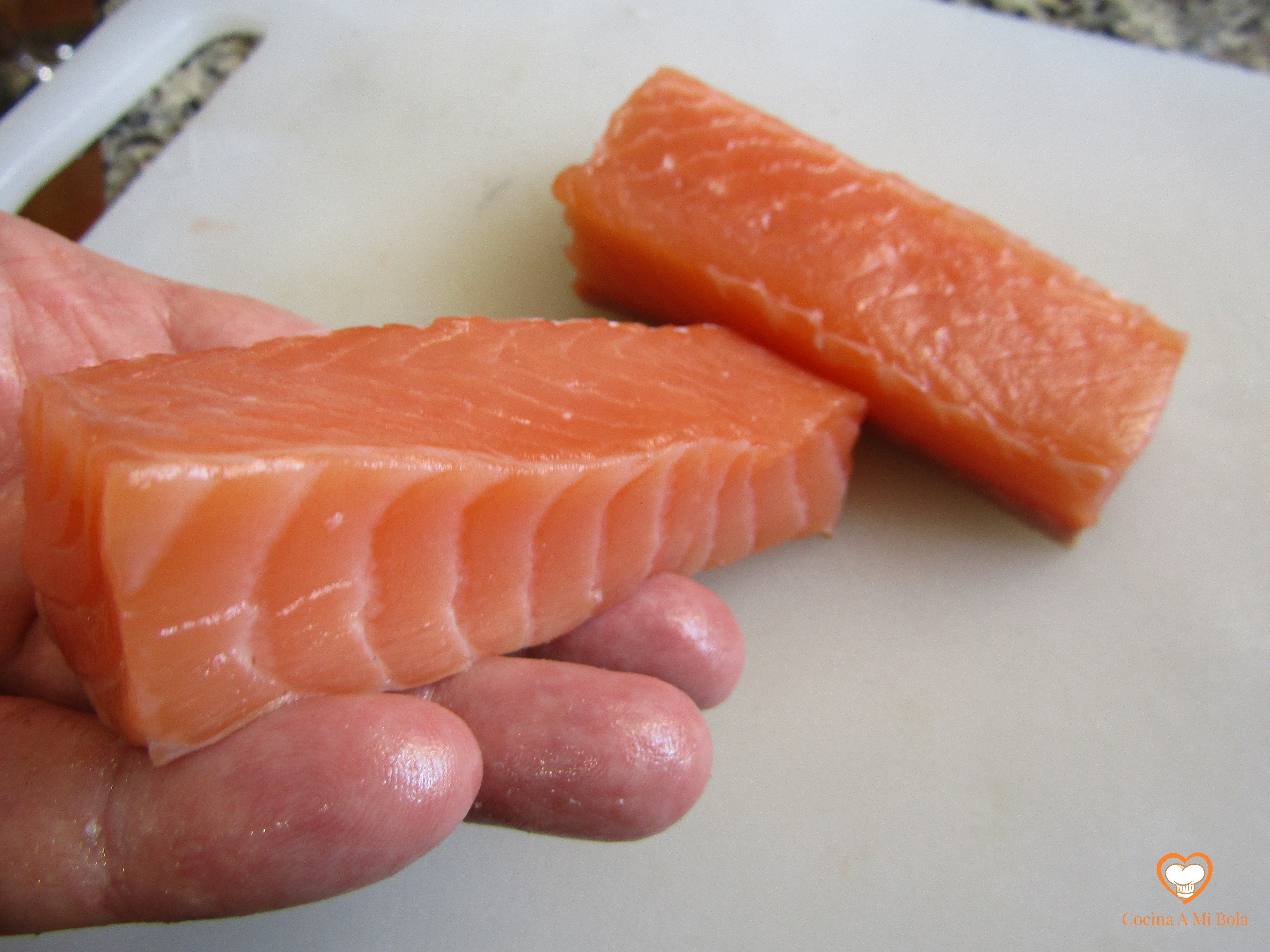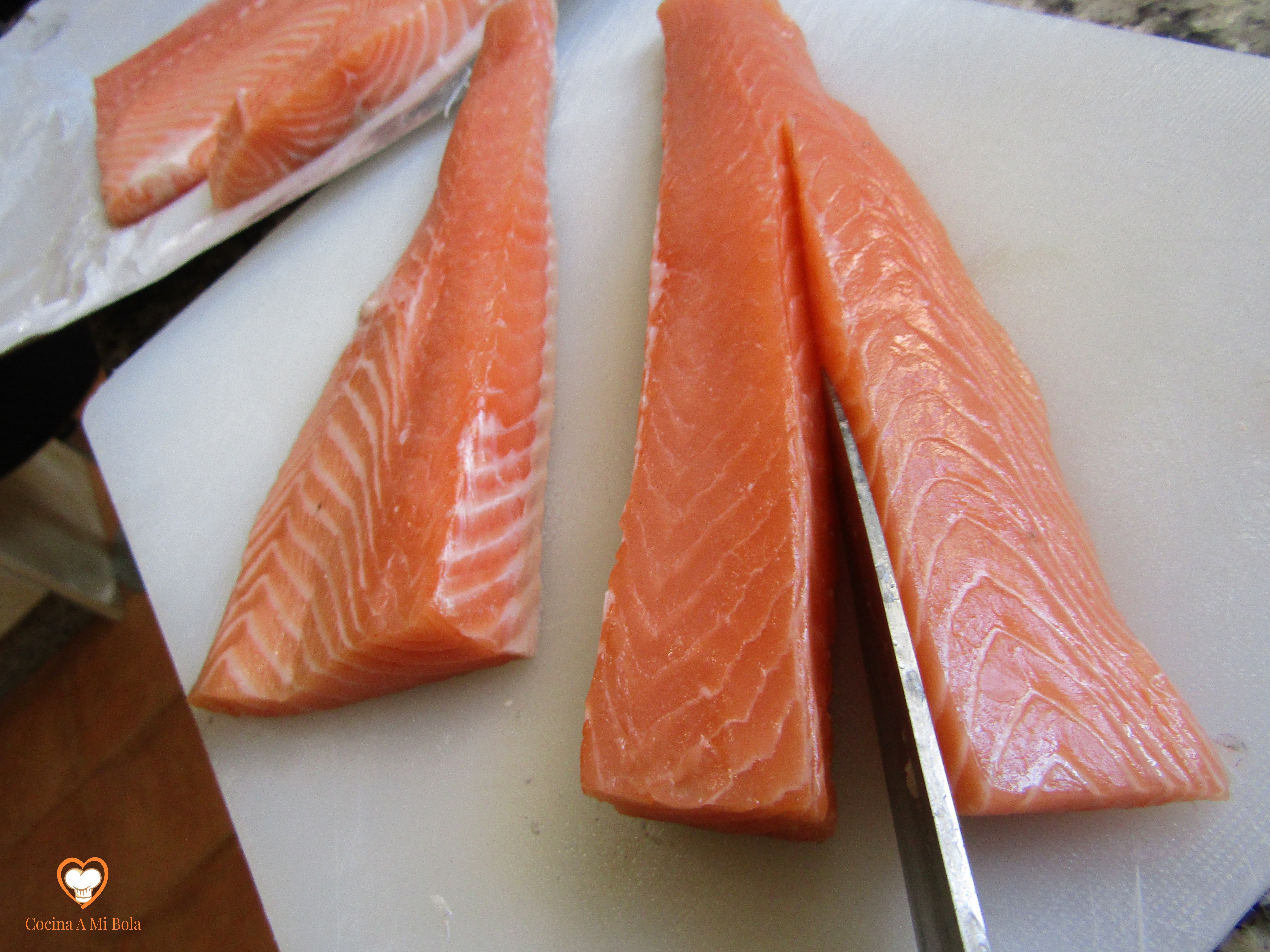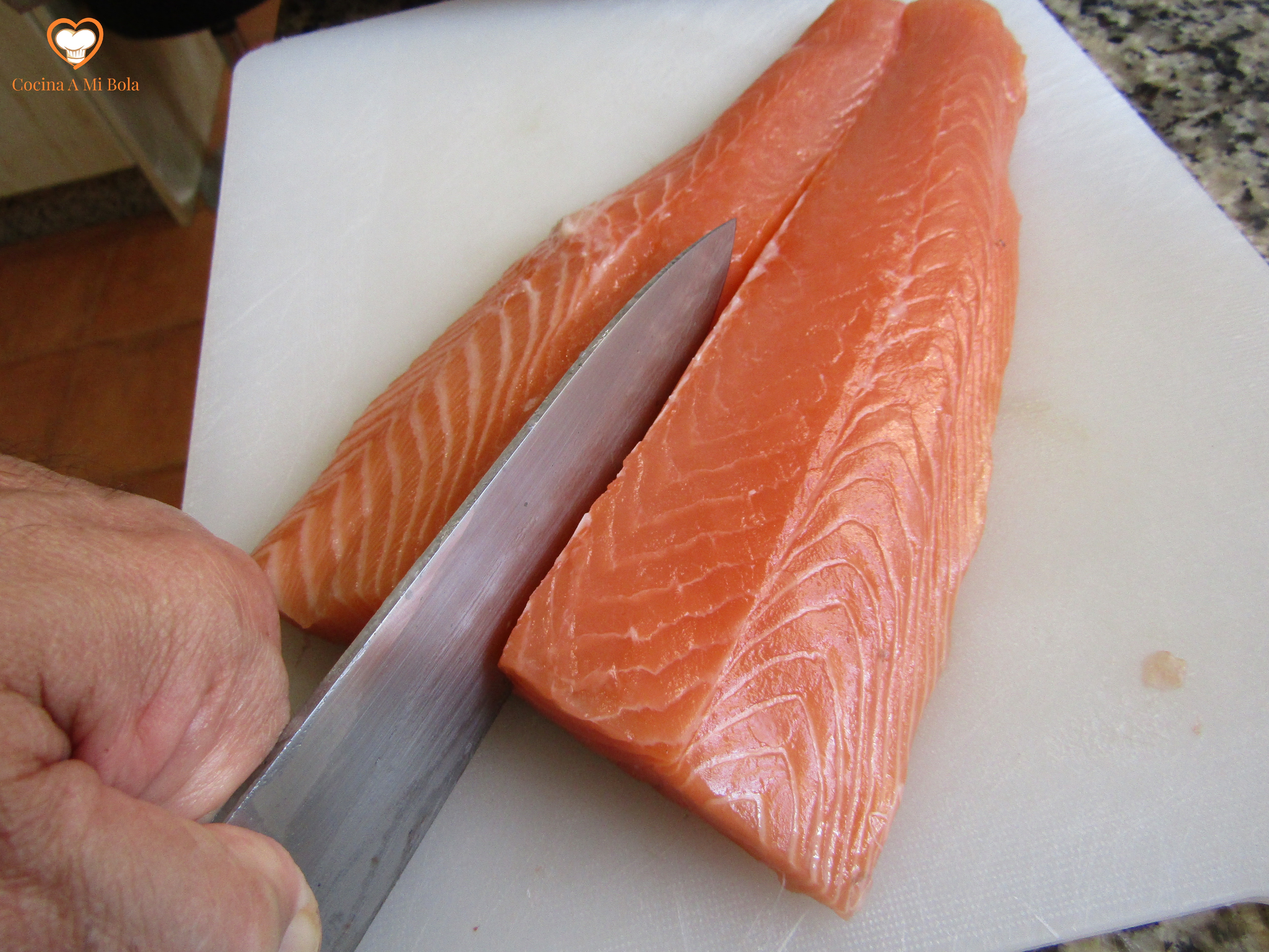 PRIMERO.- Aunque no es complicado de abrir, podemos partir de una cola de salmón a la que el pescadero nos haya quitado ya la espina central, las laterales y la piel. Dos lomos limpios.