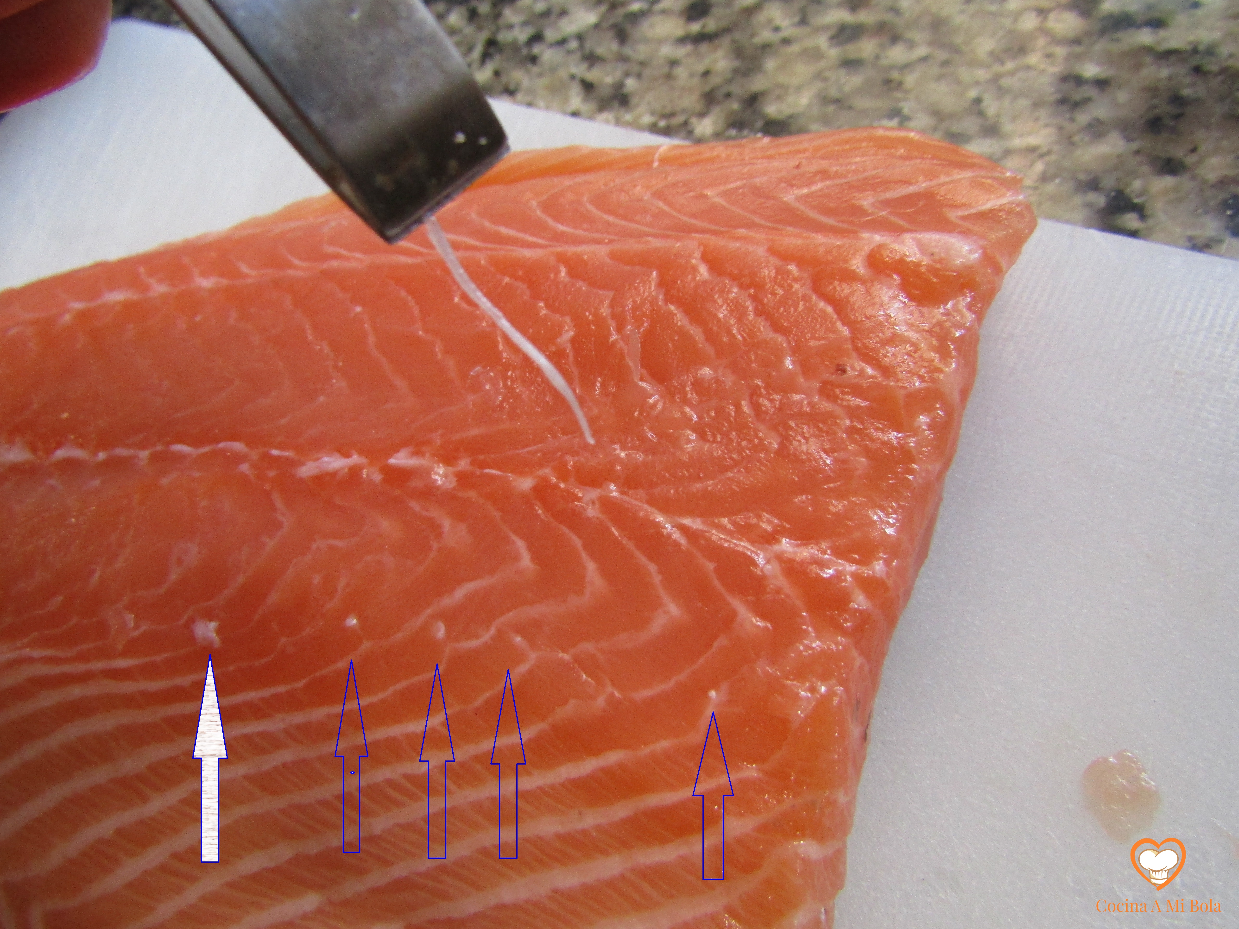 SEGUNDO.- Toma uno de los lomos y pasa la mano por él con suavidad buscando durezas o espinas. Si el pescadero lo ha hecho bien, sólo te quedarán las espinas que se encuentran donde he marcado con flechas en la fotografía. Normalmente están a ras y sólo verás un puntito blanco, pero al tacto se notan enseguida. Usa las pinzas para extraerlas.