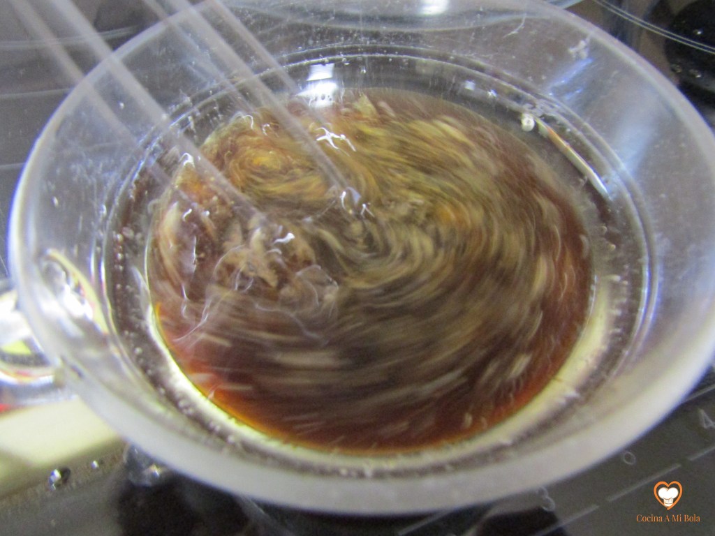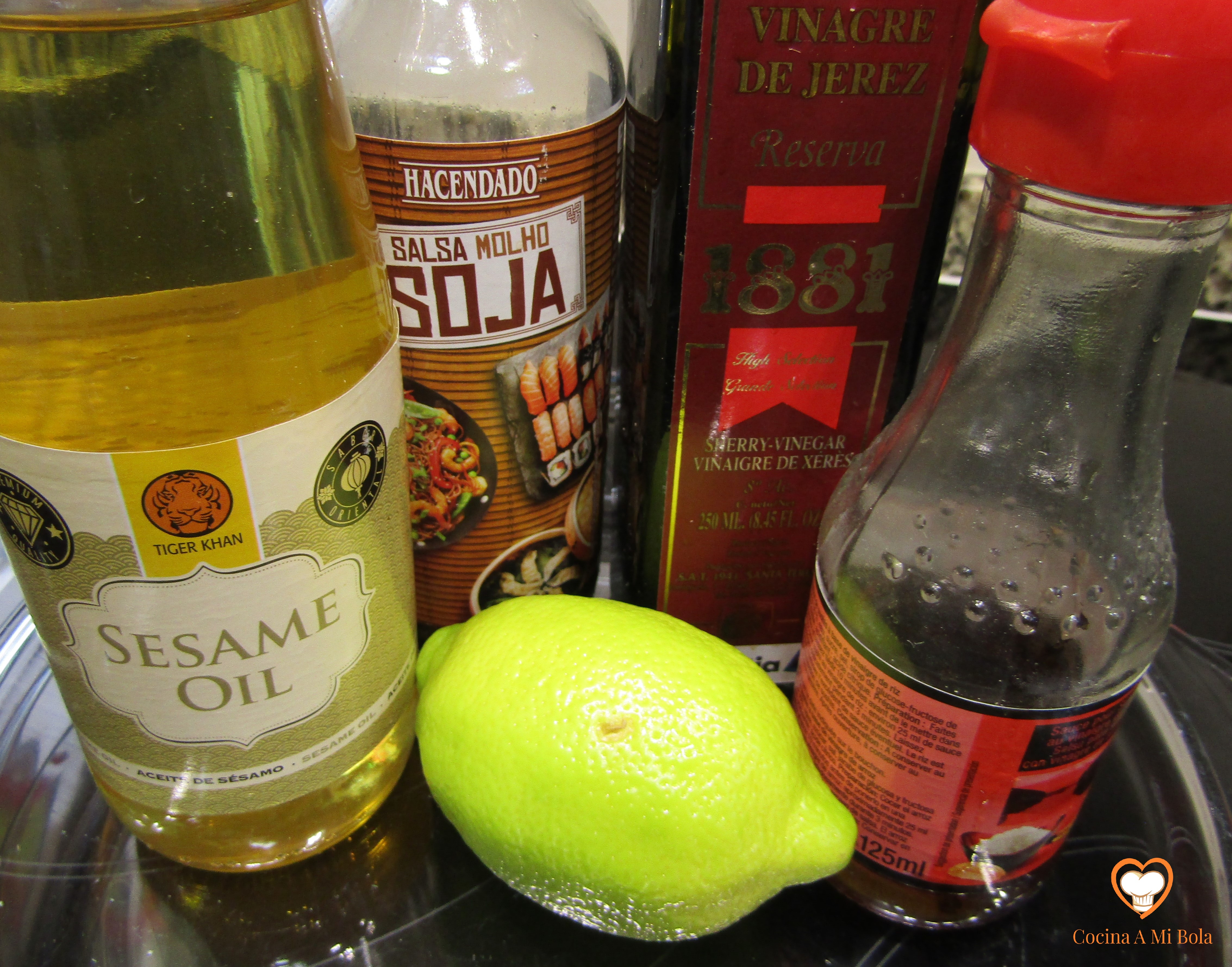 CUARTO.- Ahora vamos a preparar una salsa en la que marinar el pescado, y para ello, echamos en un bol 3 cucharadas soperas de aceite de sésamo, 3 cucharadas soperas de salsa de soja, 1 cucharada sopera de vinagre de arroz, otra de vinagre añejo de Jerez, 4 cucharadas soperas de zumo de lima (conserva la cáscara) y 4 ó 5 gotas de salsa picante (si es Wasabi, la punta de una cucharilla de postre). La intensidad del picante va en gustos. Si te gusta potente, duplica o triplica esta cantidad. Mezcla todo muy bien hasta que se haga una salsa líquida uniforme y échalo en un recipiente plano.