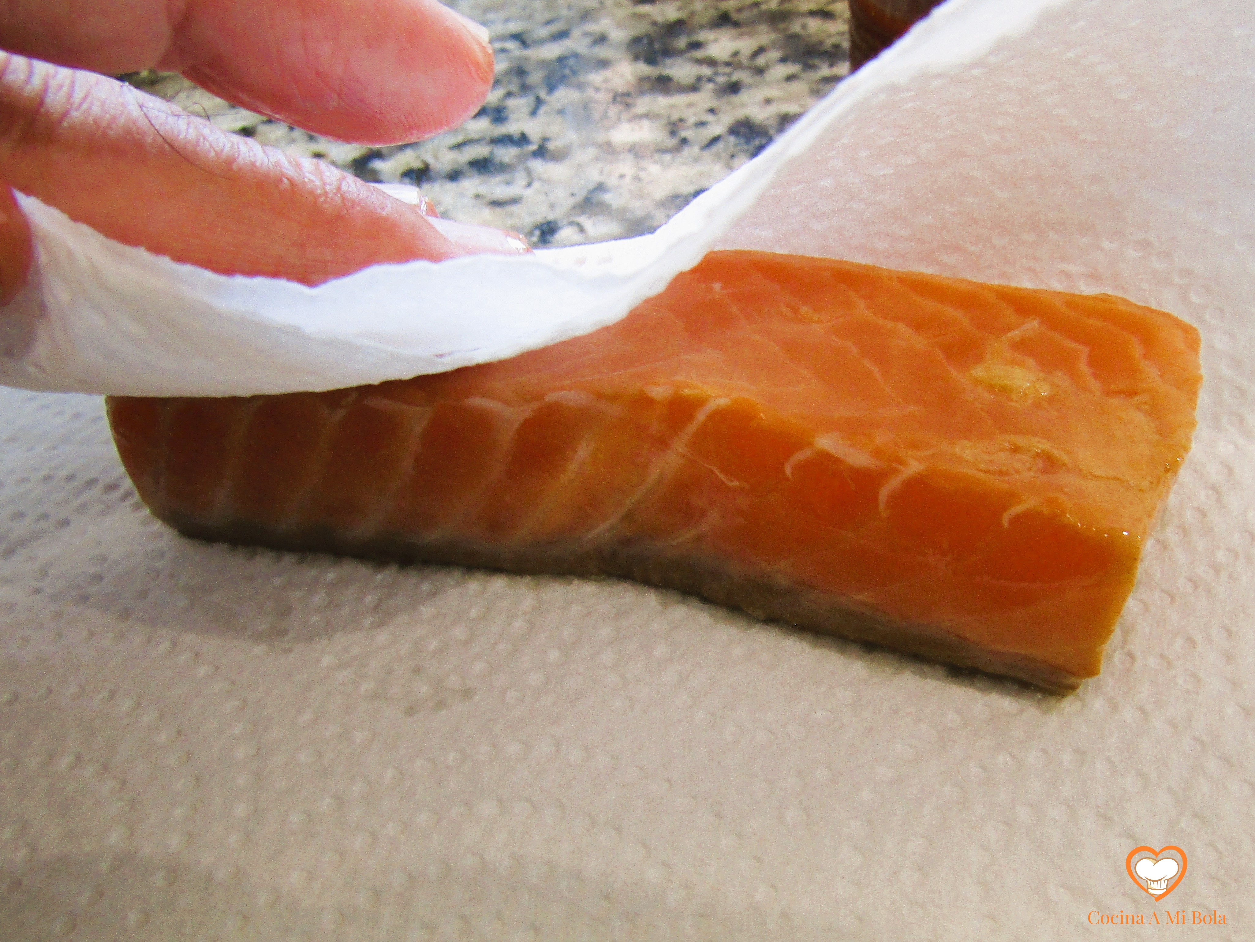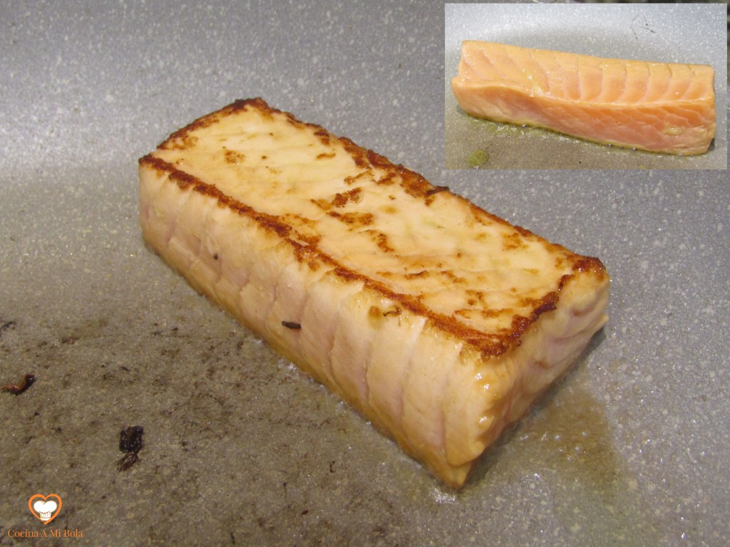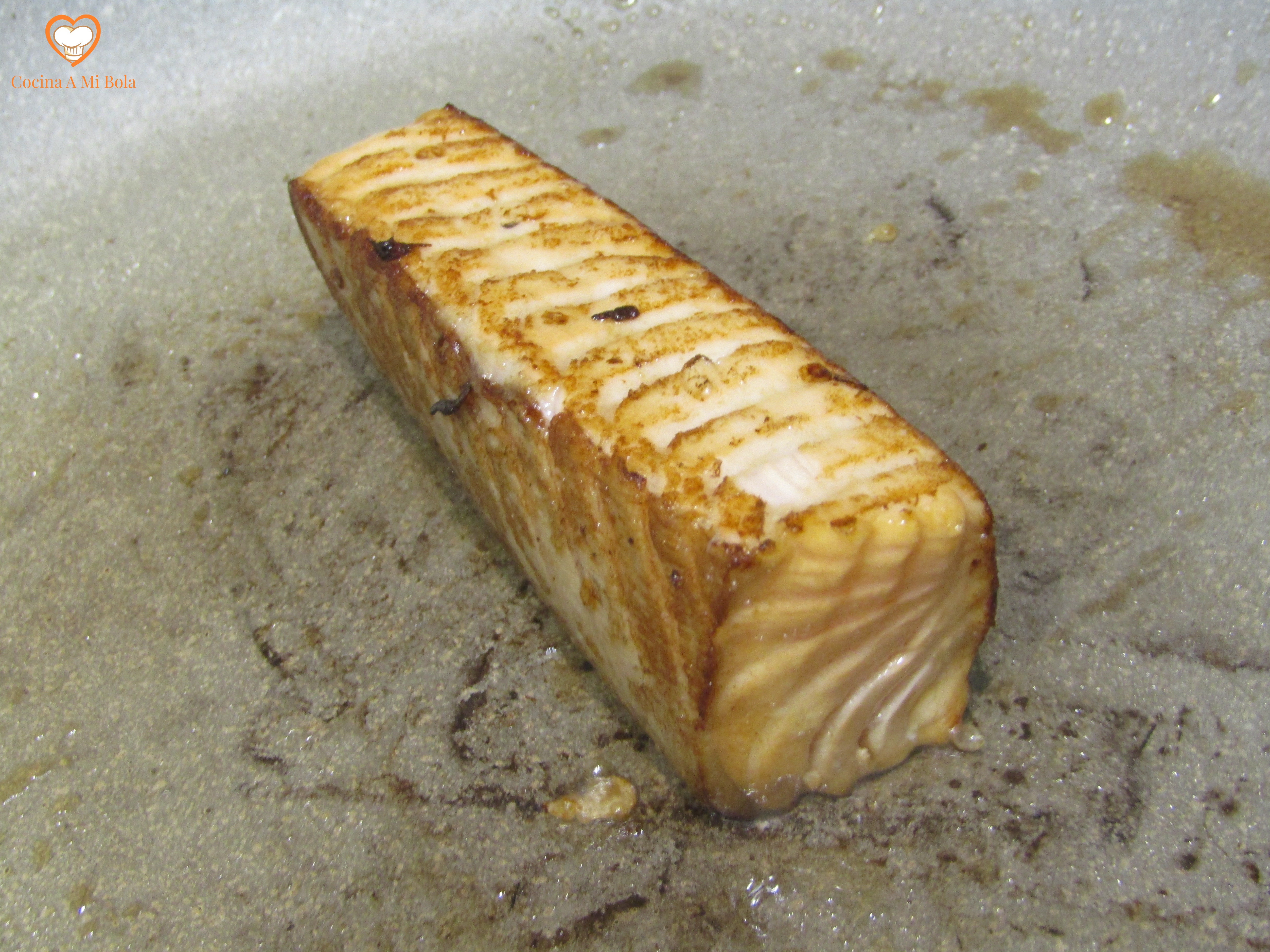 SEXTO.- Saca el pescado y sécalo con papel de cocina. Pon al fuego una sartén antiadherente o un wok. Tiene que estar muy caliente. Ahora echa una gotita o dos de aceite de sésamo, o bien de oliva y coloca justo encima la pieza de pescado. Unos diez segundos por una cara y por su opuesta y unos seis las otras dos. Sácalo con mucho mimo para que no se te rompa y déjalo templar.