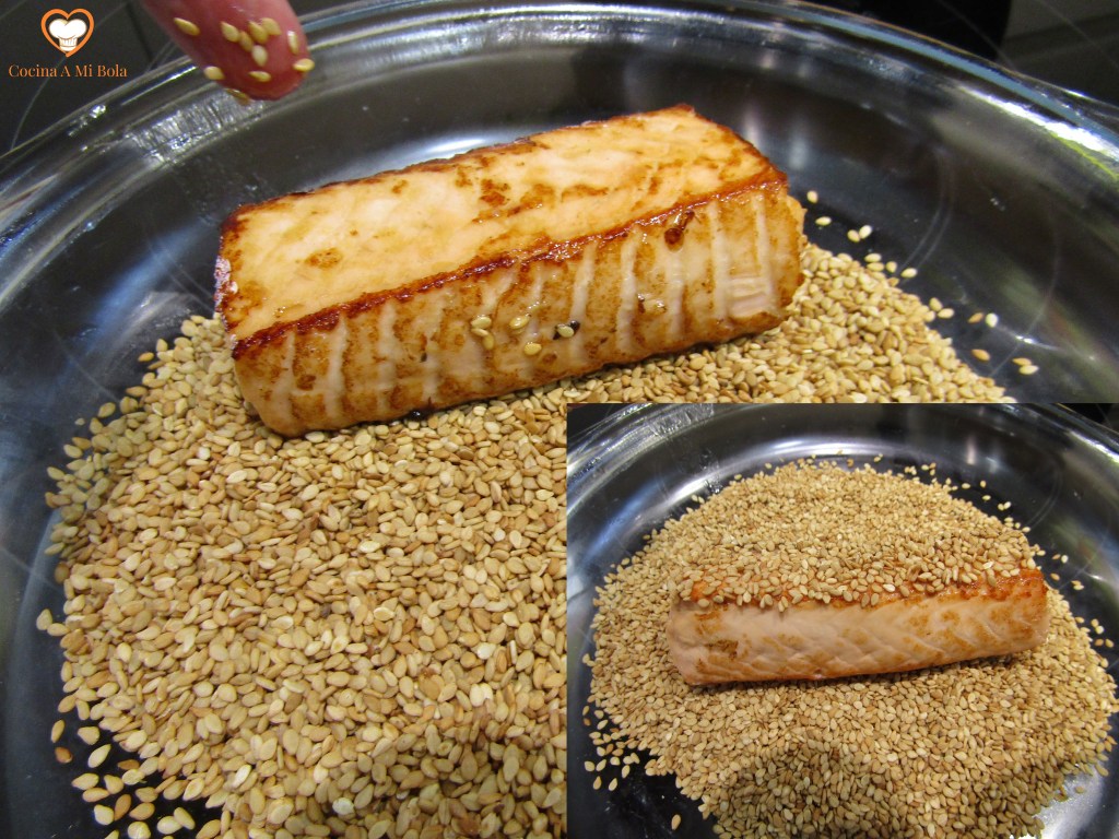 SÉPTIMO.- Extiende semillas de sésamo sobre un plato y reboza suavemente el pescado sobre ellas de modo que se adhieran uniformemente por sus cuatro lados y cuando esté ya templado, usa un cuchillo súper afilado para cortar cada taco en rodajas de no más de 1 cm.