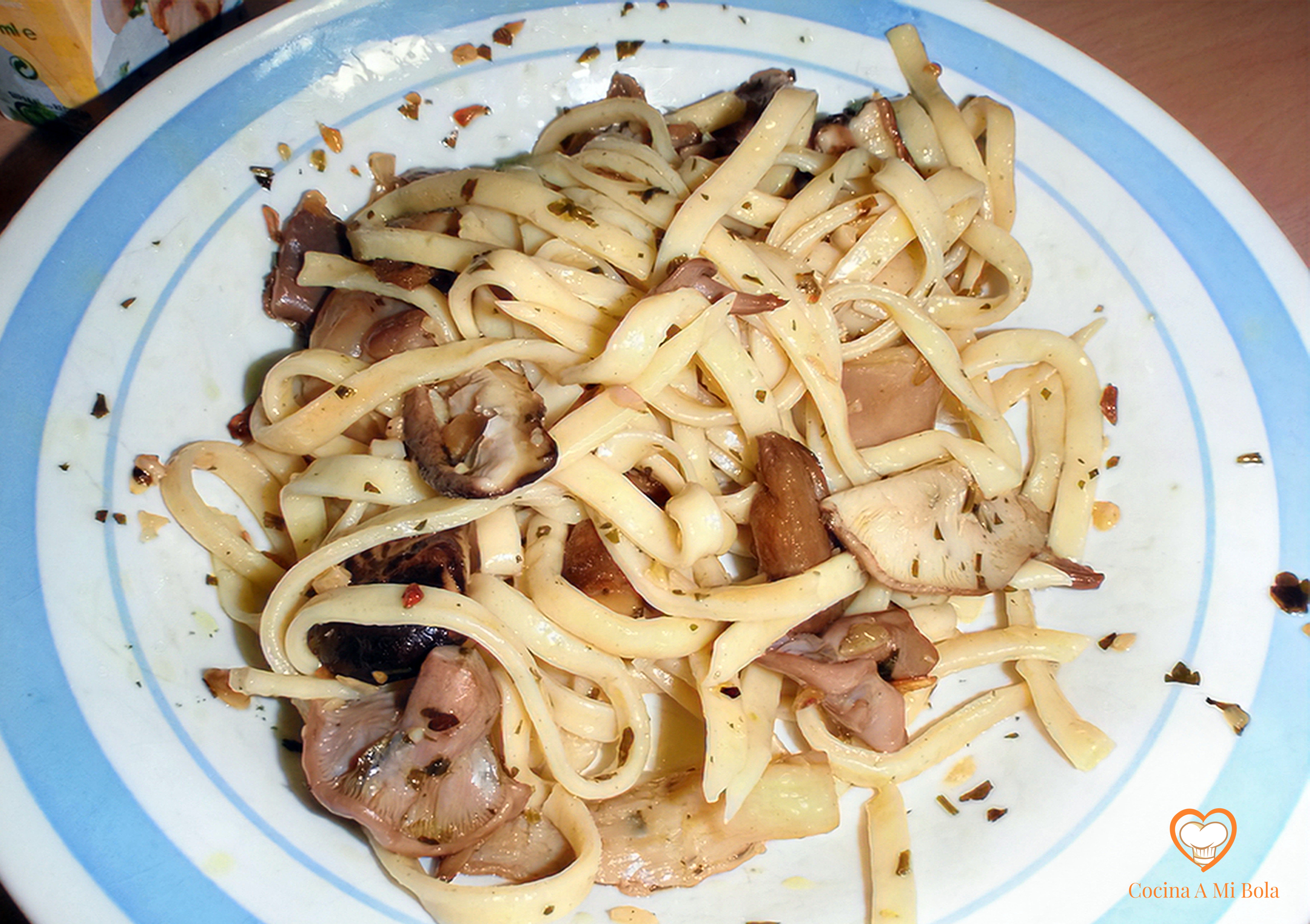 INGREDIENTES: 500 grs harina, 5 huevos, 300 grs de setas de cardo o cultivadas, 1 cebolla, 6 dientes de ajo, perejil picado, aceite de oliva virgen extra, laurel, pimienta negra molida, cayena molida y sal.