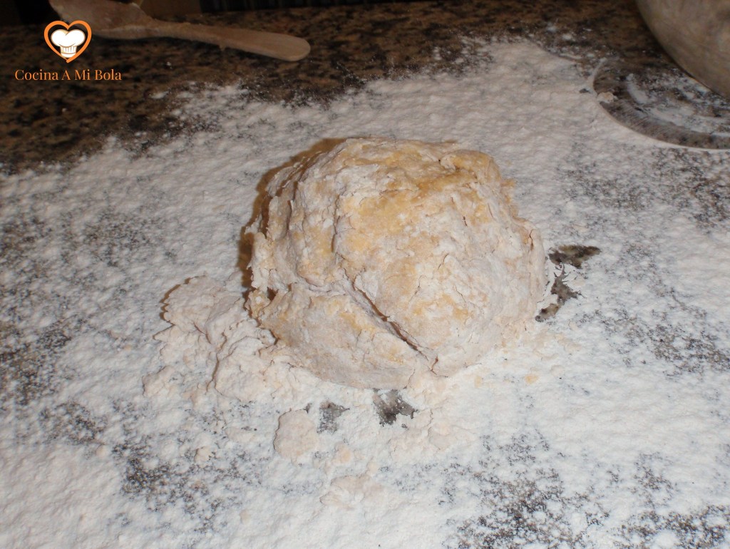 SEGUNDO.- Prepara la masa como indico en la receta citada más arriba. Es fundamental amasar mucho y amasar bien, aunque cueste. Si dispones de máquina amasadora y lo estás haciendo a mano, yo que tú me lo haría mirar por el médico. No olvides que se amasa mejor si los huevos están a temperatura ambiente y que la masa no estará bien si es pegajosa. Por otra parte, si está demasiado dura o se nos rompe, necesitará algo de líquido.