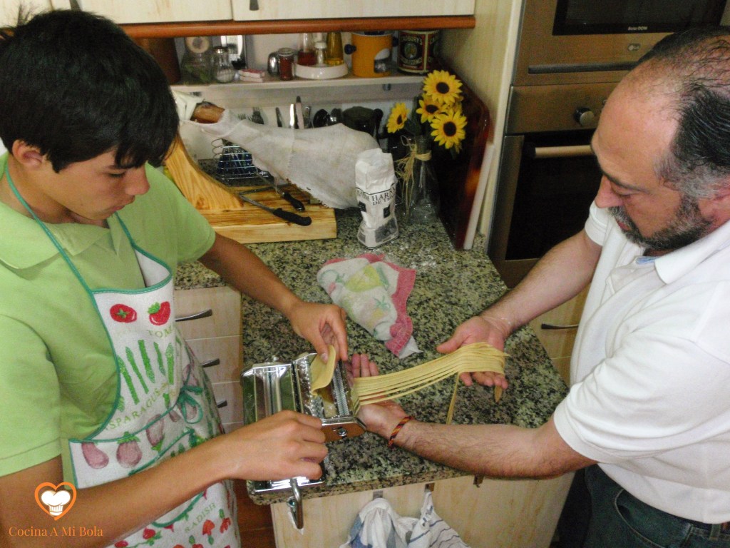 SEGUNDO.- Cuando esté lista la masa tras recuperar el resuello y volver a la respiración normal, iremos cortando trozos de masa que pasaremos por la máquina de hacer pasta poniendo el rodillo en posición 1 (dos pasadas), posición 2 (dos pasadas) y posición 6 (una pasada). Ahora lo iremos metiendo lentamente por el accesorio más fino para que salga spaghetti. Es delicado este momento porque al principio parece que no están saliendo bien, pero es cuestión de práctica y paciencia.
