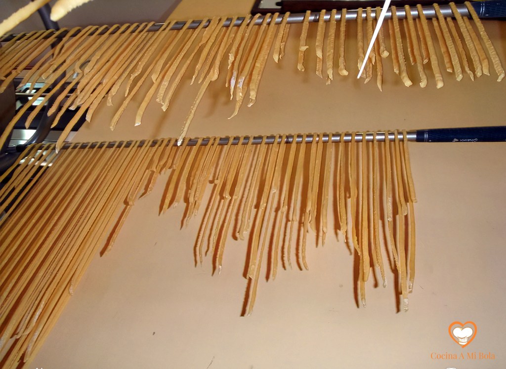 TERCERO.- A medida que vamos obteniendo los spaghetti, los vamos colocando ordenadamente sobre una barra enharinada puesta horizontalmente para que se sequen. Yo utilizo los palos de golf colocados entre dos sillas de la cocina. Deberán secar al menos una hora hasta que endurezcan.