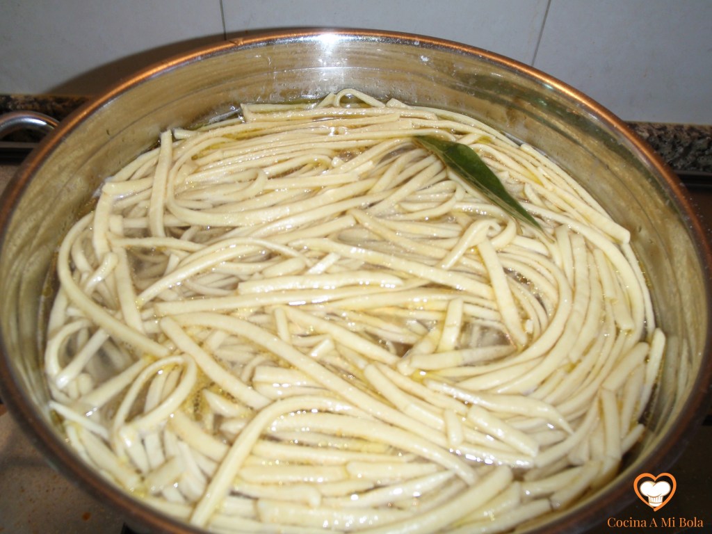 PRIMERO.- Para hacer pasta casera, podéis seguir las indicaciones que, con más detalle, he explicado en la receta de “spaghetti casero en salsa de atún”. Pero matizaré ahora que si queremos una pasta más “al dente”, no será cuestión de un menor tiempo de cocción sino del tipo de harina. En efecto, con pasta comprada es solo cuestión de menos minutos de cocción, pero como la casera se hace en dos o tres de minutos, nos deja poco margen. Solo tienes que mezclar mitad harina de trigo dura con mitad de la de grano blando. Esto entra ya dentro de una especialización que ni tengo, ni lo pretendo, así que ahí queda. Solo decir que si no queréis poner huevo, también la podéis hacer sustituyéndolo por agua. En ningún caso le pongáis sal a la masa.
