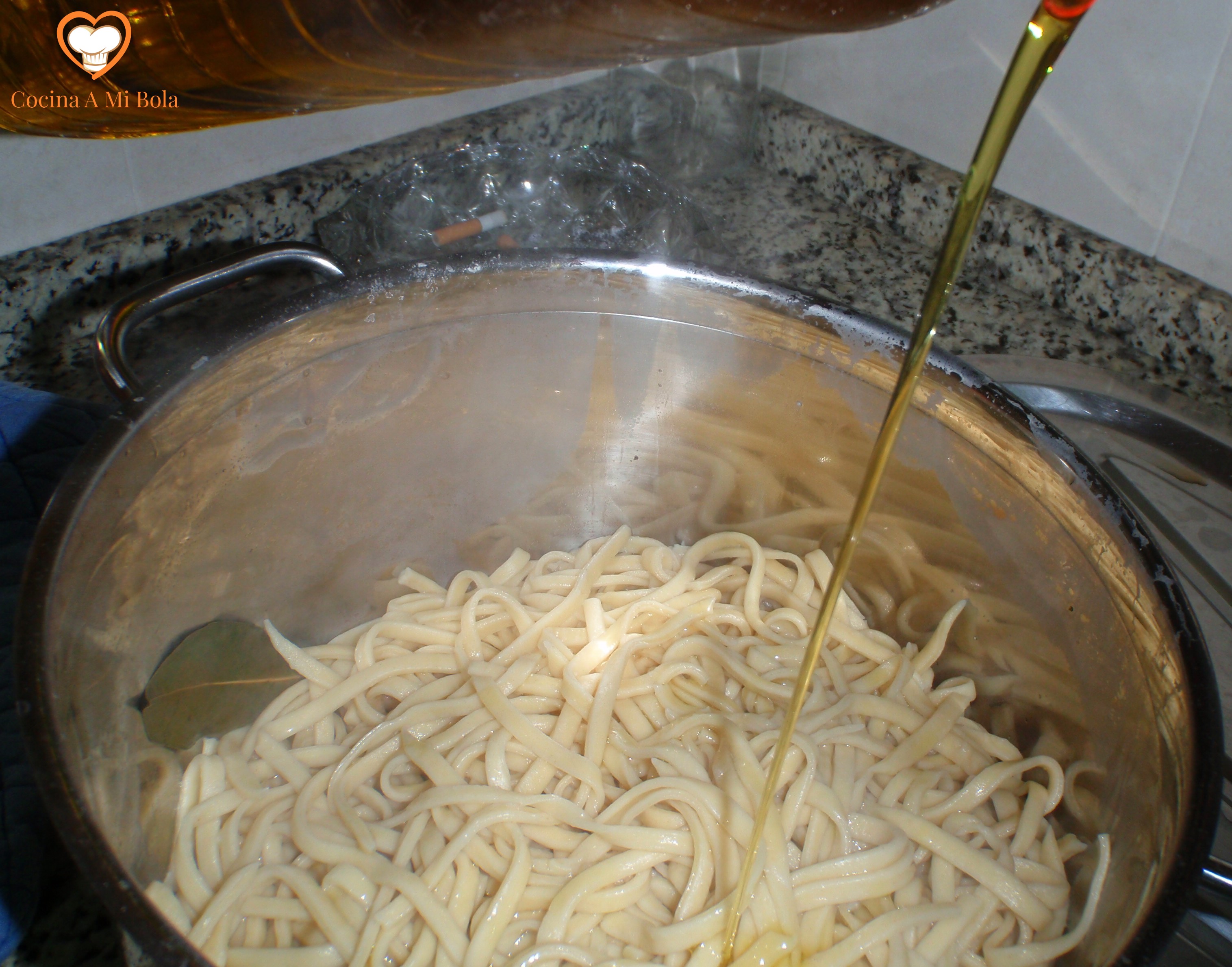 SÉPTIMO.- Cuece la pasta durante sólo tres minutos, escúrrela enseguida y ponle un poquito de aceite de oliva virgen extra para que no se pegue.