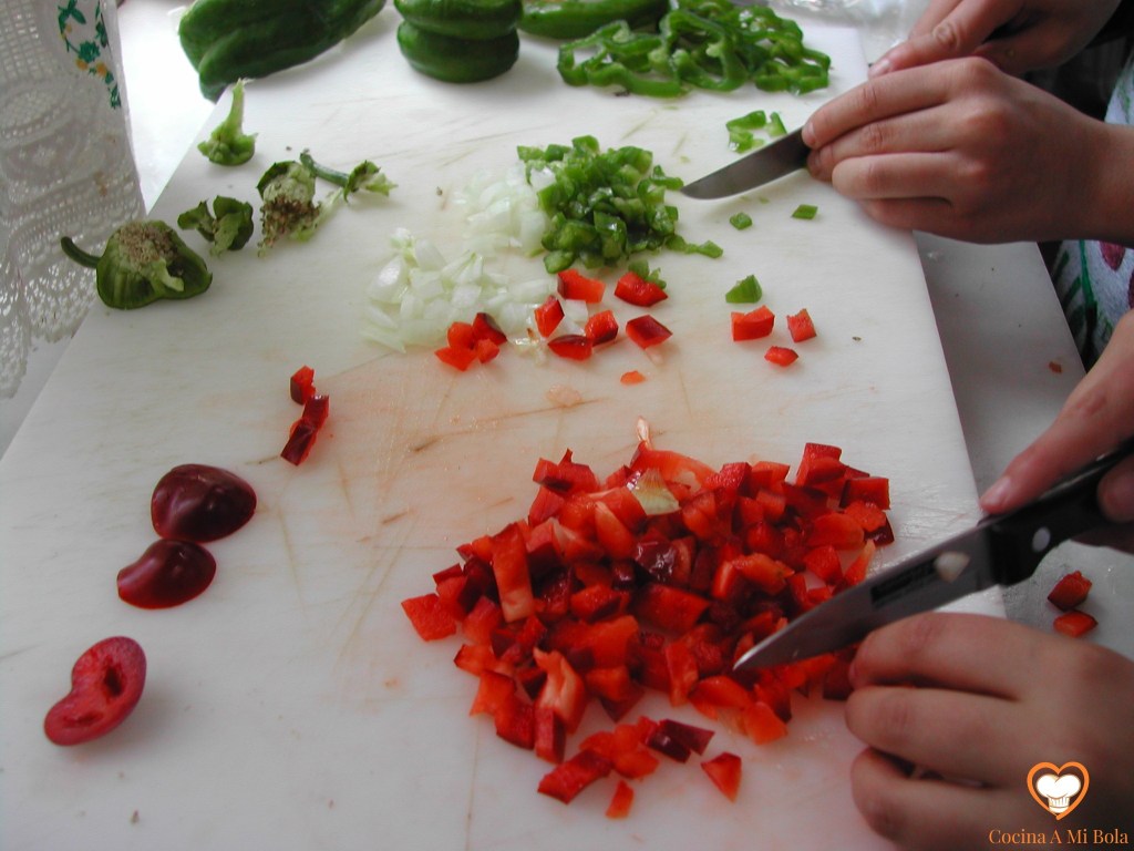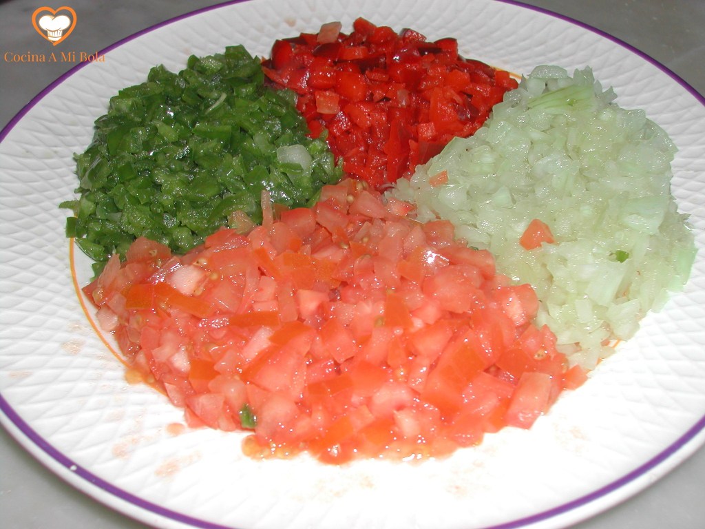 CUARTO.- Mientras se enfrían las huevas, haremos la vinagreta. Cortaremos muy finamente la cebolla, los pimientos rojos y verdes, los tomates y las aceitunas. Lo mezclaremos bien y lo aliñaremos con aceite de oliva virgen extra, sal, pimienta negra molida y vinagre de Jerez (no demasiado, a pesar del nombre del plato).