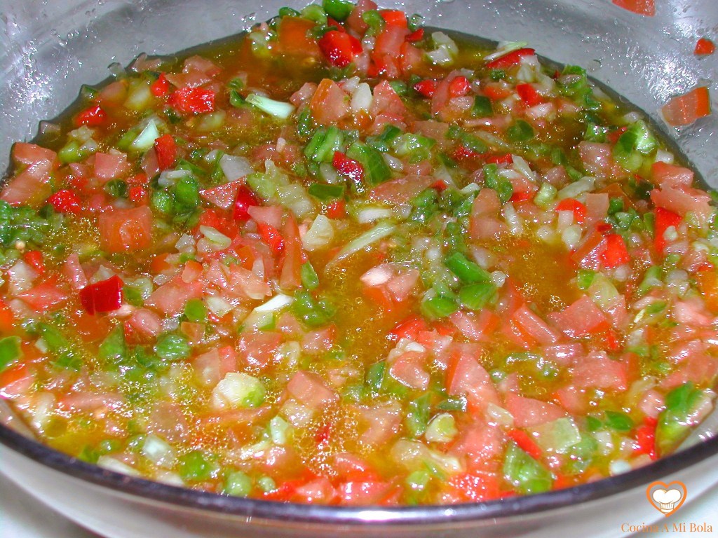 QUINTO.- El secreto de una buena mezcla de sabores es su maceración. Para ello, una vez aliñado, mezclaremos los ingredientes de un modo constante y prolongado para que se nos haga una “salsita” amalgamada a base de los jugos de cada una de las hortalizas que la componen.