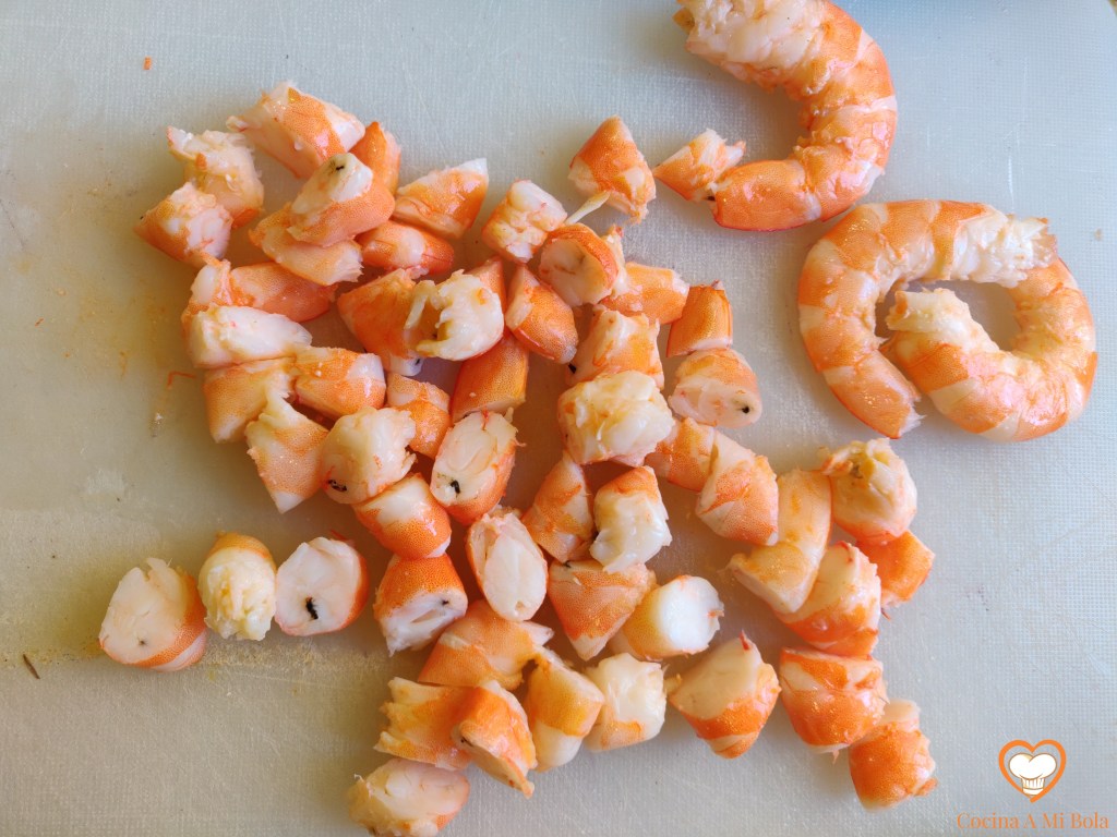 TERCERO.- Pela los langostinos bien, asegurándote de que no se queda ningún trozo de cáscara, particularmente en el vientre. Reserva dos o tres para decorar si quieres, y córtalos en trozos más grandes que todo lo demás, para que destaquen sobre los demás ingredientes.