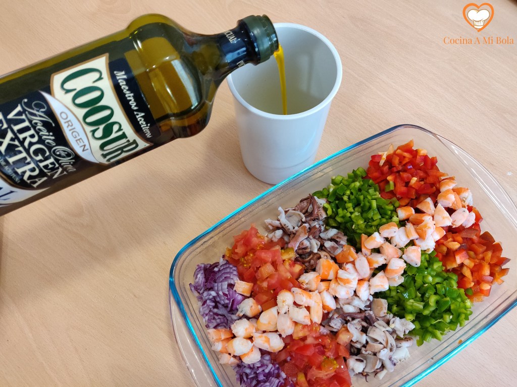 QUINTO.- Mezcla todos los ingredientes y ponle la vinagreta. Vuelve a mezclar muy bien para que todo se impregne del sabor y aroma de esta salsa.
