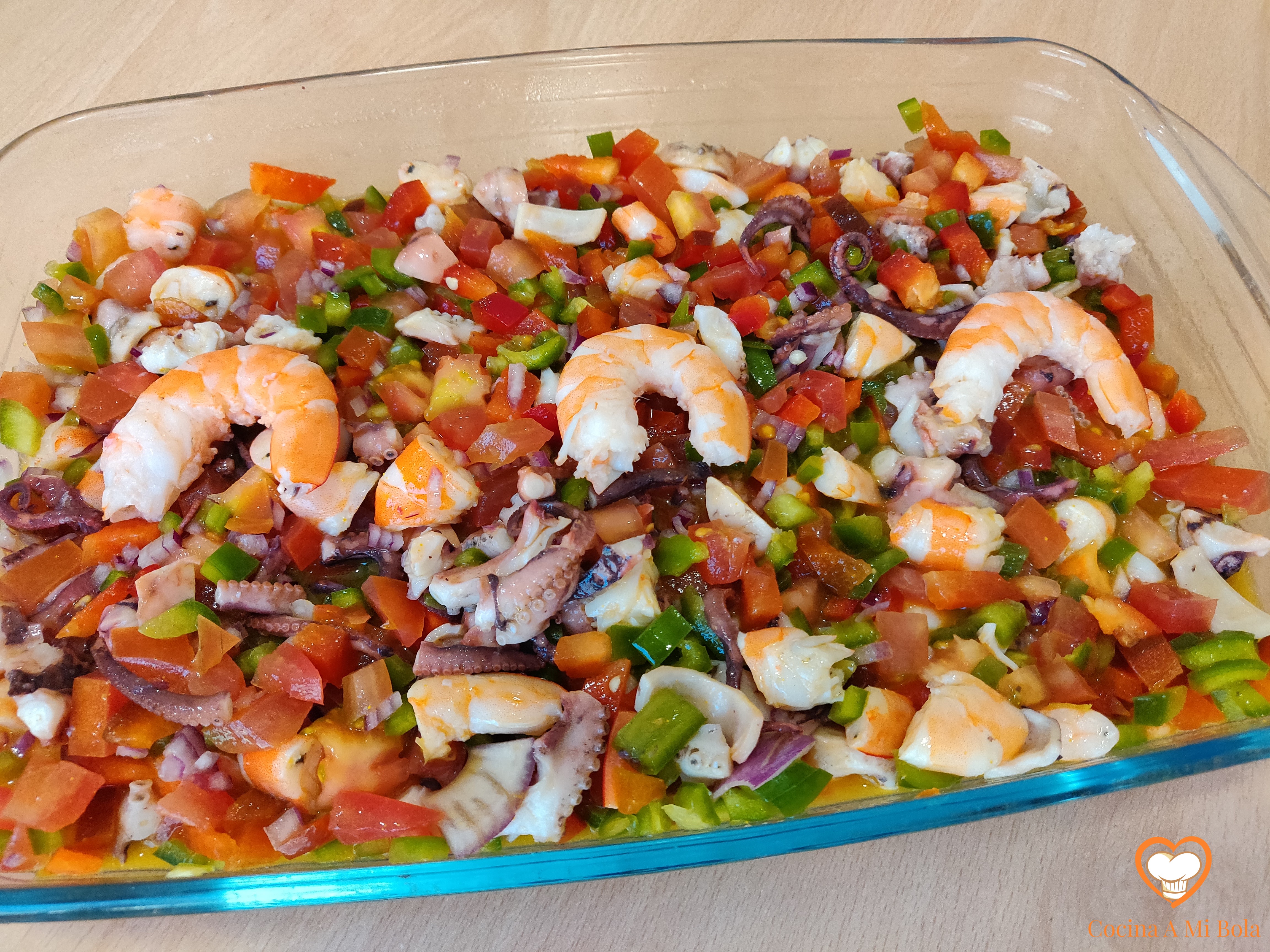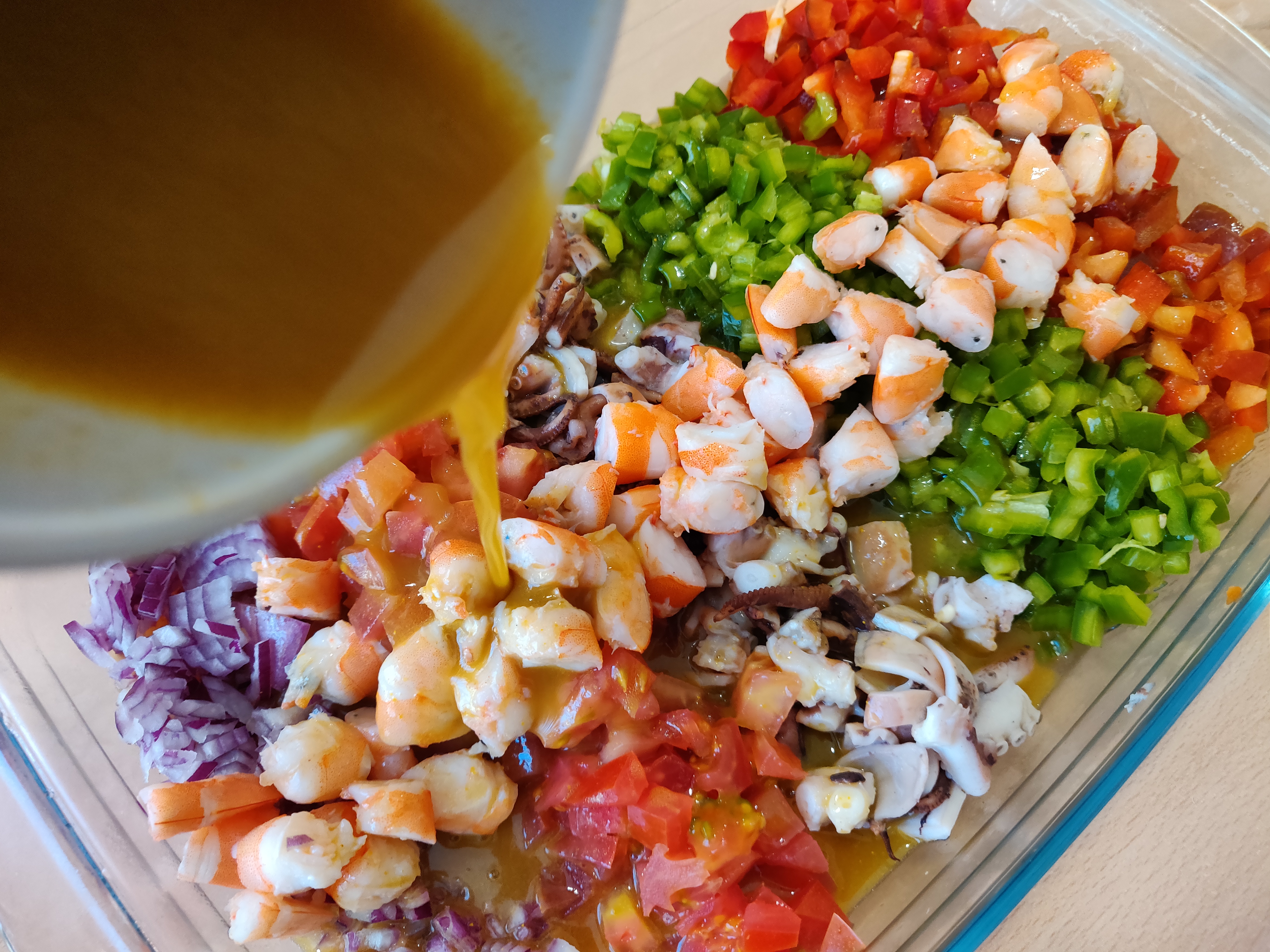 INGREDIENTES: Para 6 personas. 600 gr pulpitos, 12 langostinos cocidos grandes, 1 pimiento rojo, 1 pimiento verde, 1 cebolla morada, 2 tomates. Para la vinagreta: 125 ml aceite de oliva virgen extra, 75 ml vinagre de Jerez, 1 diente de ajo, 50 ml vino fino o Jerez seco, una cucharada sopera de vinagre de Módena, 1 cucharada sopera de salsa de soja, 2 cucharadas soperas de mostaza amarilla, sal y 60 ml agua.