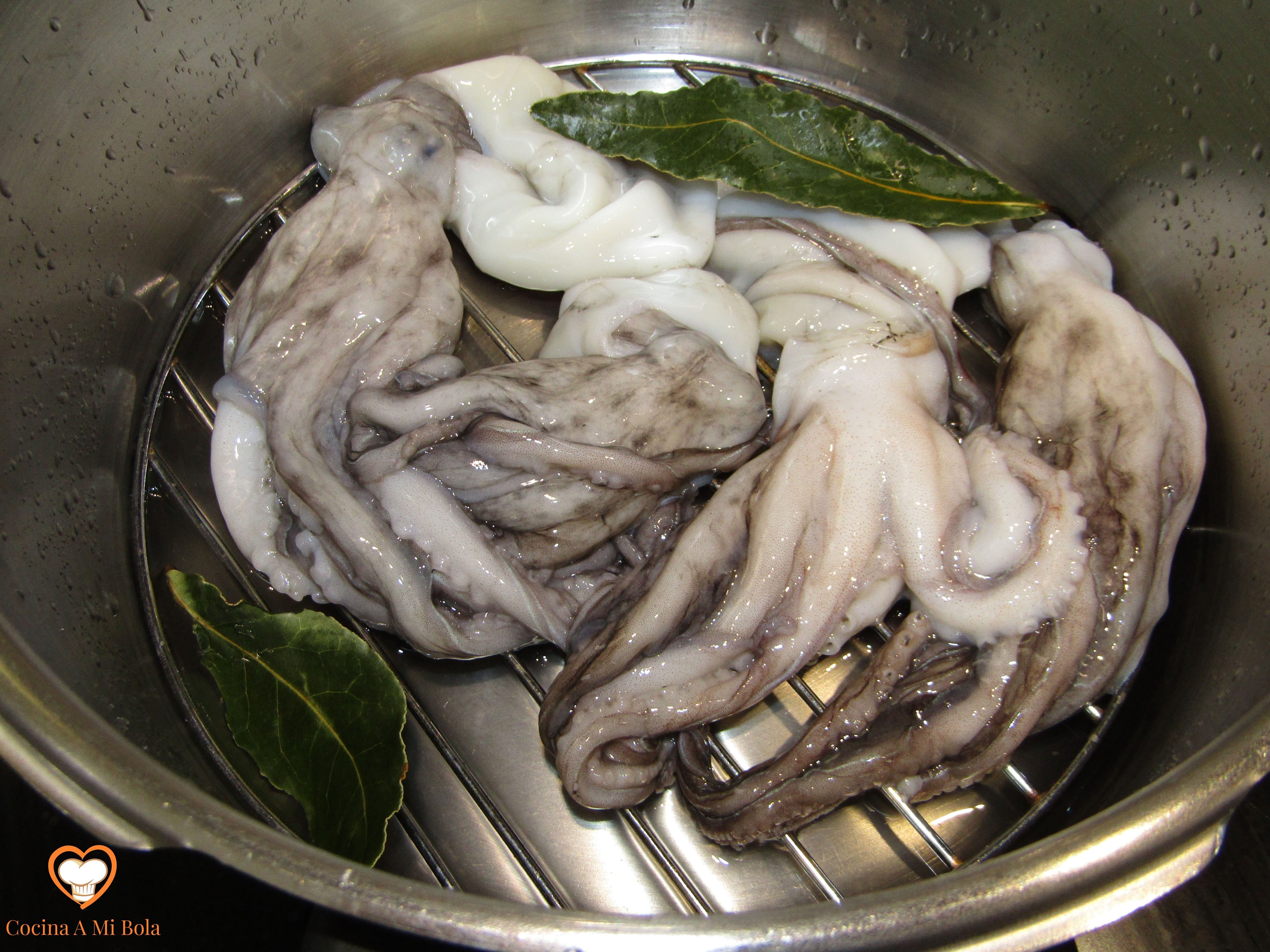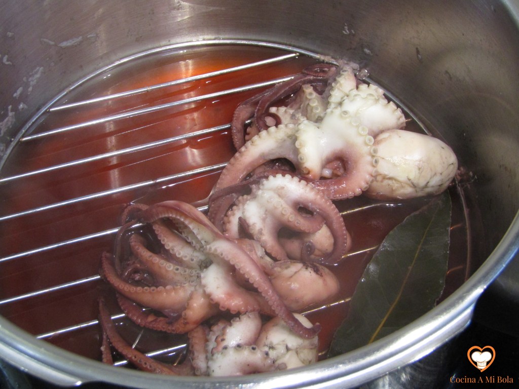 PRIMERO.- Limpia bien los pulpitos, si es que no te los han limpiado en la pescadería. Lávalos bien bajo el grifo y ponlos en una olla express con dos hojas de laurel y no mucha agua. Con que los cubra será suficiente. Cierra la olla y cuécelos durante unos 10 minutos. Abre la olla y déjalos enfriar en ella.