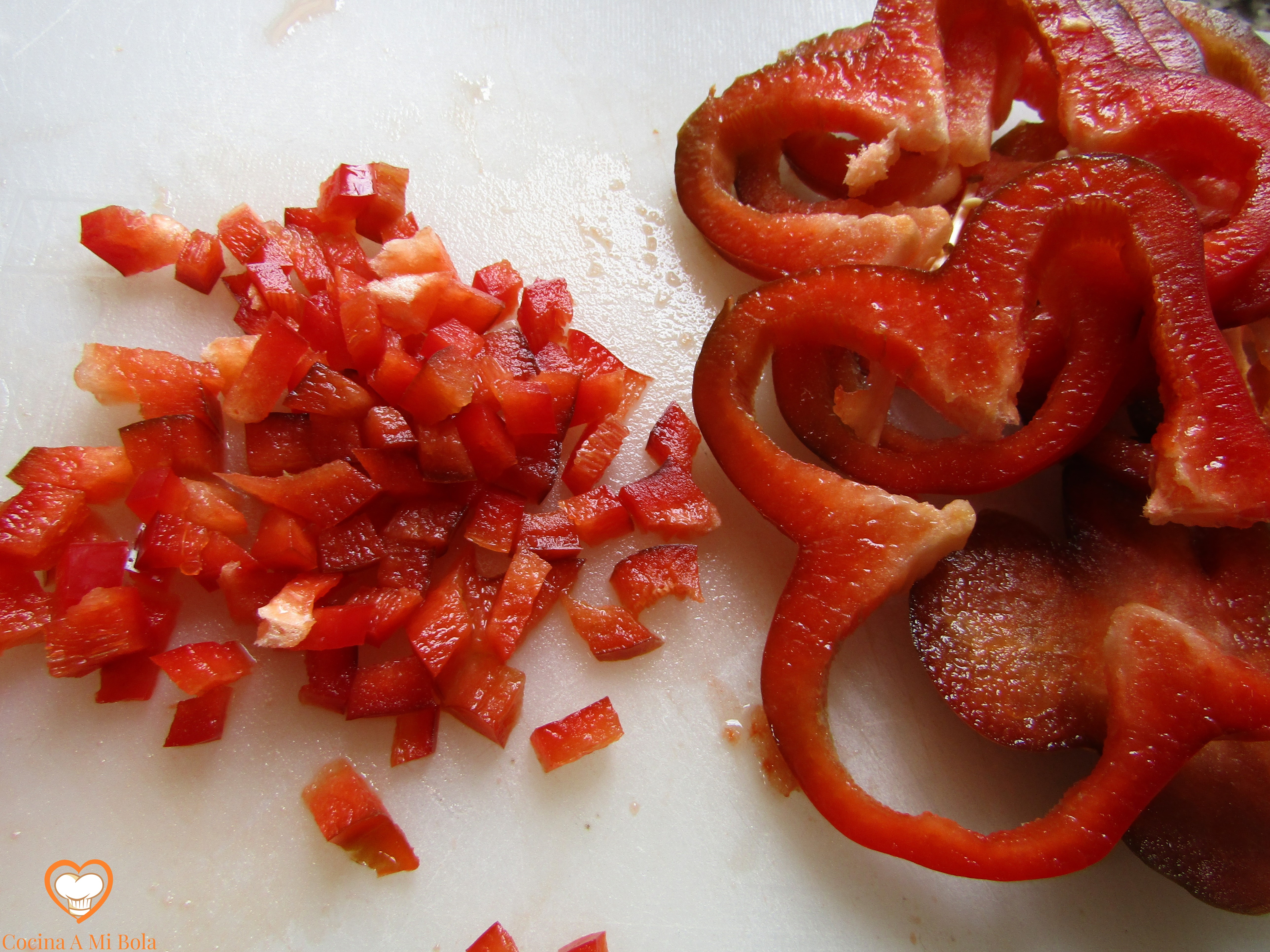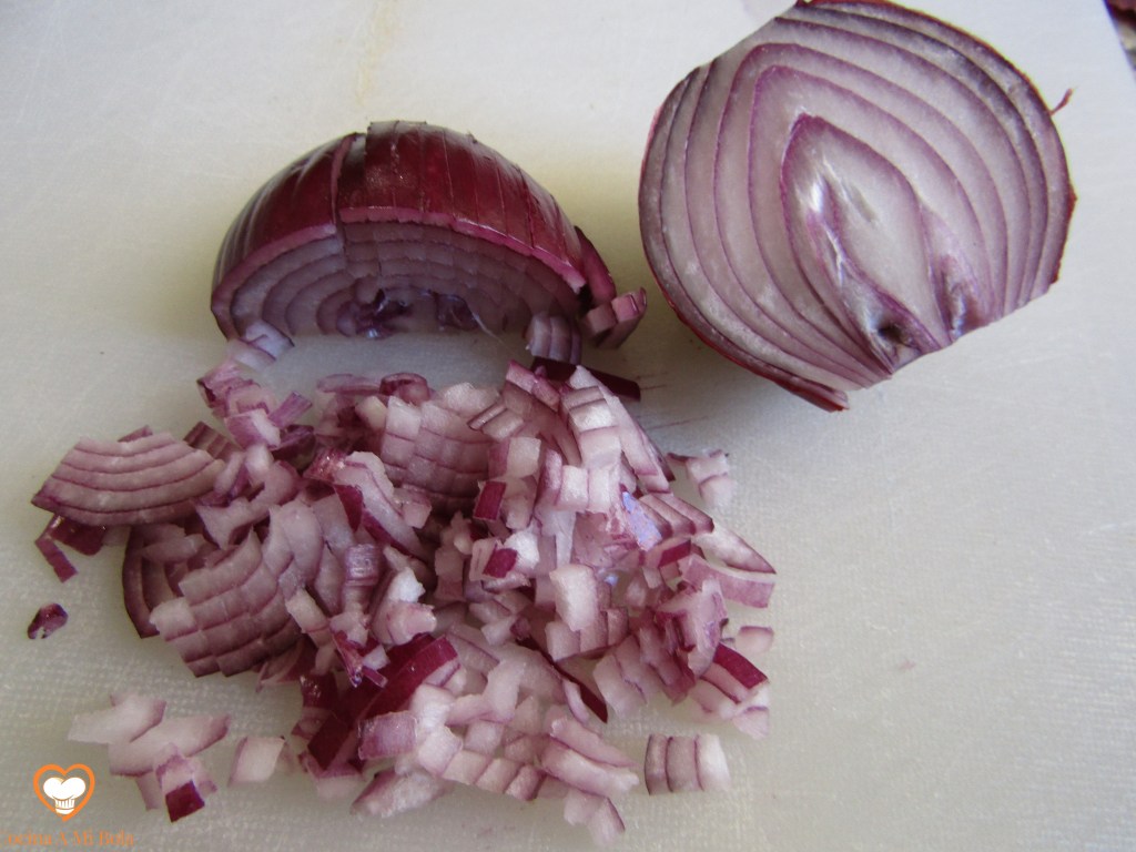 SEGUNDO.- Lava bien las hortalizas, pela las cebollas y pica todo en daditos no muy grandes excepto la cebolla, que será mejor picarla algo más porque podría picar. Yo, para presentarlo, coloco todos los ingredientes en una fuente separados y los mezclo al final. Pero lógicamente, esto no es necesario si vas a presentarlo ya mezclado.
