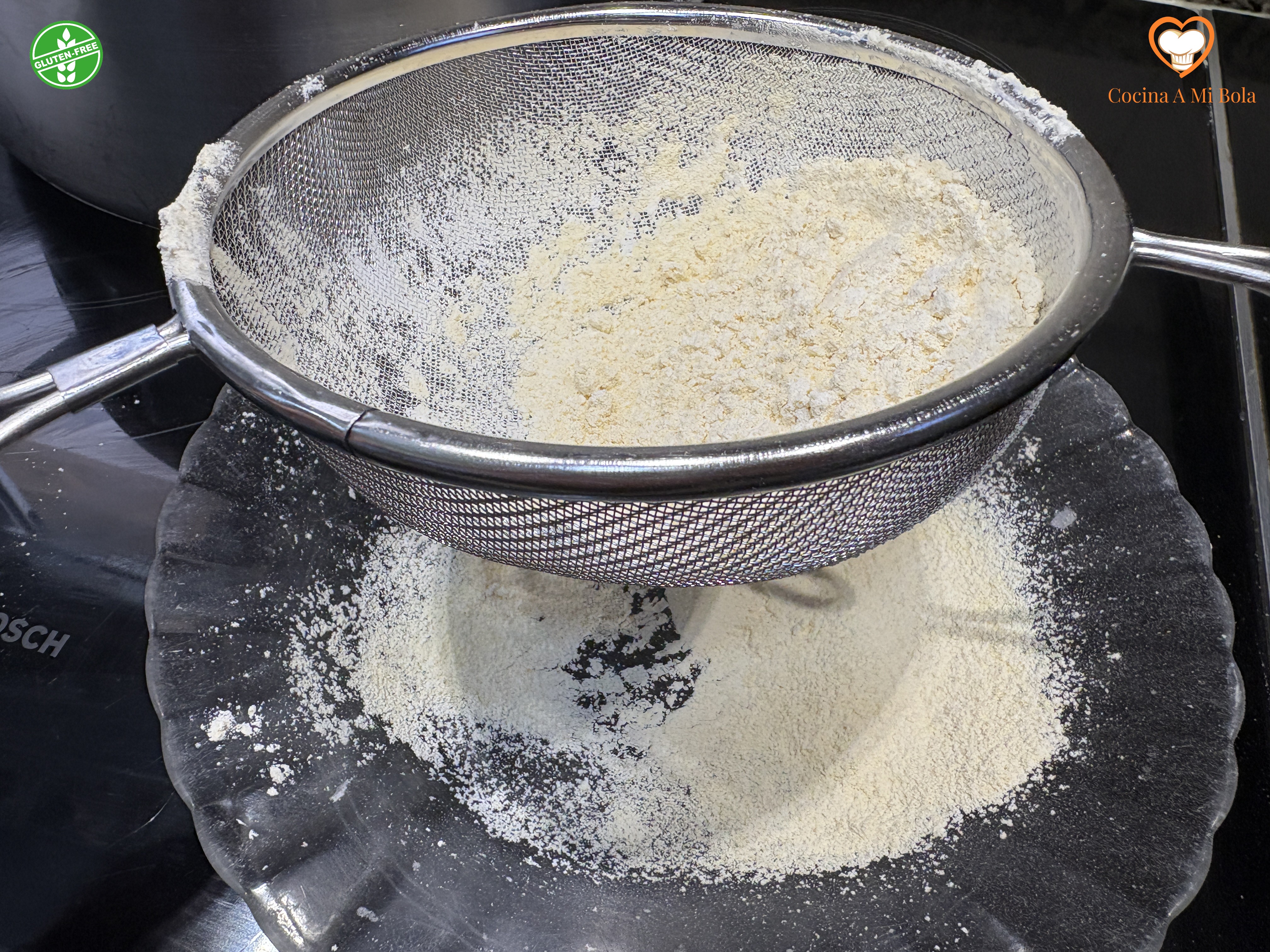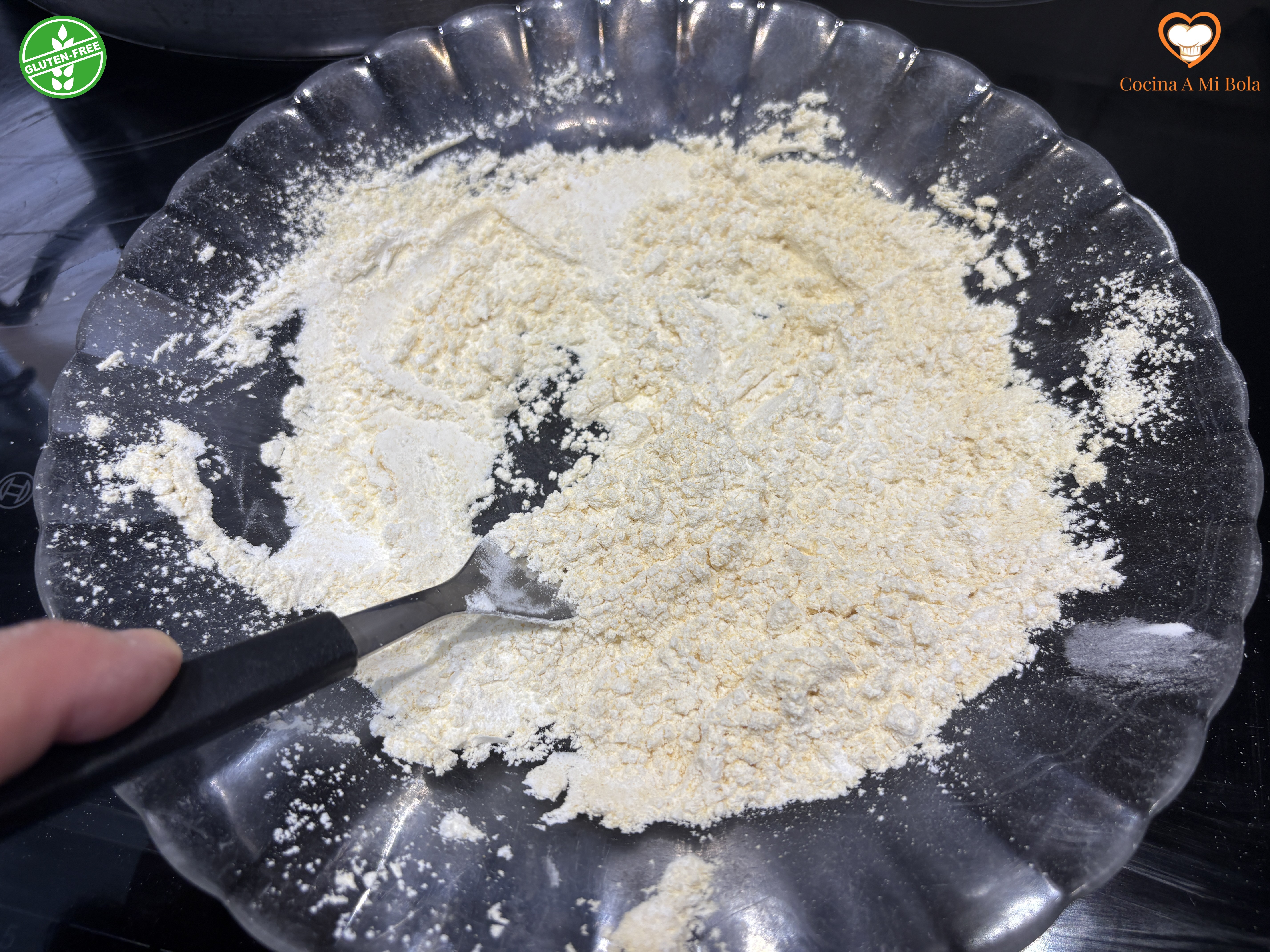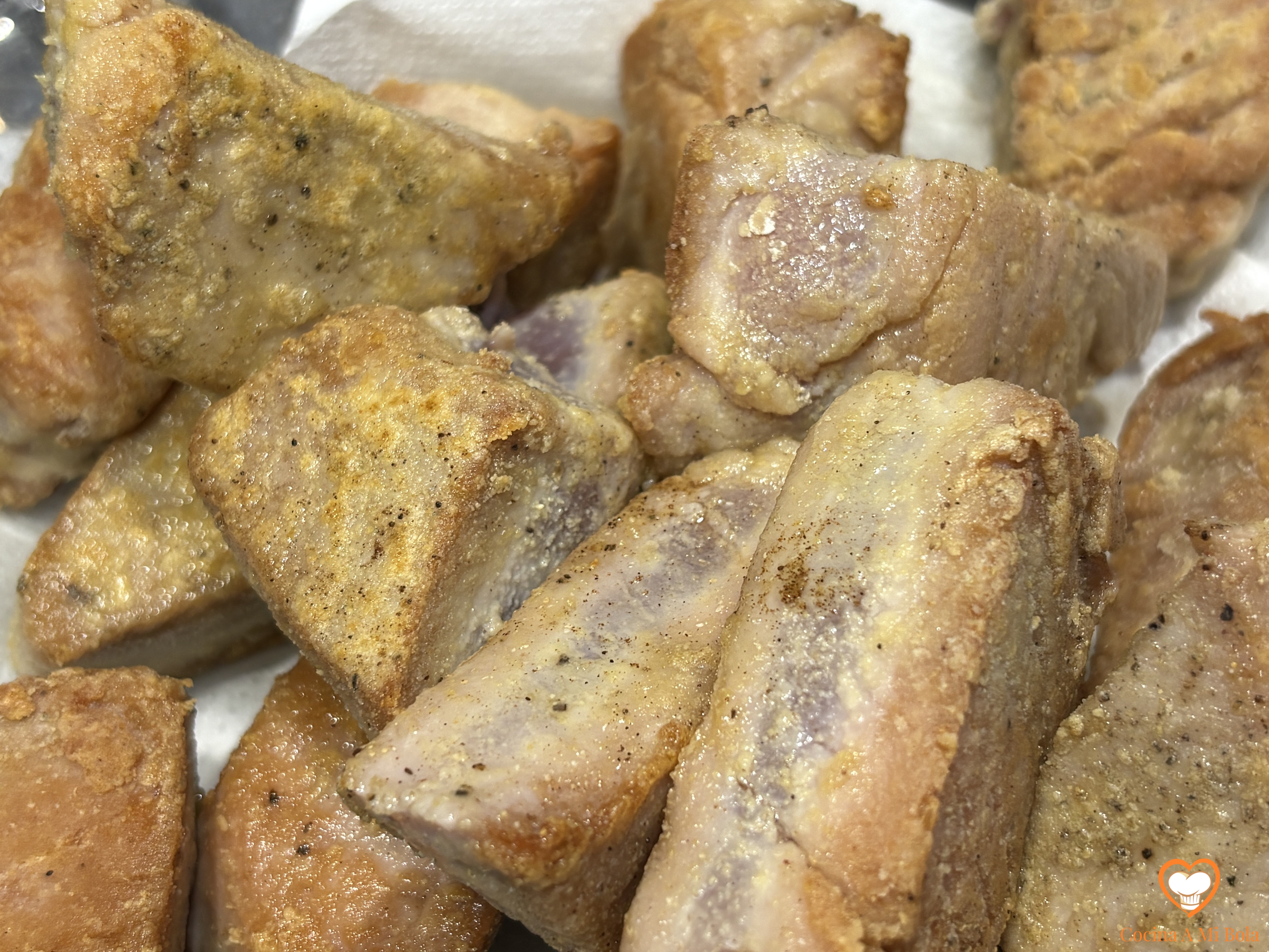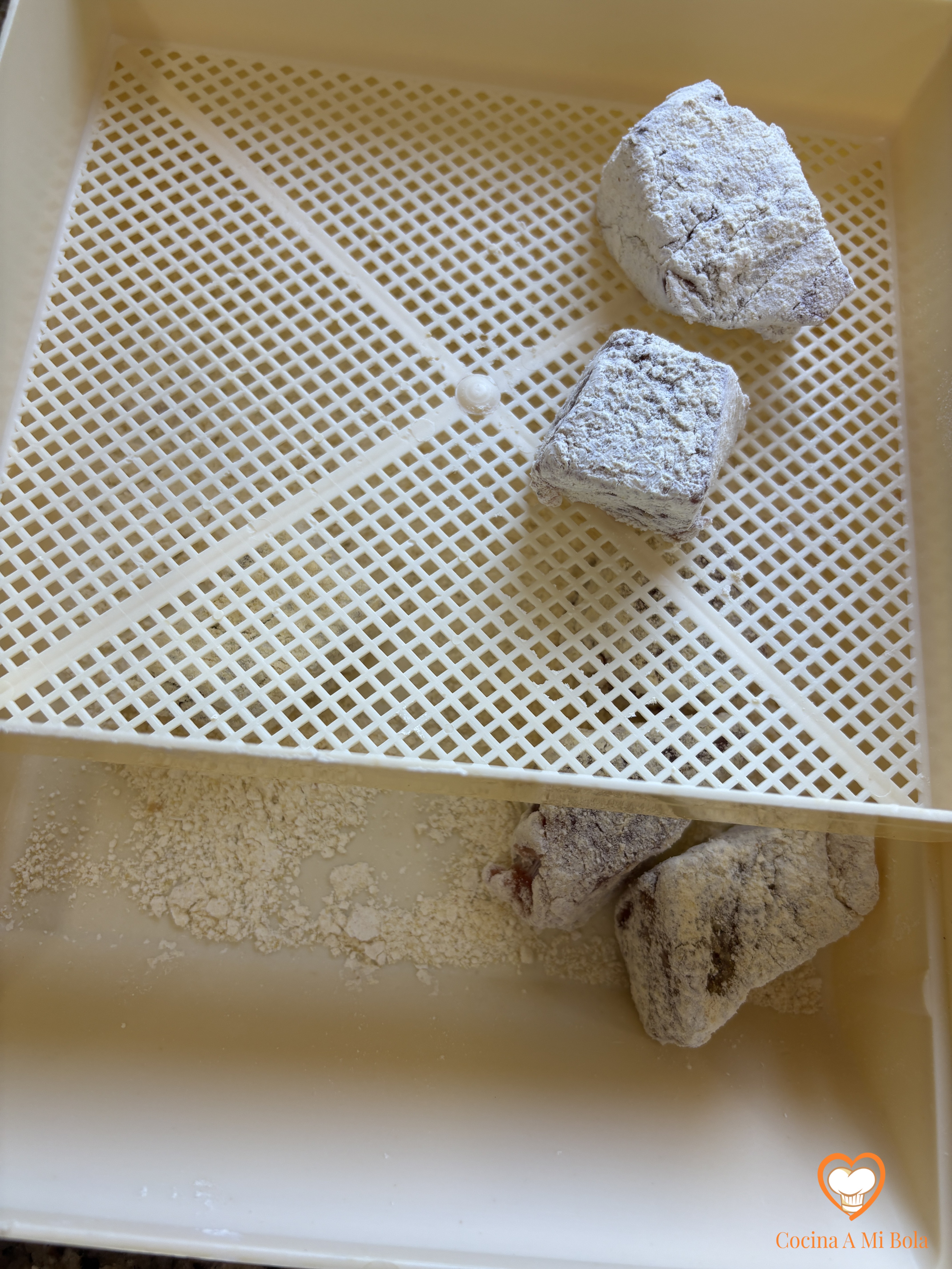PRIMERO.- Cortamos el atún en tacos grandecitos y los salpimentaremos por todas sus caras. Ahora mezclaremos bien ambas harinas y las tamizaremos juntas. Utilizamos estas harinas por doble motivo: el primero, porque de este modo, hacemos el plato apto para celiacos, lo que no es poca cosa hoy en día. Y el segundo motivo; porque la harina de garbanzo tuesta con un color dorado estupendo y queda crujiente. La de arroz es precisamente para suavizar el exceso de crujiente que la de garbanzo sólo nos daría al pescado. Si no prevés tener celíacos a la mesa, puedes utilizar tranquilamente la harina de trigo habitual.