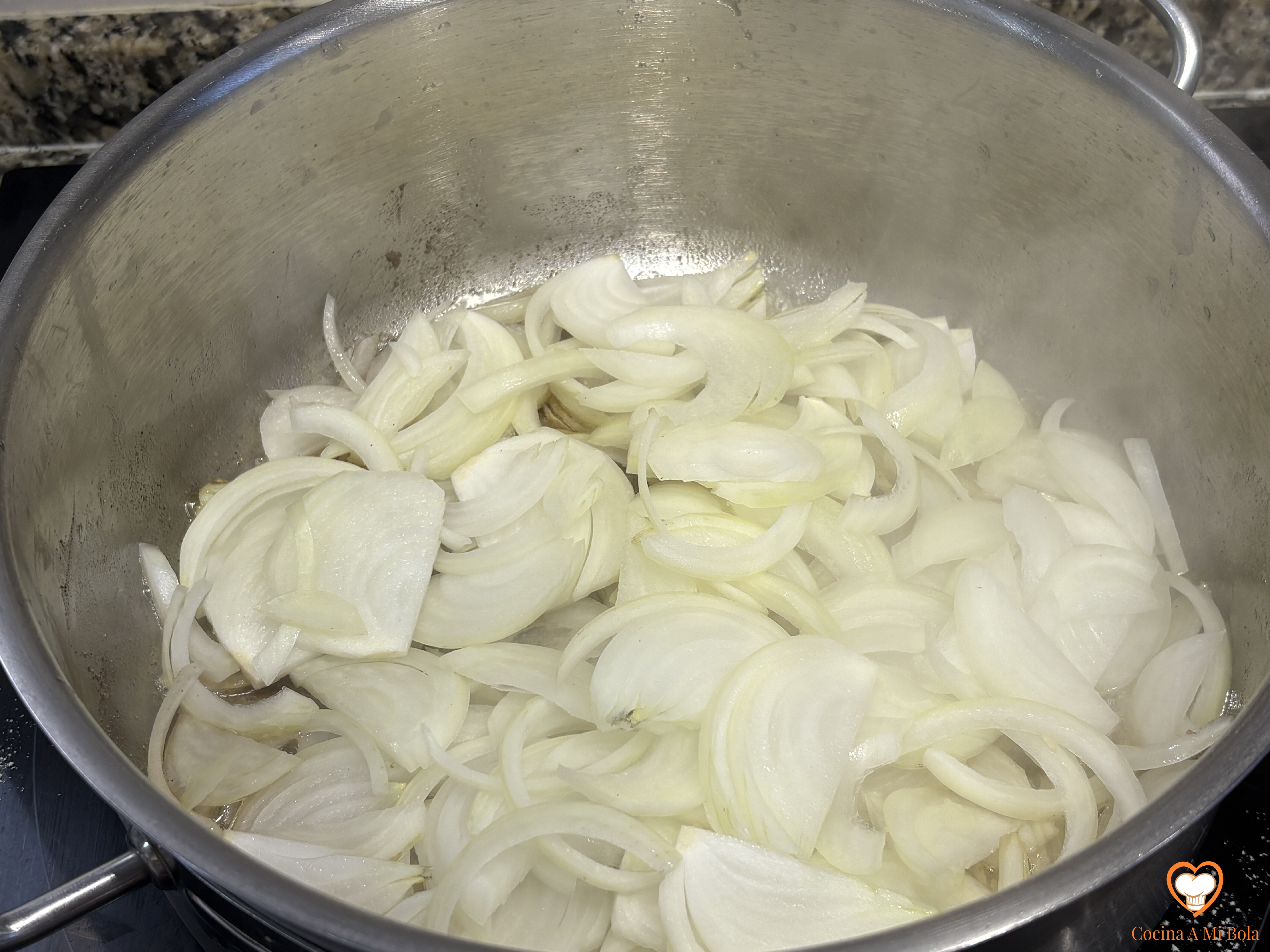 CUARTO.- Fuego fuerte al principio mientras removemos para que todo se impregne de aceite y al cabo de un par de minutos bájalo para dejarlo a medio gas. Queremos que la cebolla tome ese tono moreno pero sin que se queme y sin que pierda mucha agua ni reduzca demasiado su volumen. Añade un poco de perejil picado.