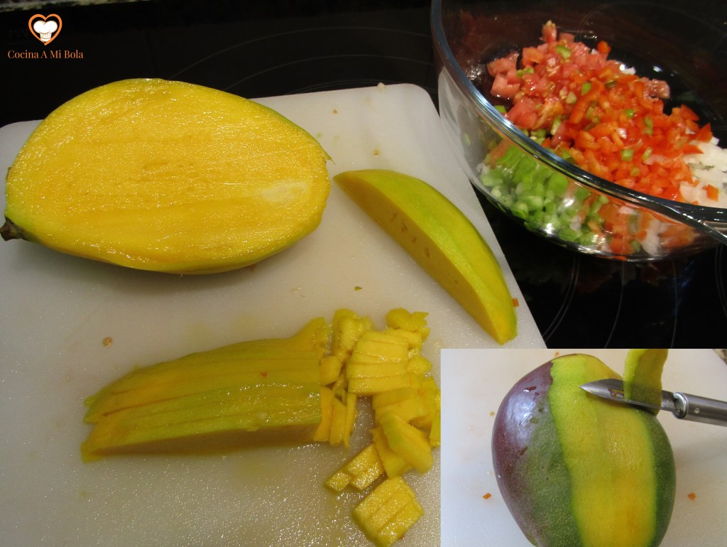 SEGUNDO.- Ahora vamos a dejar listas ciertas preparaciones que necesitaremos tener después. Así que vamos a sacar el pescado del agua, lo escurrimos y lo secamos muy bien con papel absorbente o incluso con un trapo, y lo reservamos. Pelamos los ajos, picamos fino la cebolla, le quitamos la piel al pimiento asado, retiramos el pedúnculo y las semillas y lo cortamos en tiras. Ponemos una buena cantidad de harina de