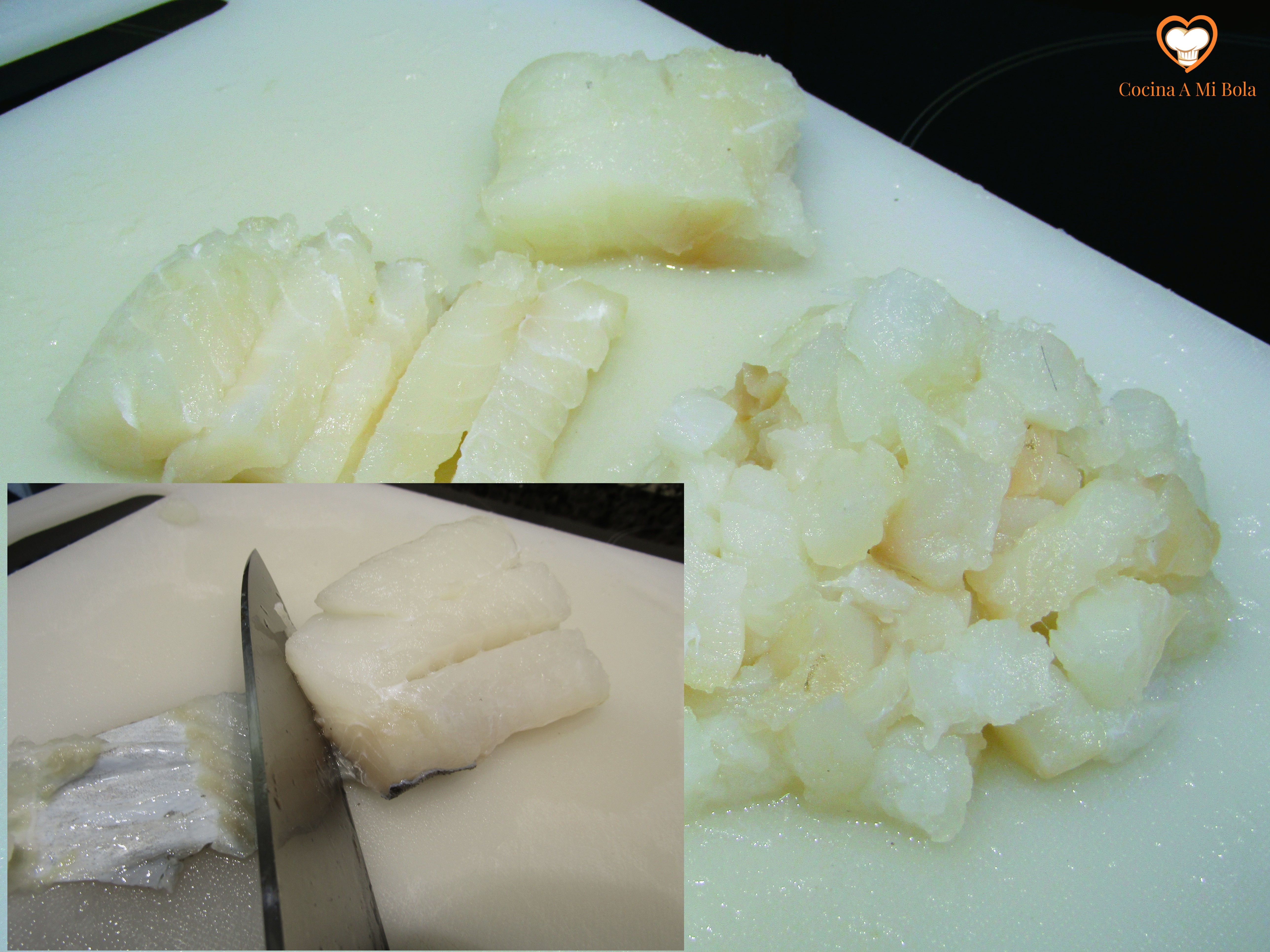 SEGUNDO.- Ahora vamos a dejar listas ciertas preparaciones que necesitaremos tener después. Así que vamos a sacar el pescado del agua, lo escurrimos y lo secamos muy bien con papel absorbente o incluso con un trapo, y lo reservamos. Pelamos los ajos, picamos fino la cebolla, le quitamos la piel al pimiento asado, retiramos el pedúnculo y las semillas y lo cortamos en tiras. Ponemos una buena cantidad de harina de