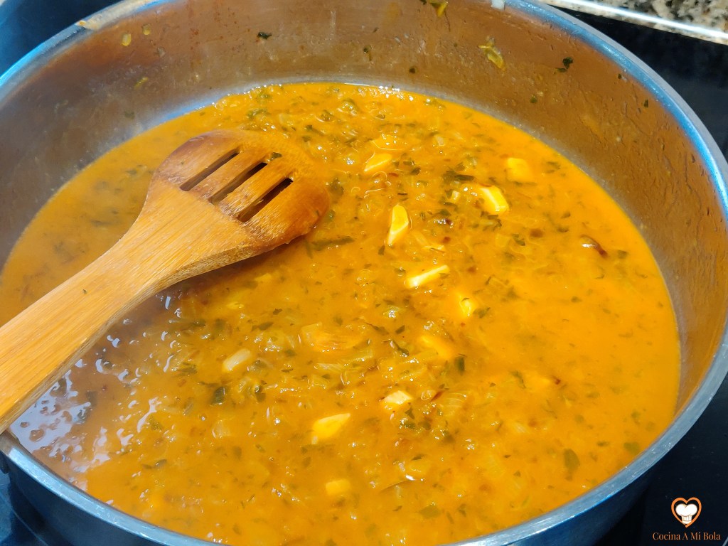 QUINTO.- Cuando veas que la harina va poniéndose de un tono más bien moreno, remueve todo y agrega el vino blanco sin dejar de remover para que ambos hagan cuerpo y espese. No te preocupes si queda demasiado espesa, porque el berberecho soltará el agua que le falta. Sube un poquito el fuego para que evapore el alcohol, agrega el pimentón y mezcla bien.