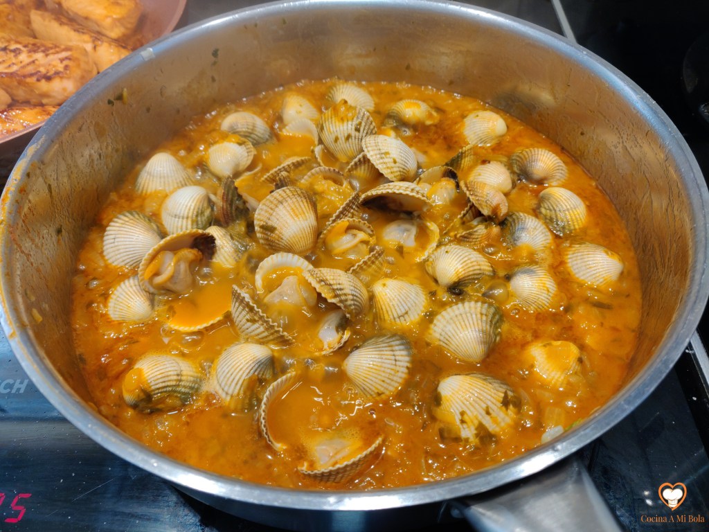 SEXTO.- Ahora añade los berberechos, remueve para que se distribuyan bien y pon la tapa. En este momento te estás jugando el resultado porque se hacen enseguida con el vapor. Verás cómo se empiezan a abrir todos y habrás de estar muy atento porque en el mismo momento en el que se abren hay que apagar el fuego. Si los tienes más de la cuenta, empezarán a reducir su tamaño hasta que no quede prácticamente nada.