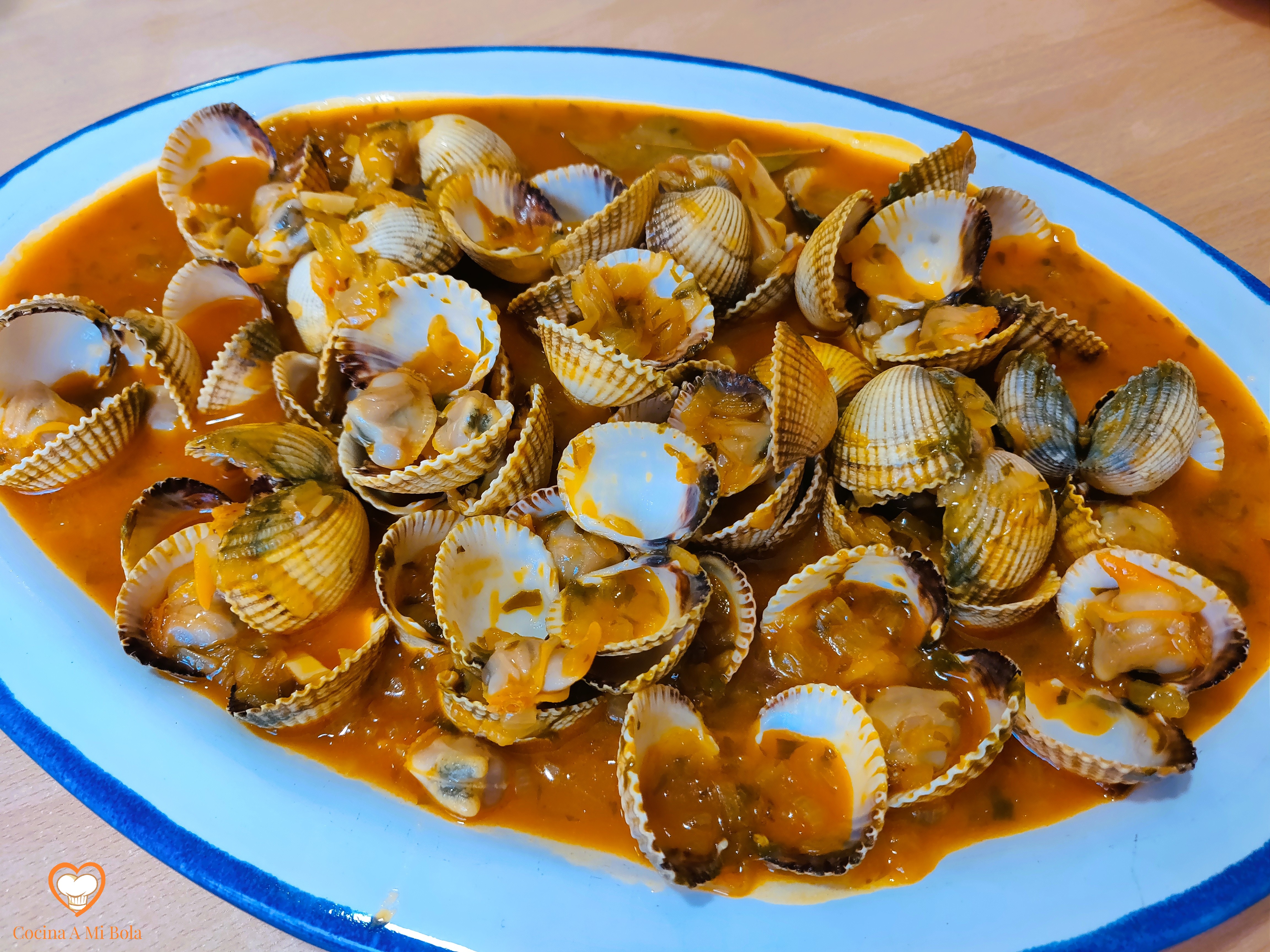 INGREDIENTES: 1 kg de berberechos gallegos, 2 cebollas, 3 dientes de ajo, 1 rama de perejil fresco, 1’5 –2 cucharadas soperas de harina, 250 cc de vino blanco Albariño, aceite de oliva virgen extra, pimienta negra molida, pimentón dulce ahumado, sal y dos hojas de laurel.