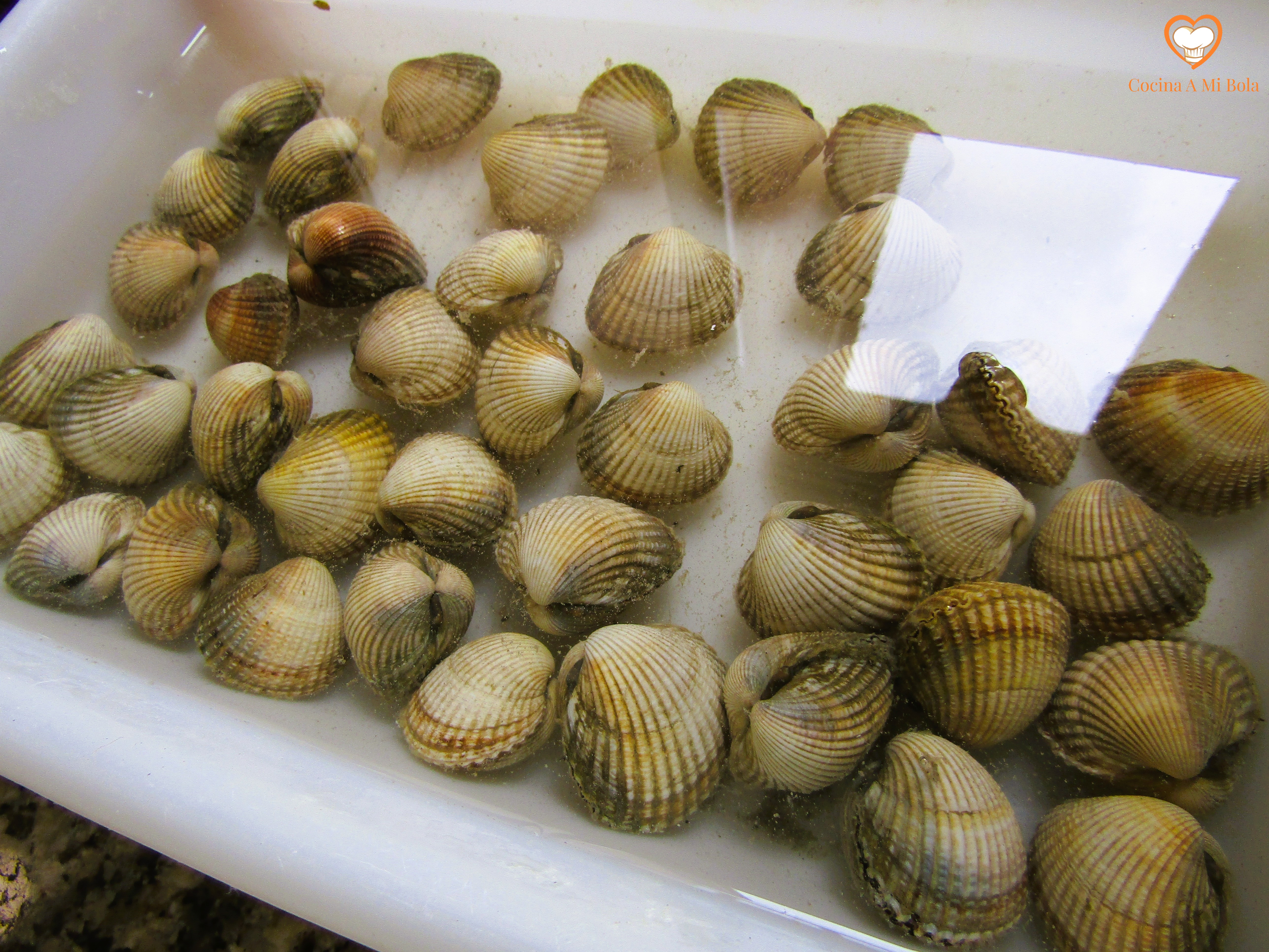 PRIMERO.- Si tienes ocasión y una horilla antes de cocinar, mete los berberechos en un bol con agua y un par de buenos puñados de sal para que filtren un poco la arena o impurezas que pudieran tener.