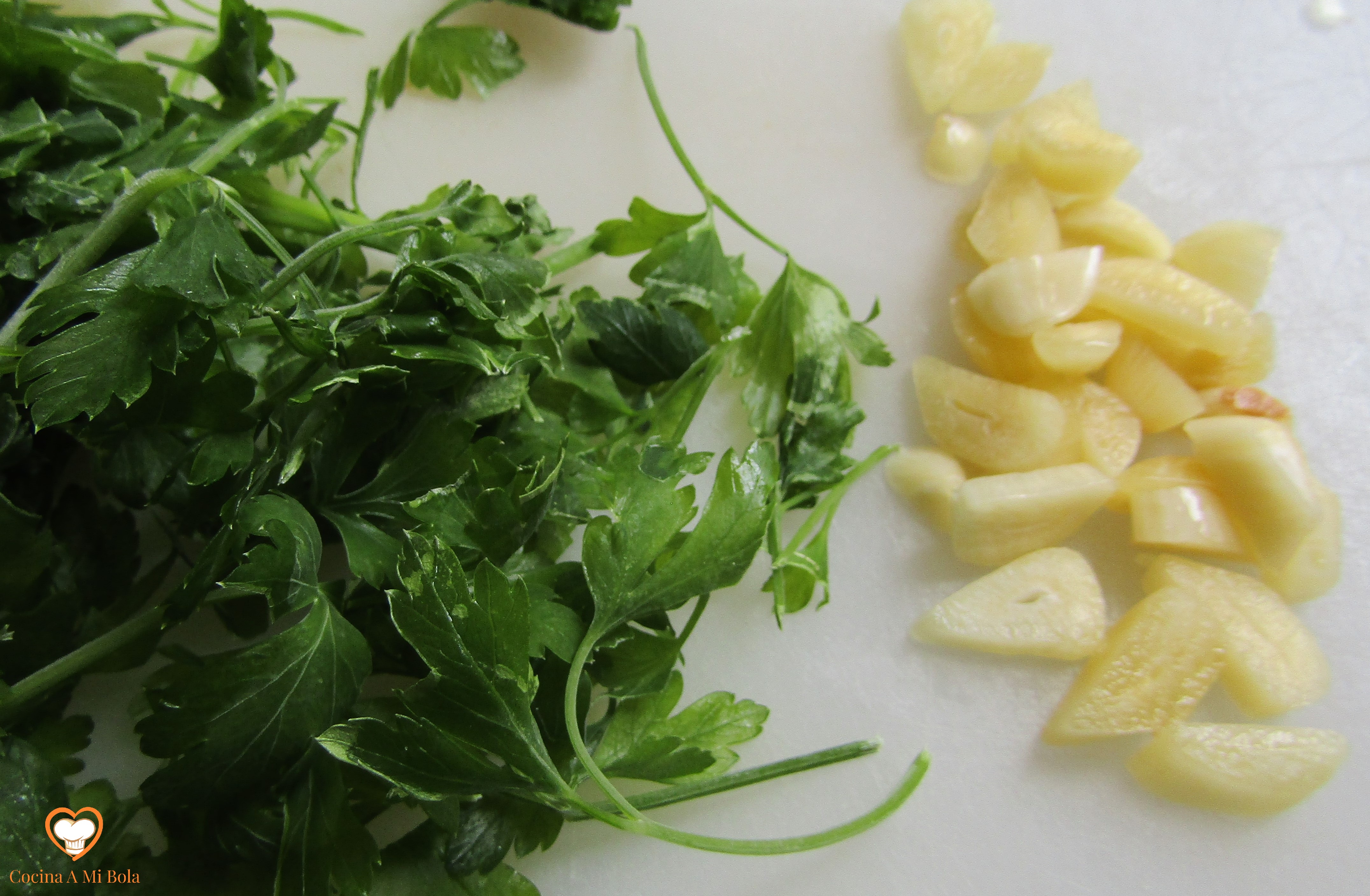 TERCERO.- Ahora pica el perejil, corta los ajos en láminas no muy finas y vuélcalo todo en la sartén. Normalmente, echaríamos el ajo antes pero en este caso, yo prefiero hacerlo en este momento para que quede hecho pero sin que se deshaga o se tueste.